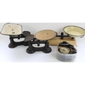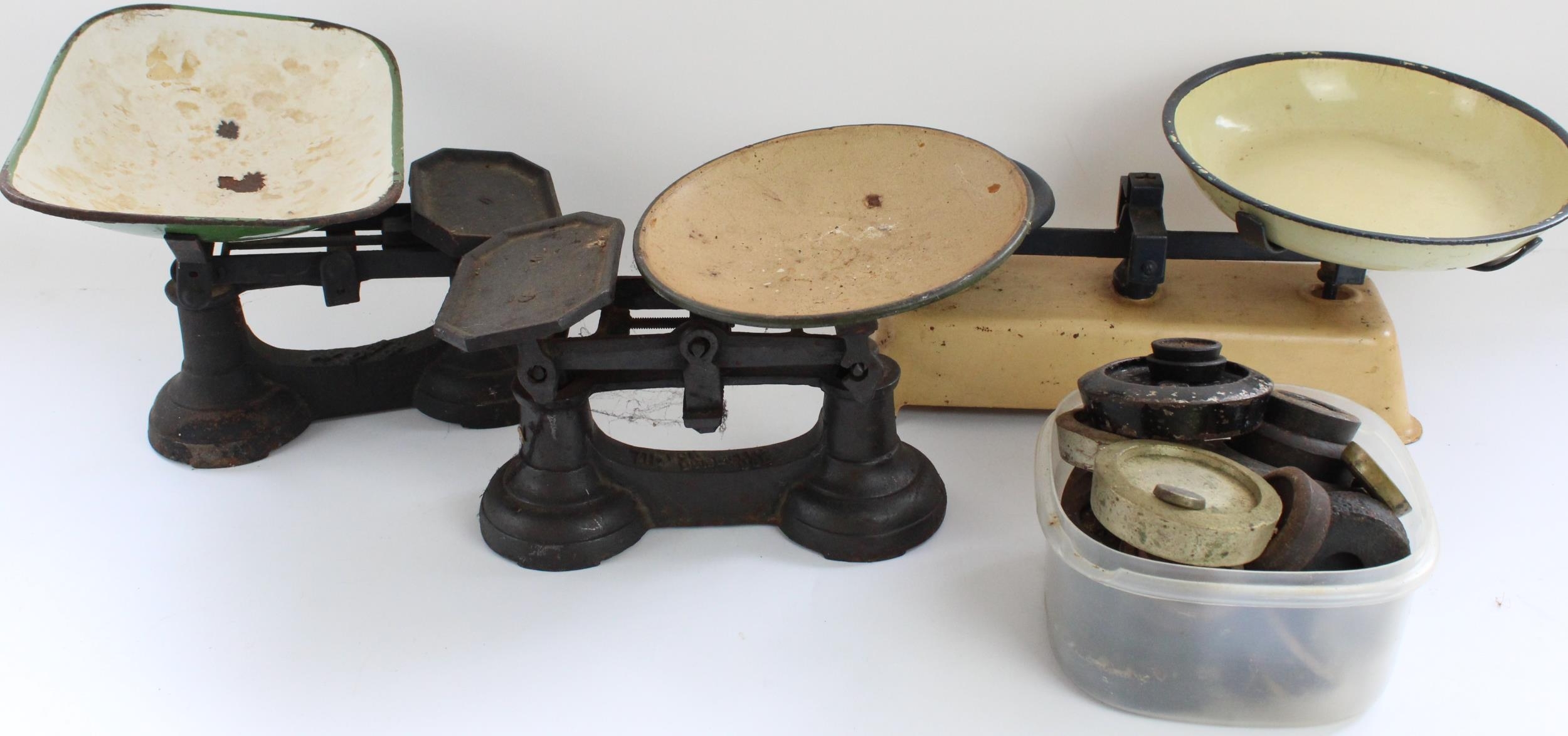 Three sets of vintage cast metal kitchen scales and associated weights