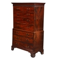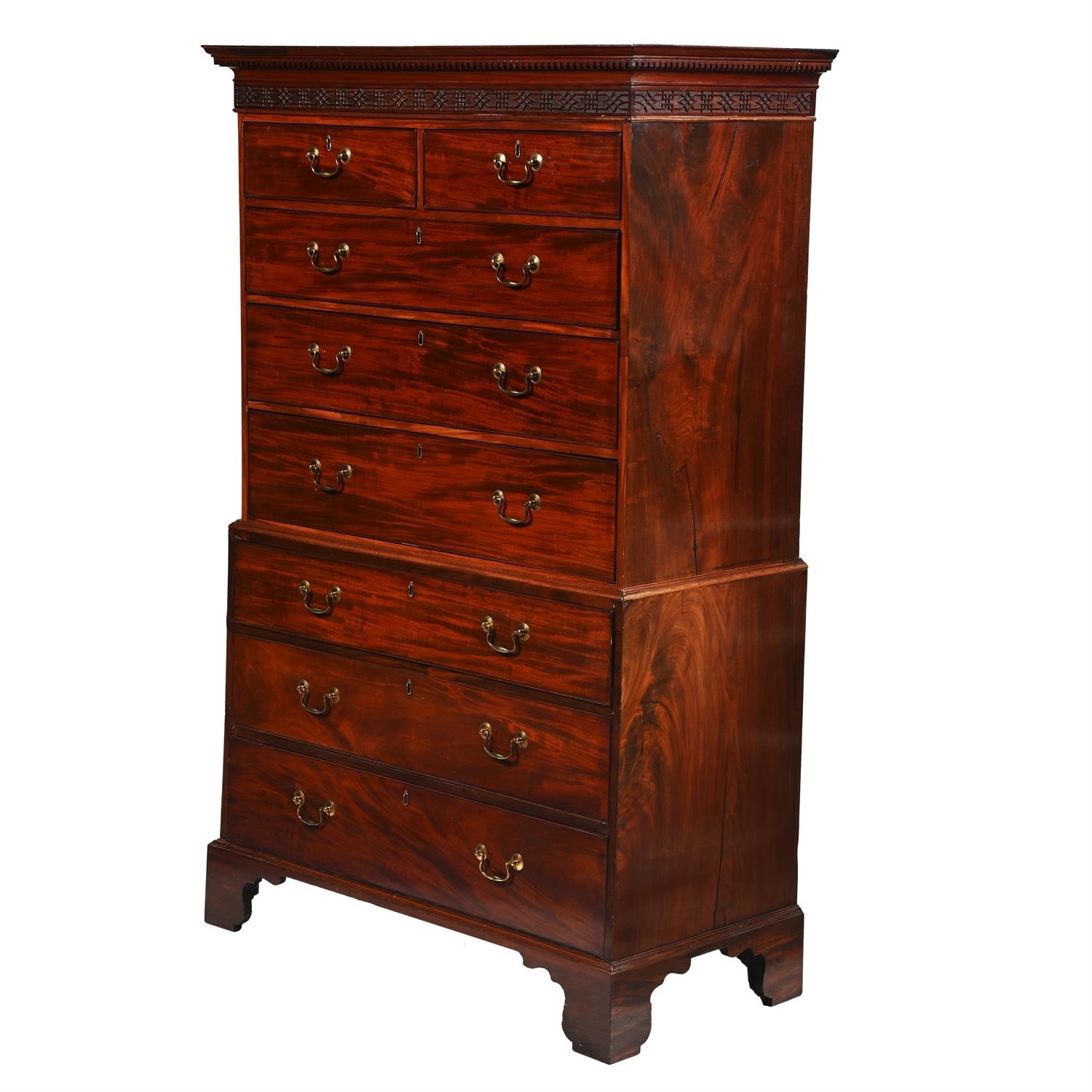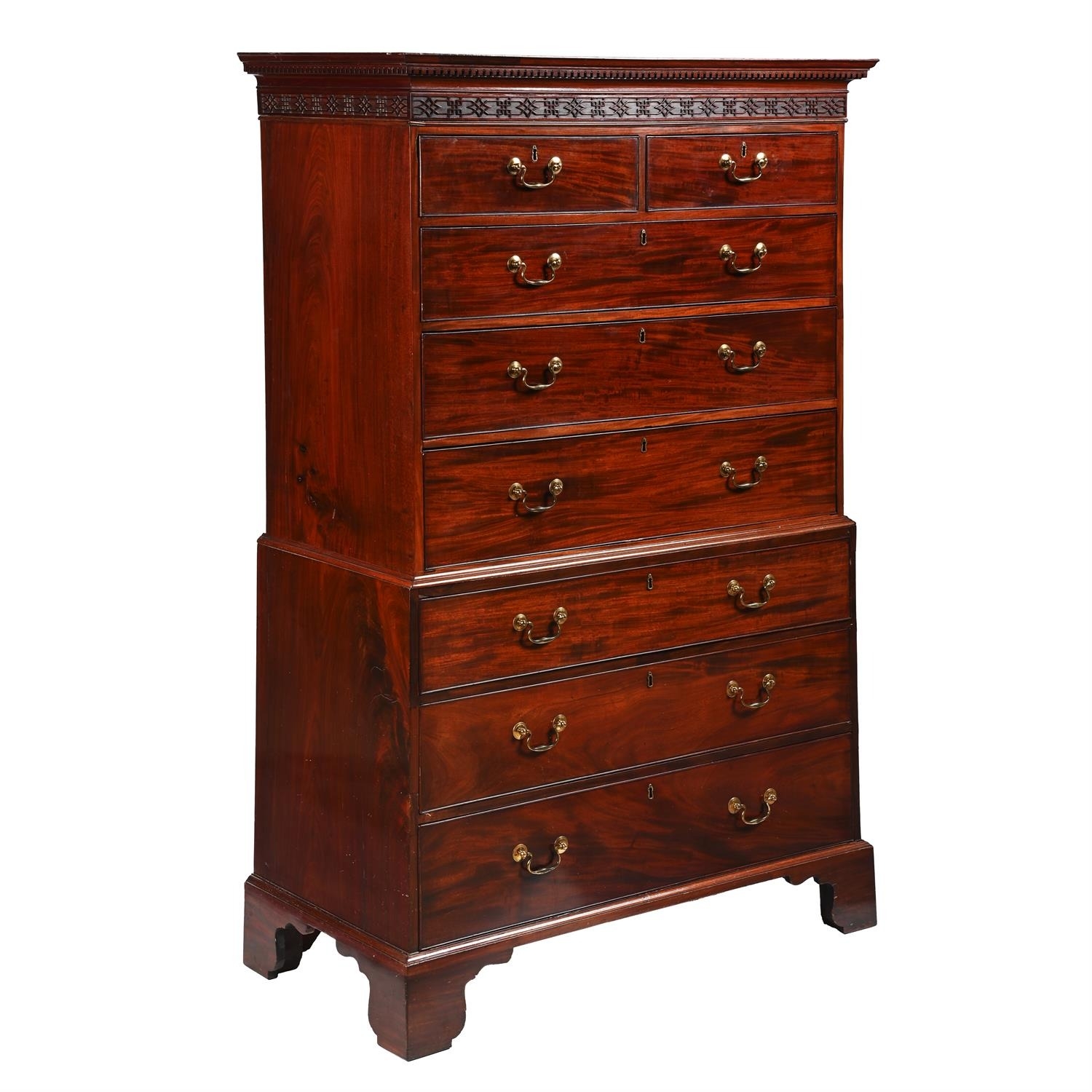 A GEORGE III MAHOGANY CHEST ON CHEST18TH CENTURYWith dentil cornice and blind fret frieze above two short and three long drawers, brass handles, and bracket feet183cm high, 115cm wide, 58cm deep