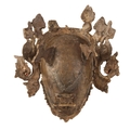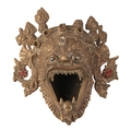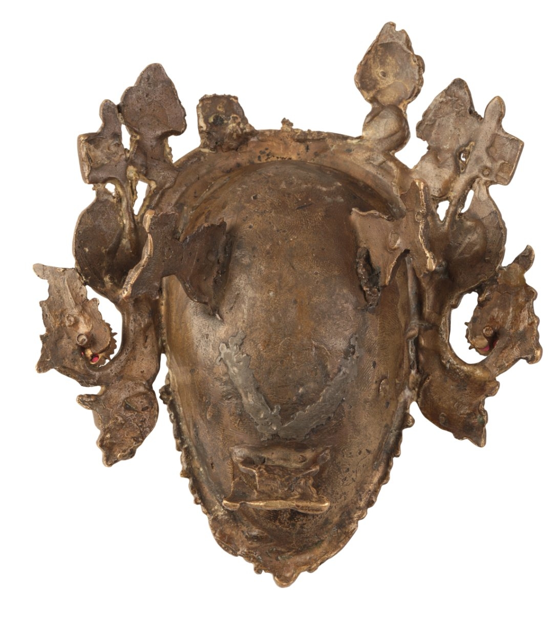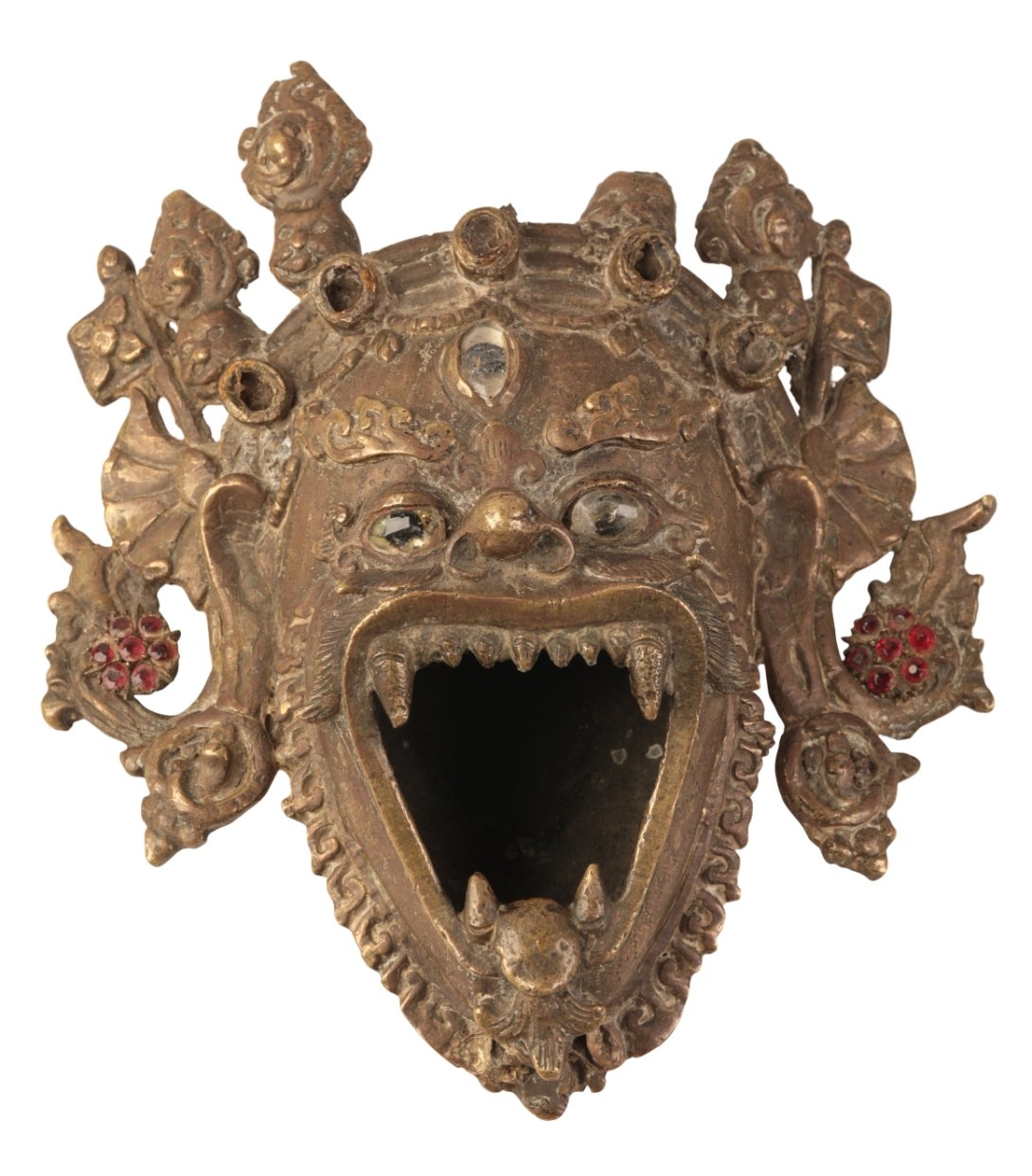 A TIBETAN BRONZE FACE MASK INCENSE BURNERinset with rock crystal and garnets, with gaping mouth and third eye to forehead, 9cm high x 14cm wide x 15.5cm deep