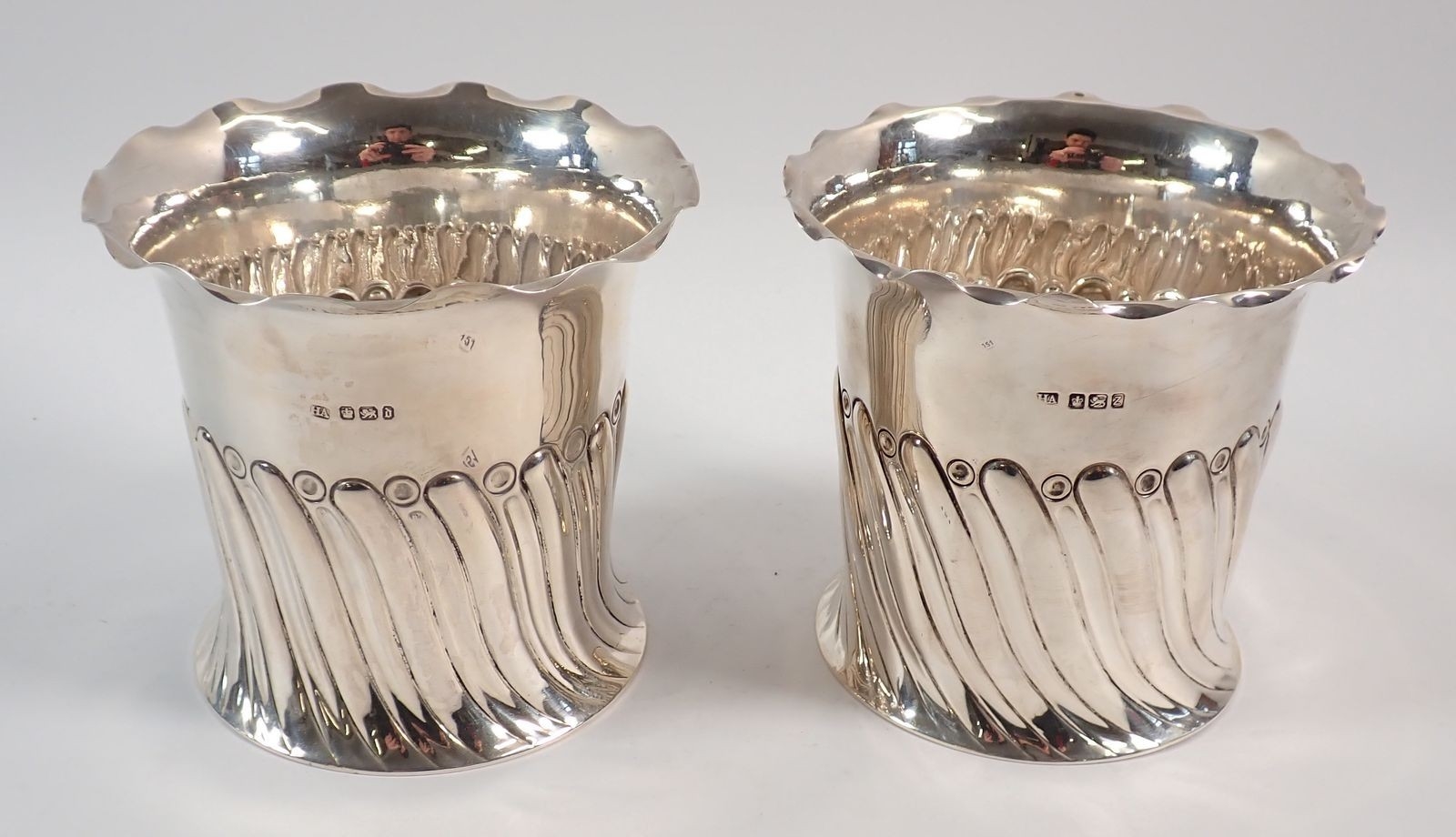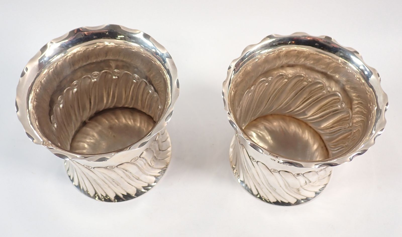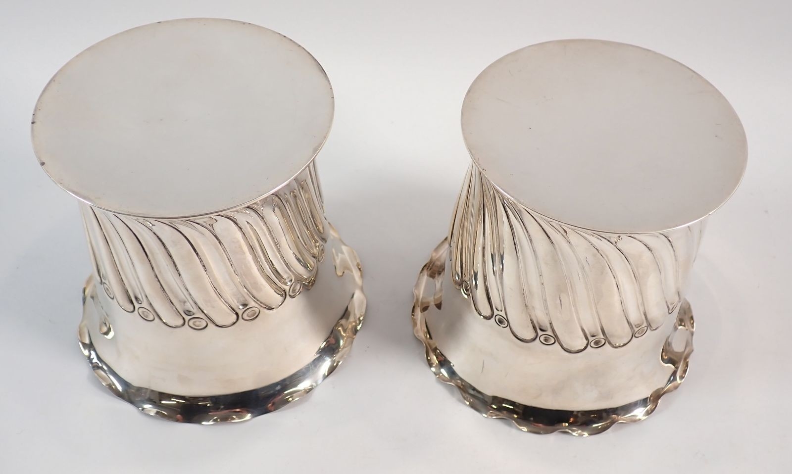A pair of silver spiral gadrooned bottle holders or coasters by Atkin Bros, Sheffield 1892/1896, 11cm tall, 426g