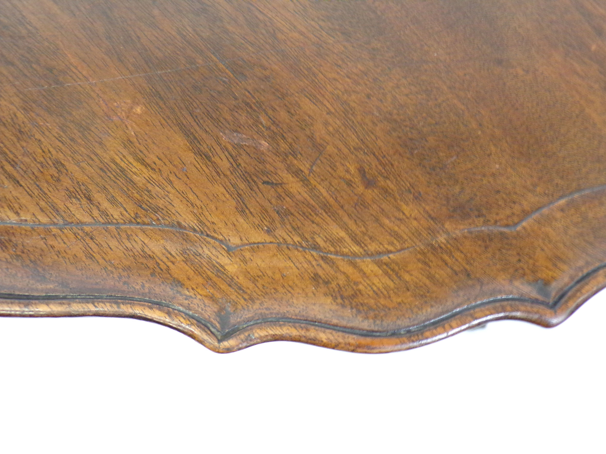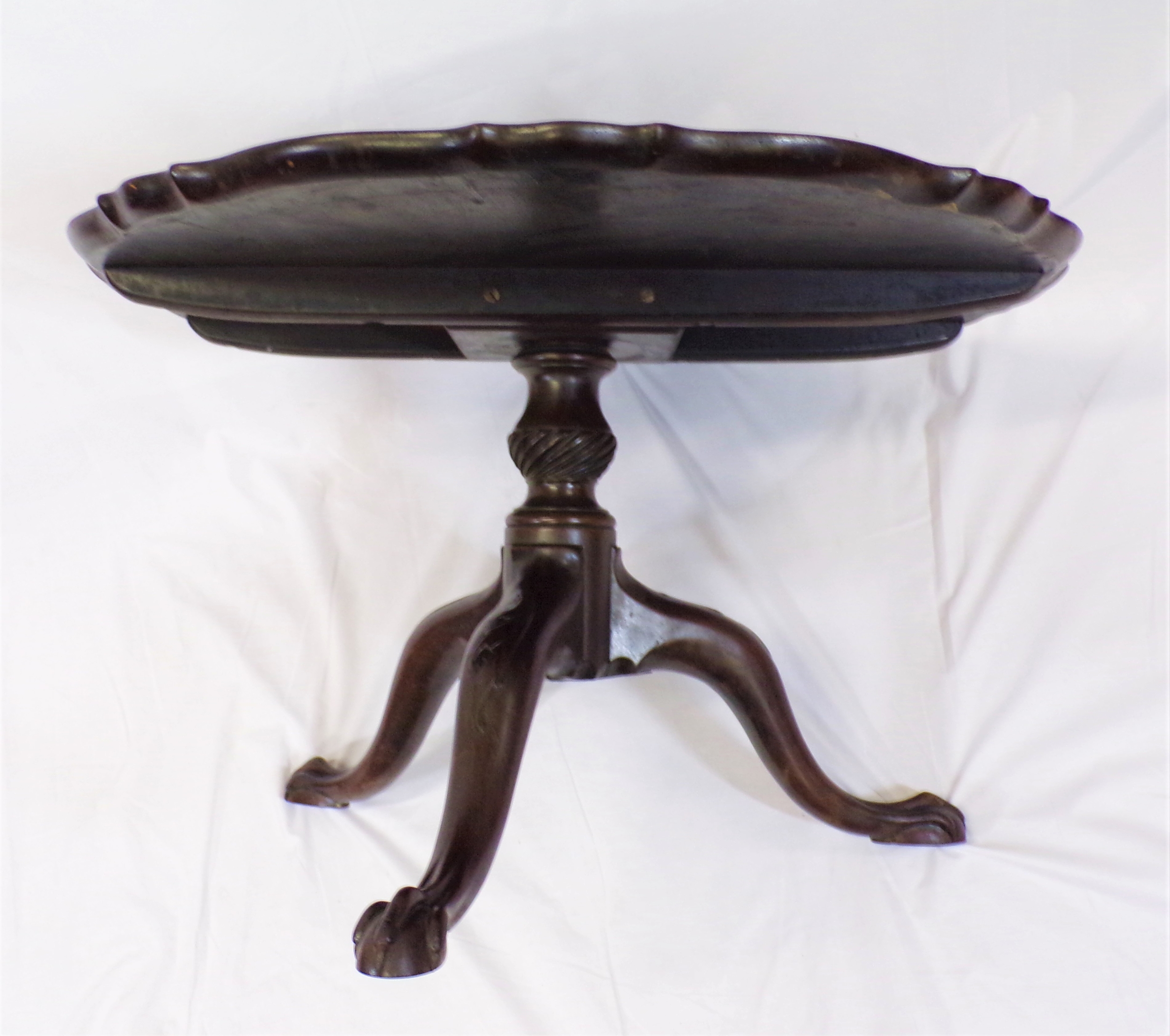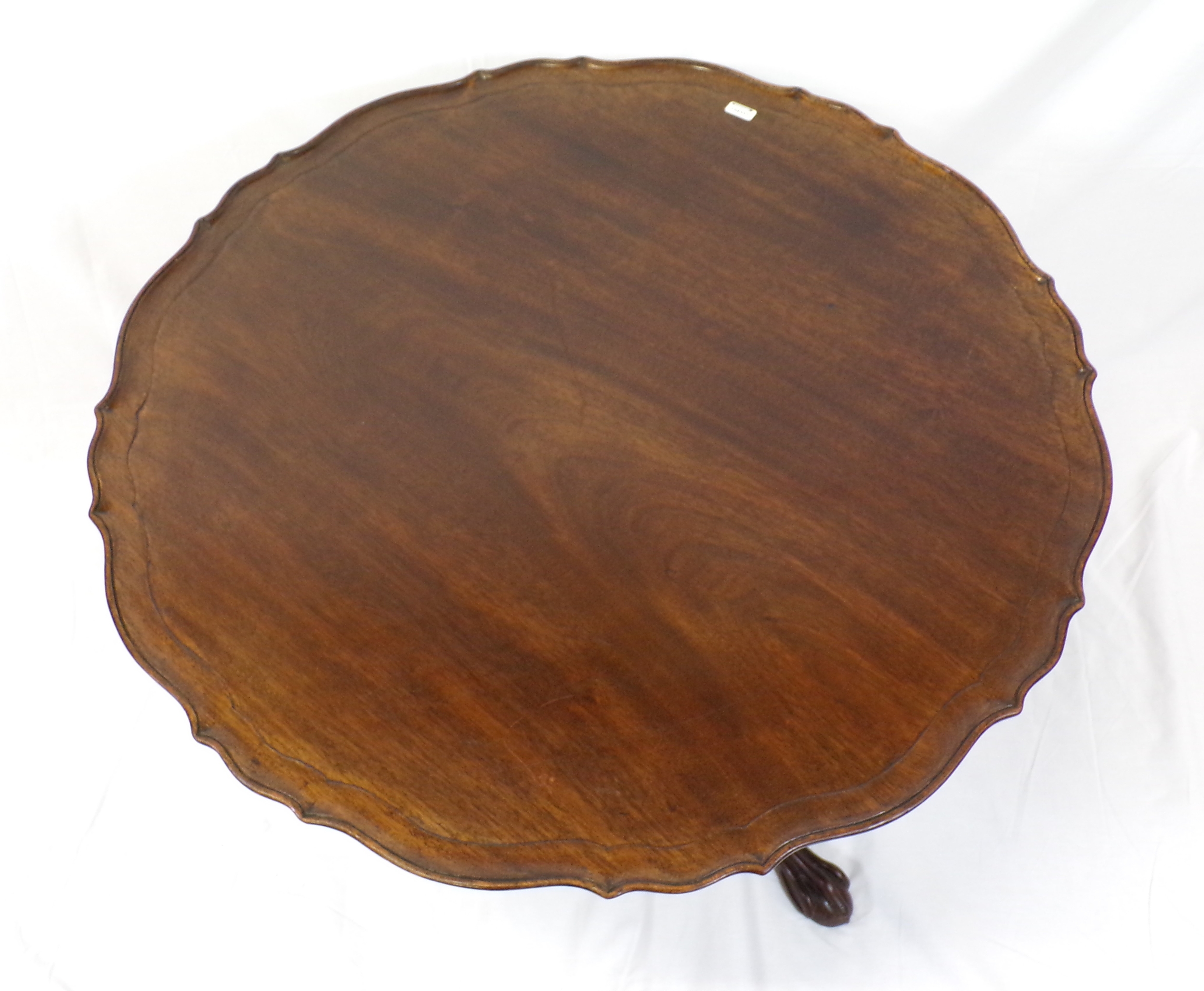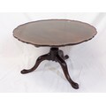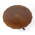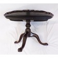 Victorian mahogany round coffee table with piecrust border, reeded vase turned column, on foliate carved tripod, with claw on ball feet