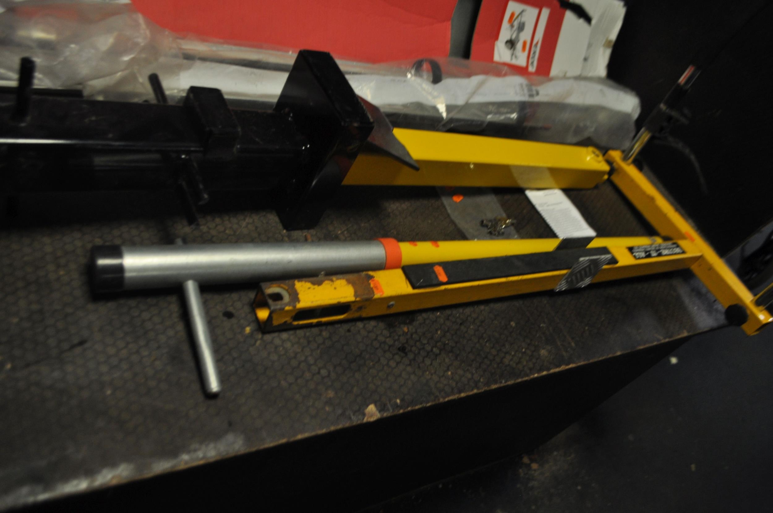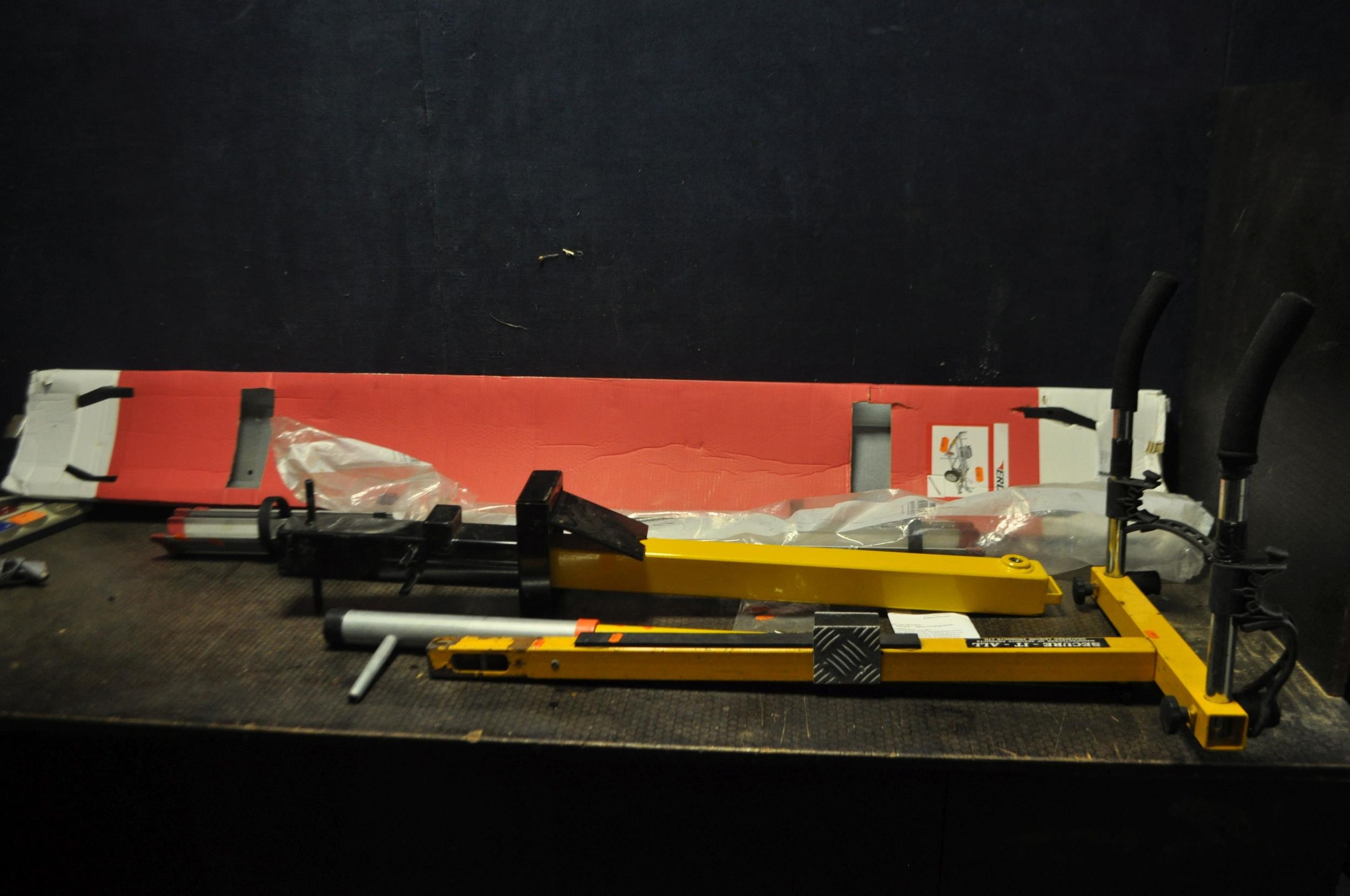 A SELECTION OF VEHICLE SECURITY AND CARRYING EQUIPMENT including a Erde motorcycle trailer skid (no wheel hoop), a Sentinel Freestanding post with three keys to remove from ground, two Framma bicycle skids, etc (5)