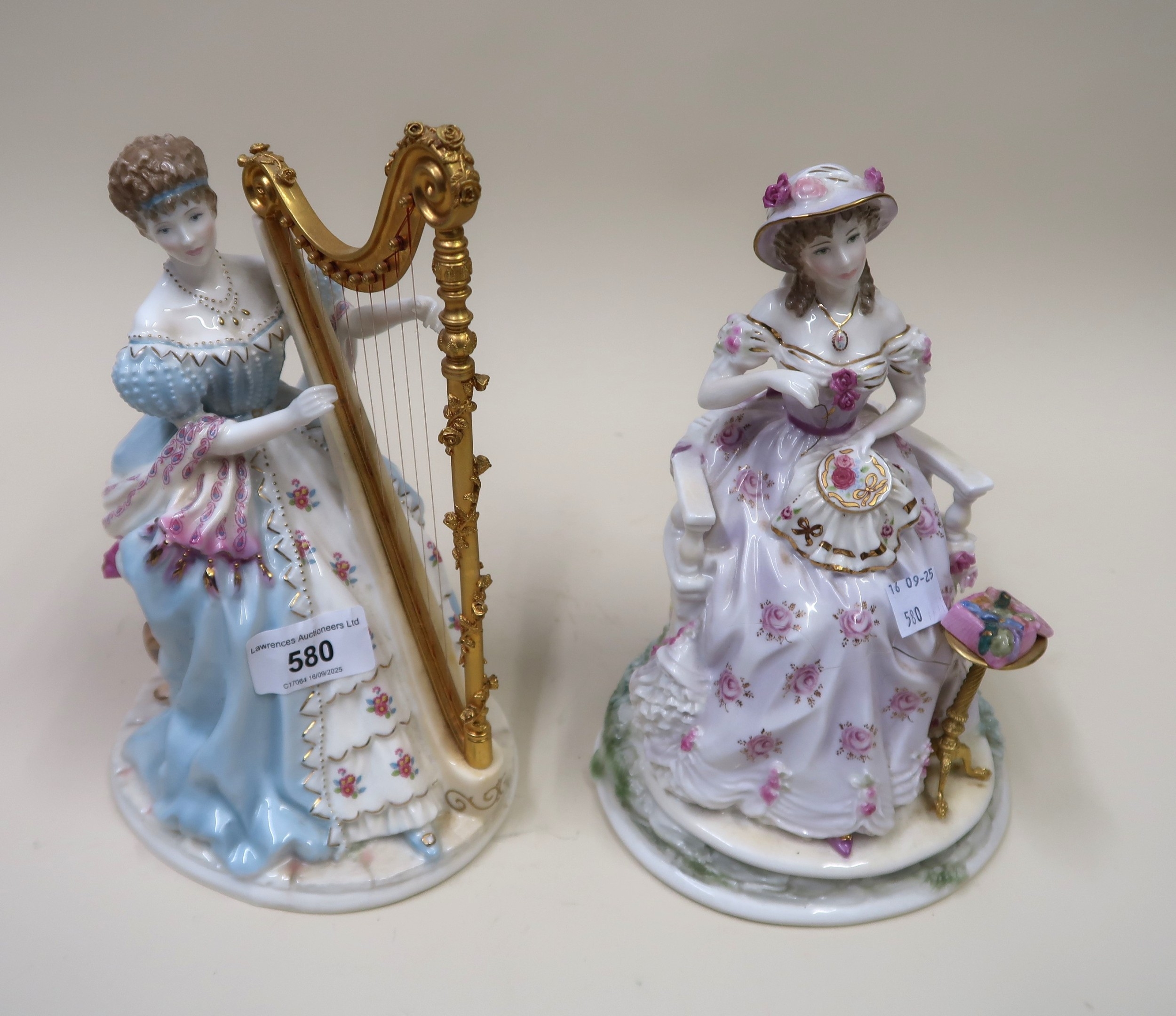 Royal Worcester Limited Edition figure ' The Graceful Arts - Music ' number 1575 of 2500, together with another Royal Worcester figure ' Embroidery ' (at fault)