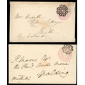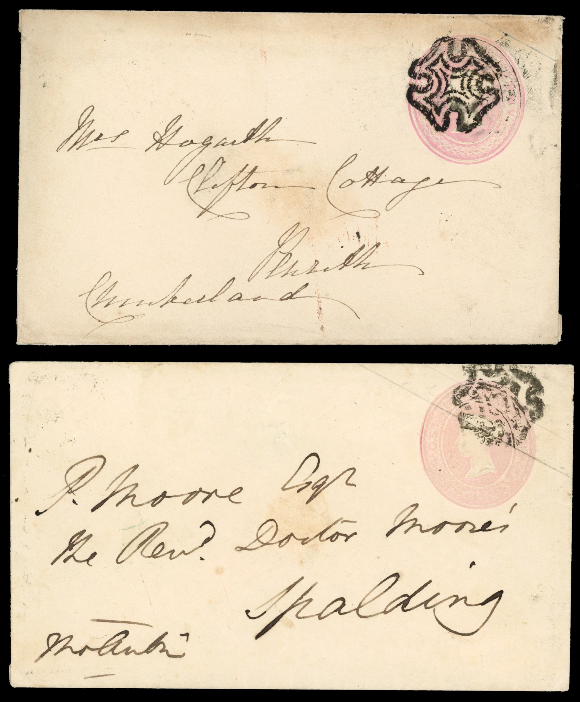 Postal Stationery. 1842 (19 Feb) 1d pink envelope to Penrith bearing fine strike of the distinctive Perth Maltese Cross, backstamped with despatch, Edinburgh transit (19.2) and Penrith arrival (20.2) datestamps and (6 Nov) 1d pink envelope to Spalding cancelled by distinctive Norwich Maltese Cross (type 2), backstamped with despatch and Spalding arrival (7.11) datestamps. Fair to fine. (2)