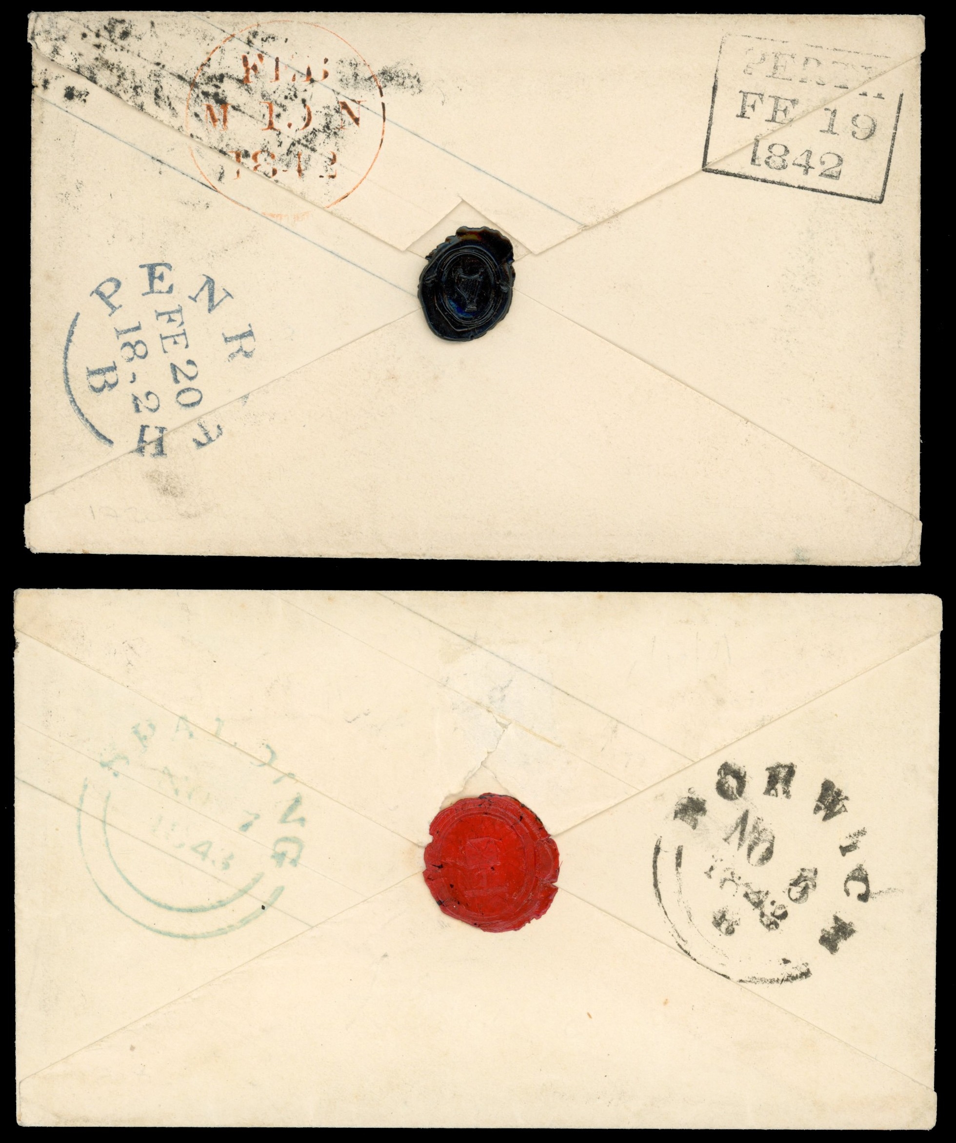 GB 1842 pair 1d postal stationery envelopes cancelled by distinctive Perth and Norwich Maltese Crosses