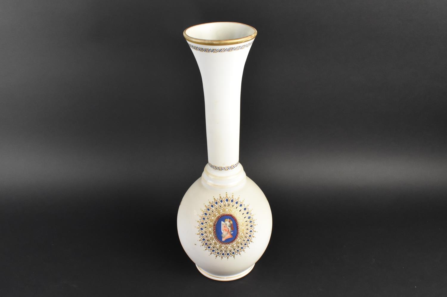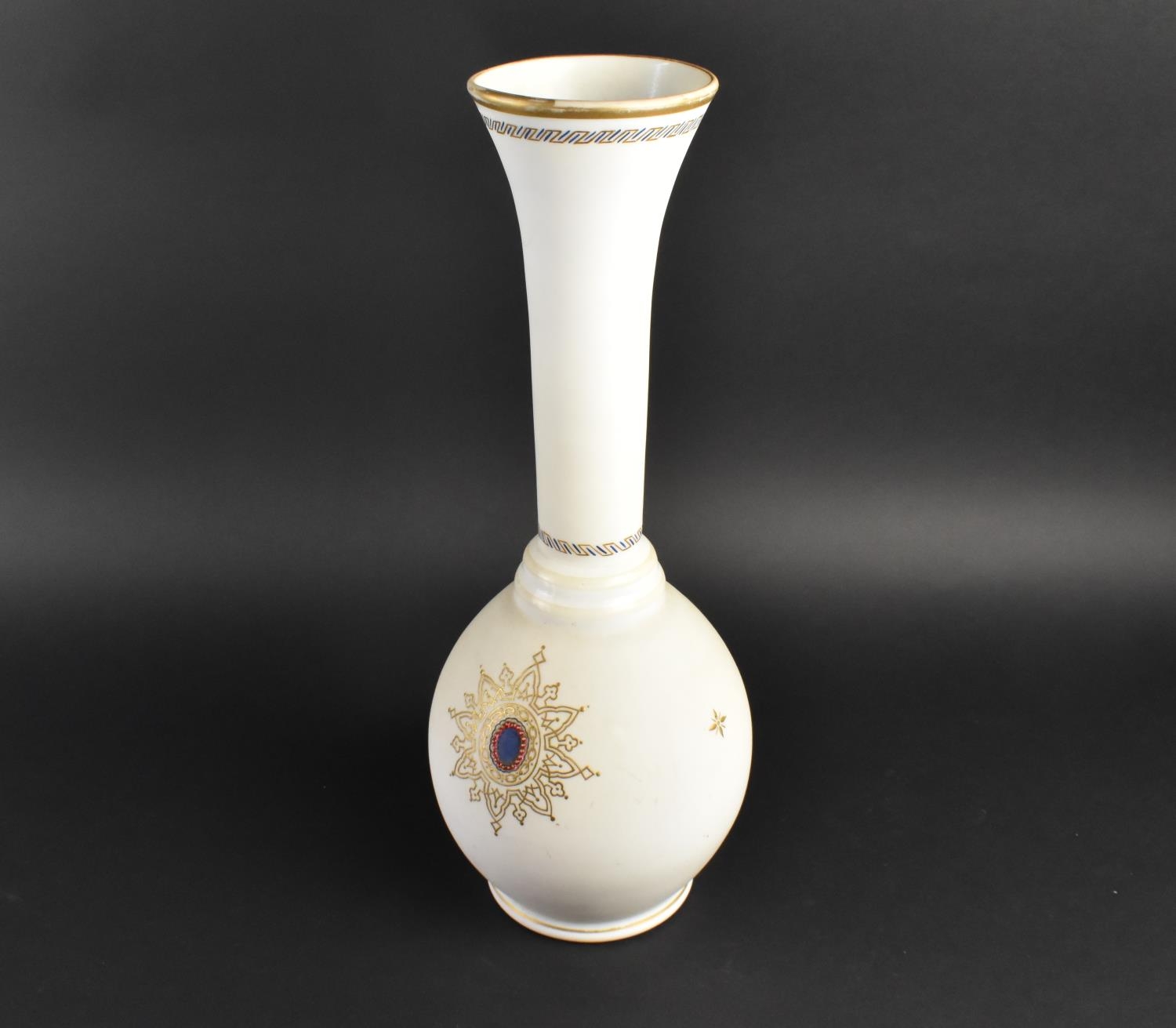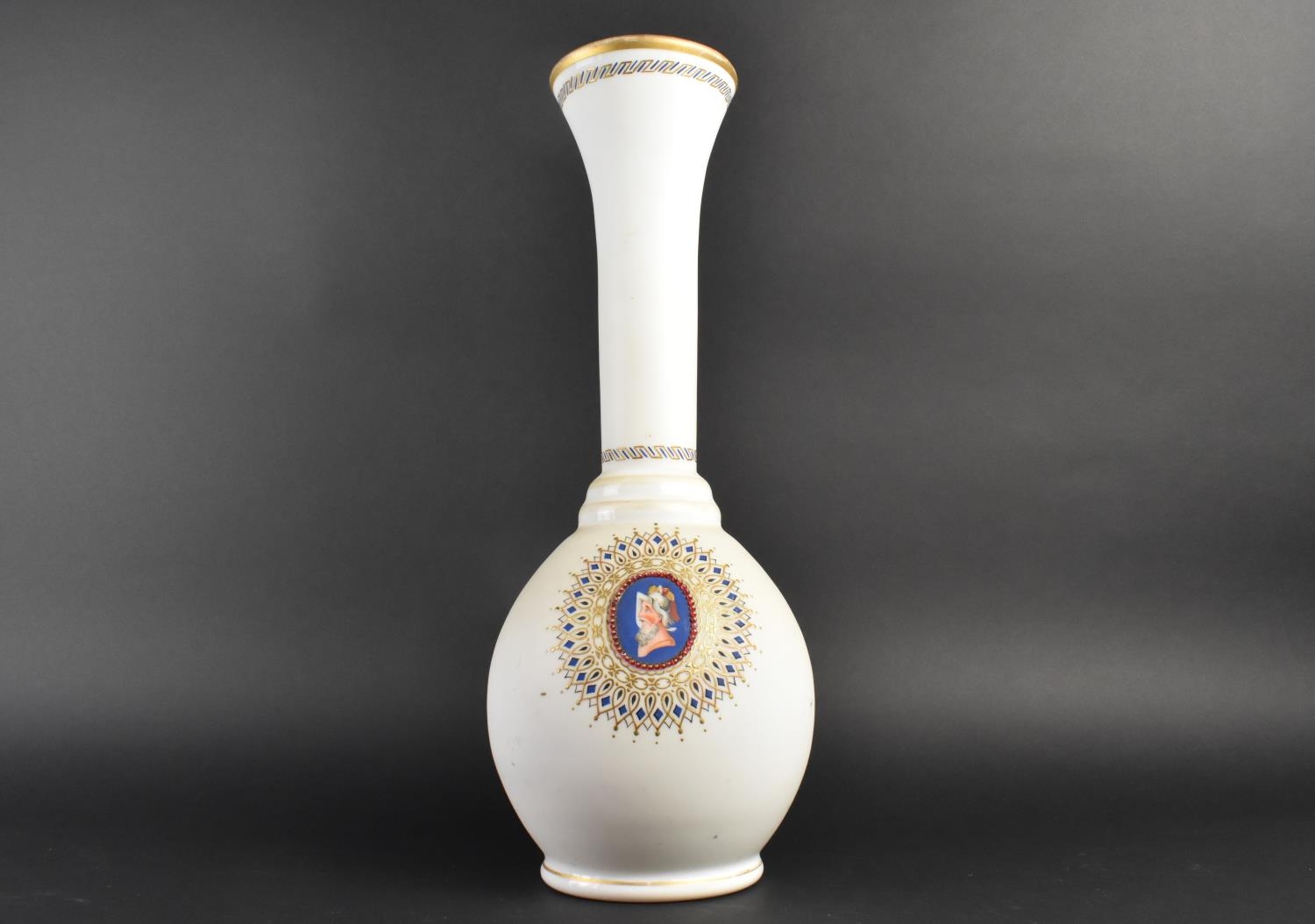 An Edwardian Oak Cased Glass Long Necked Vase, 42cms High