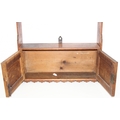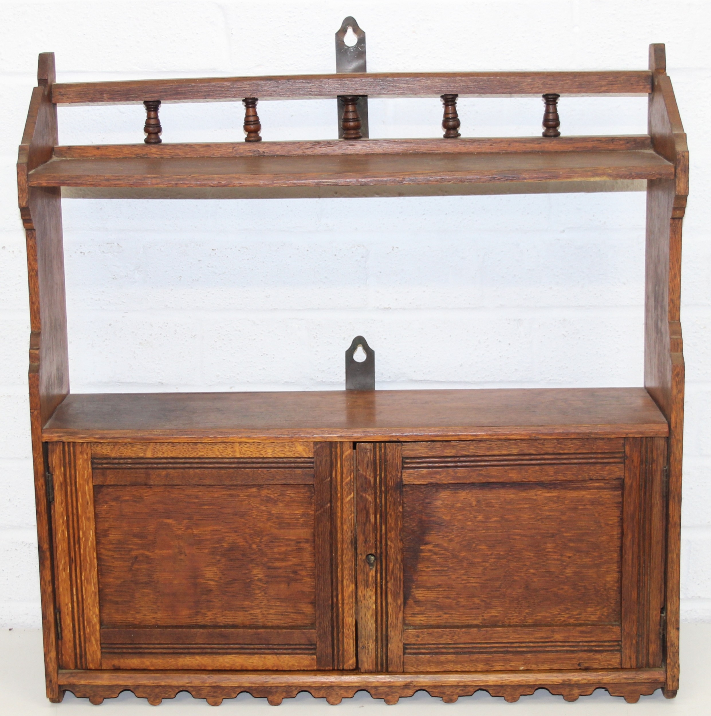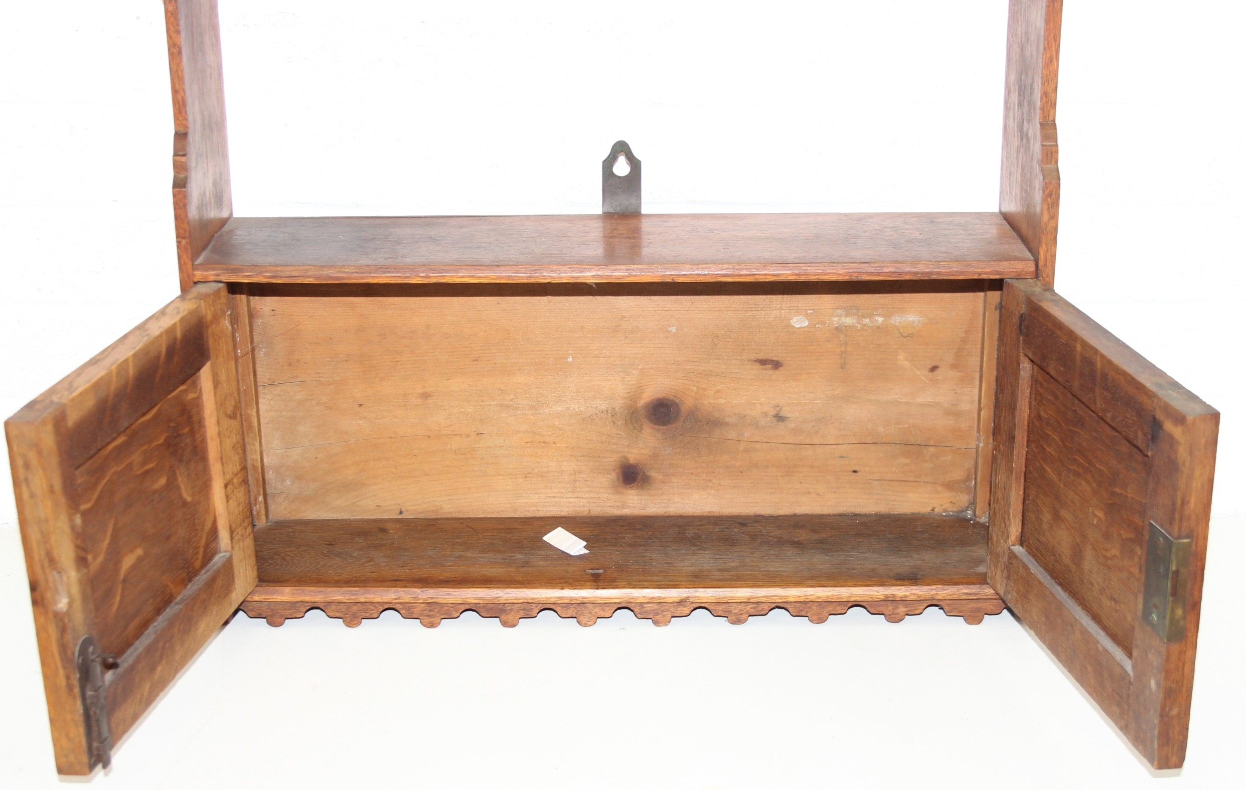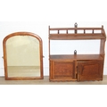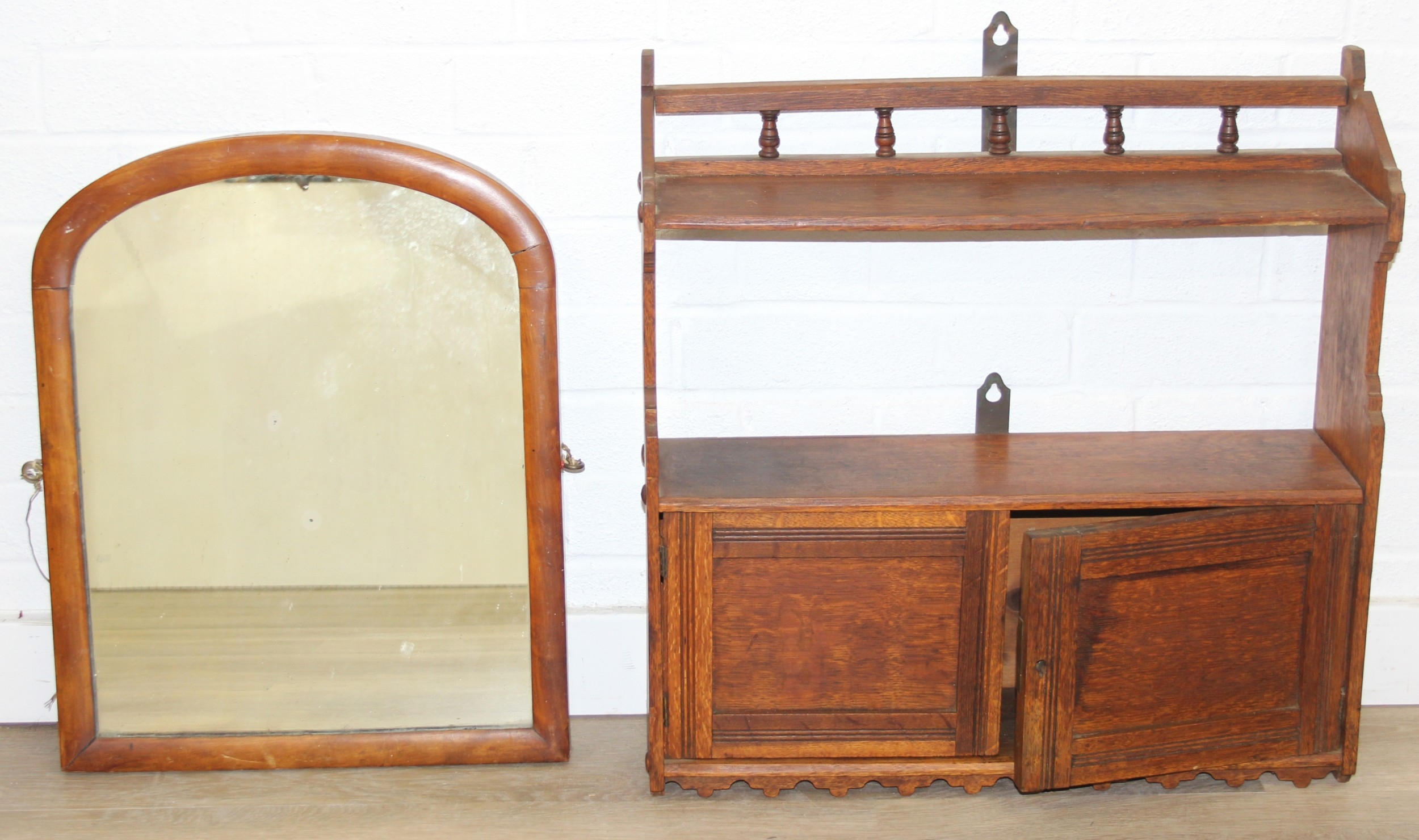 A small oak wall mounted cupboard and shelf unit, early 20th century, 58cm x 15cm x 60cm and a wall mirror with mahogany frame [2]