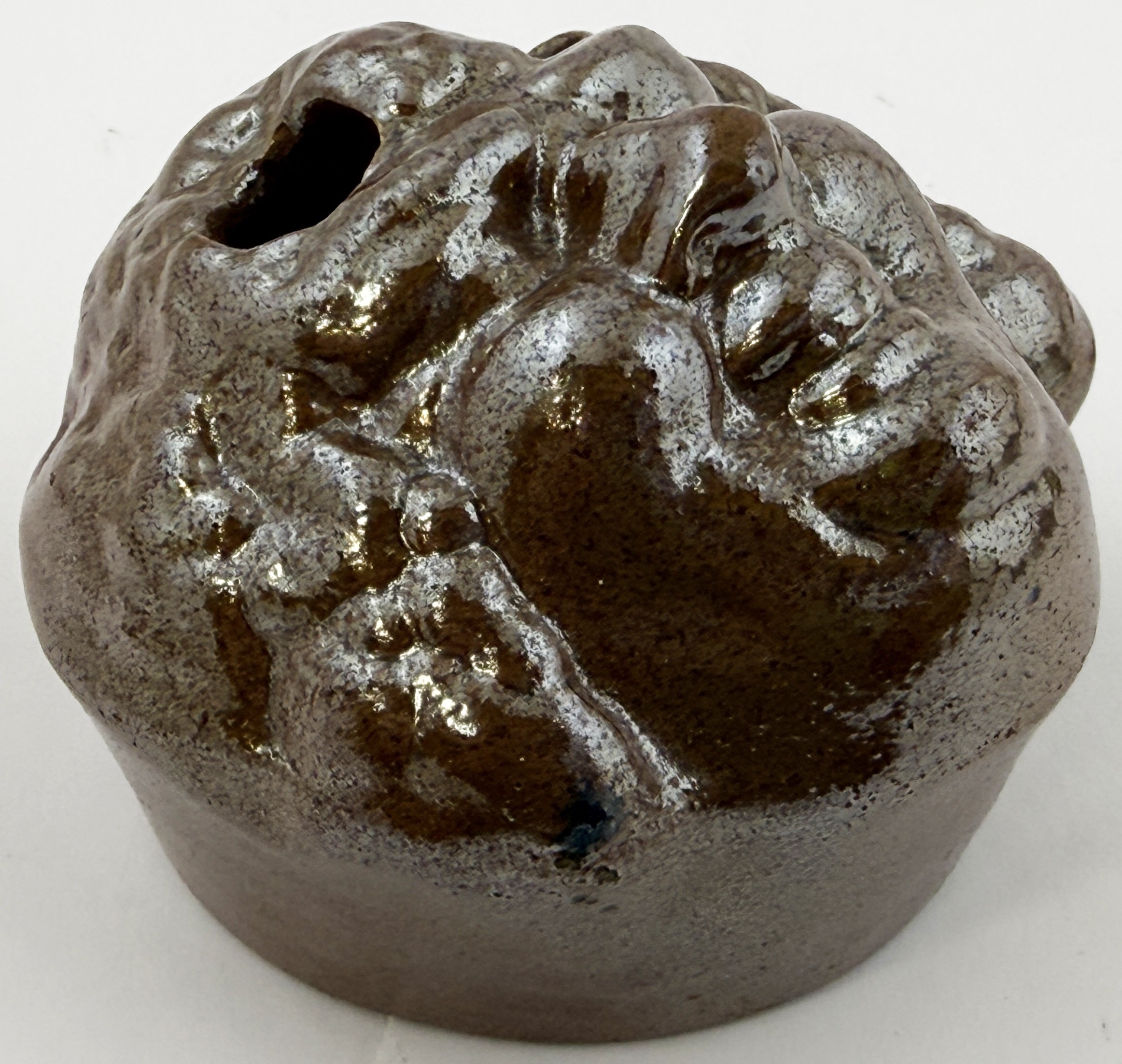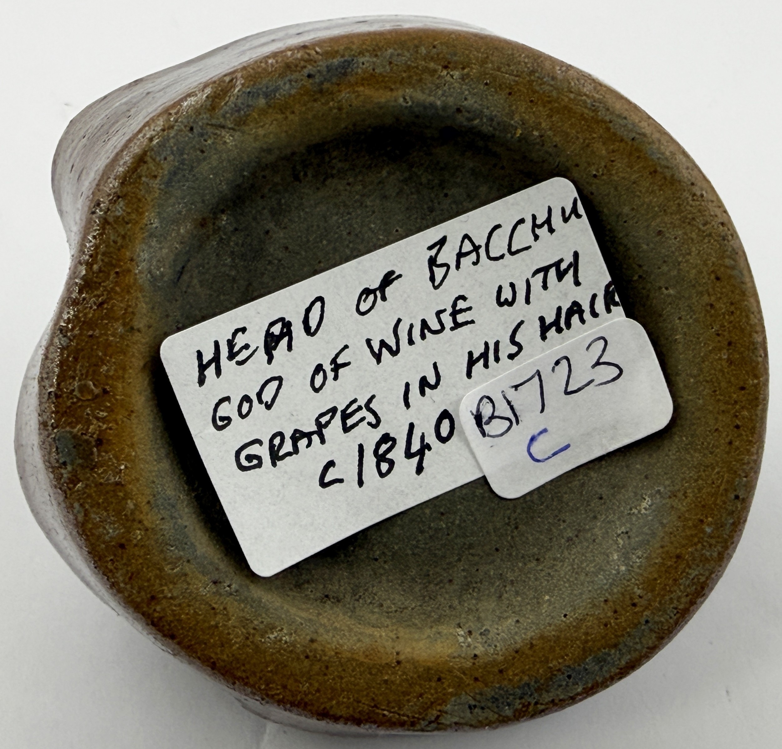 BACCHUS HEAD INK BOTTLE. 2.4ins tall. Shiny salt glaze ink modelled as Bacchus, Roman God of wine. Two quill holes to head. Excellent condition.