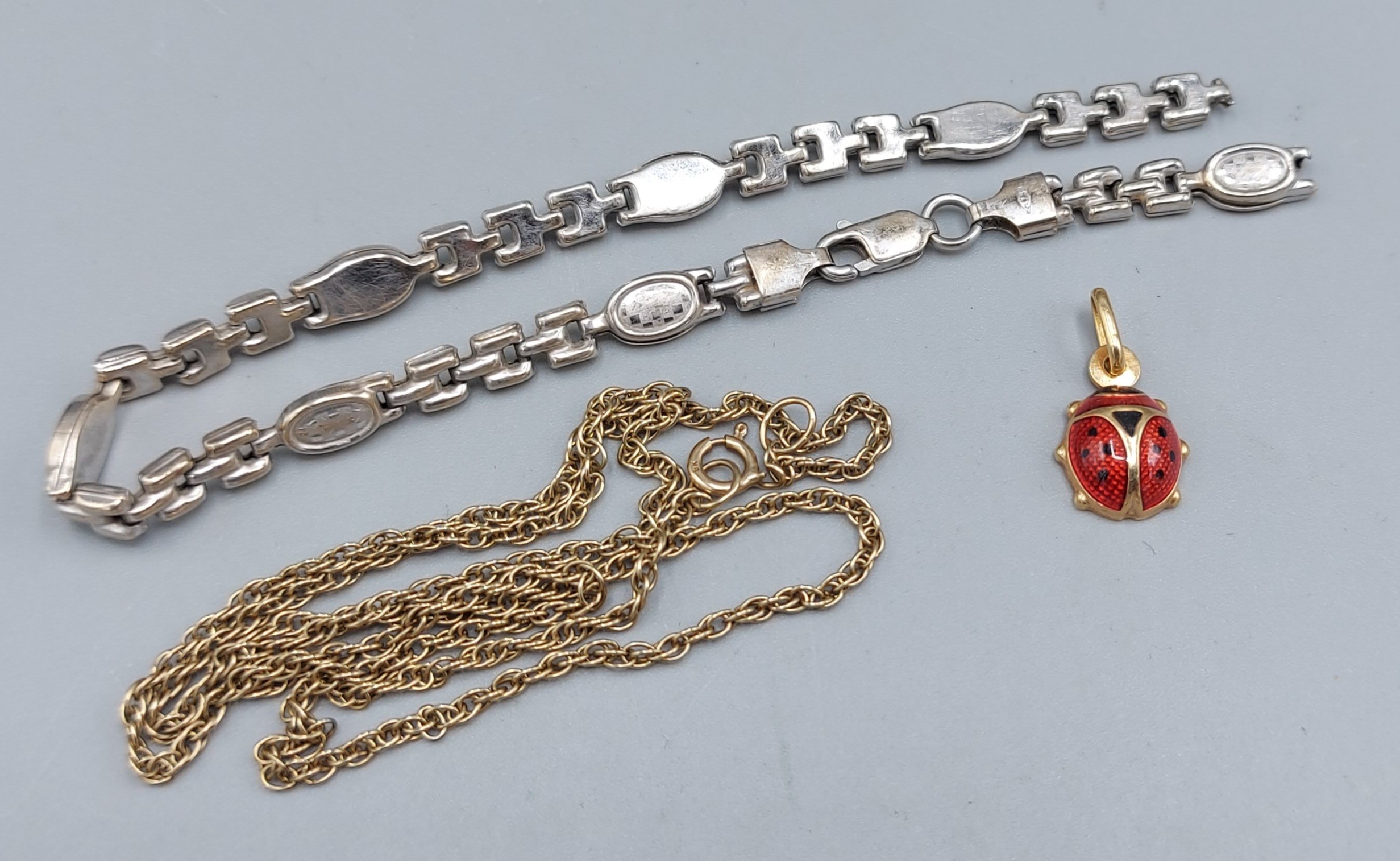 A 9ct gold bracelet, a 9ct gold linked chain and a 9ct gold pendant, 8.2gms