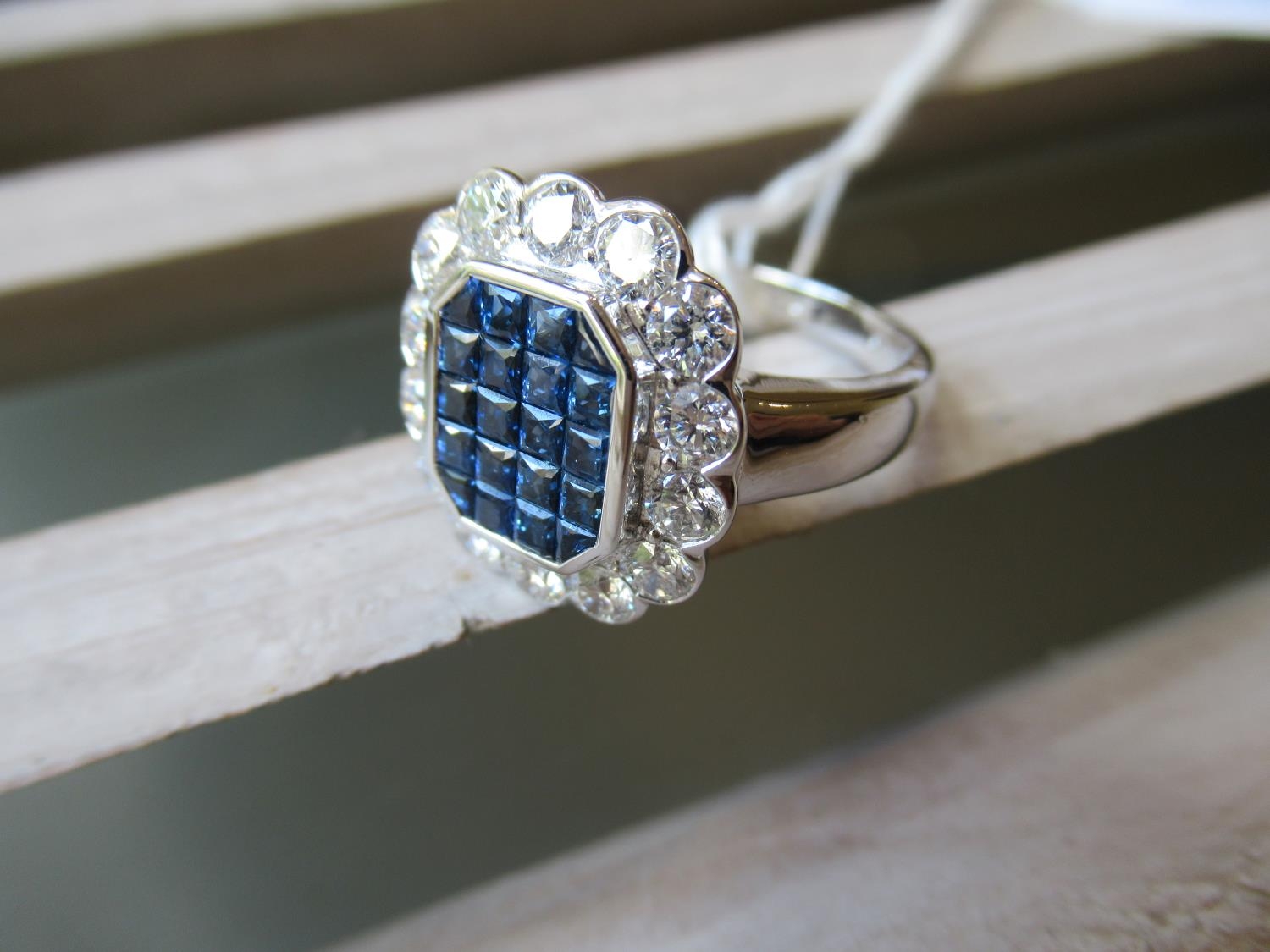 18ct White gold ring set multiple sapphires surrounded by brilliant cut diamonds
