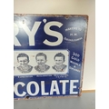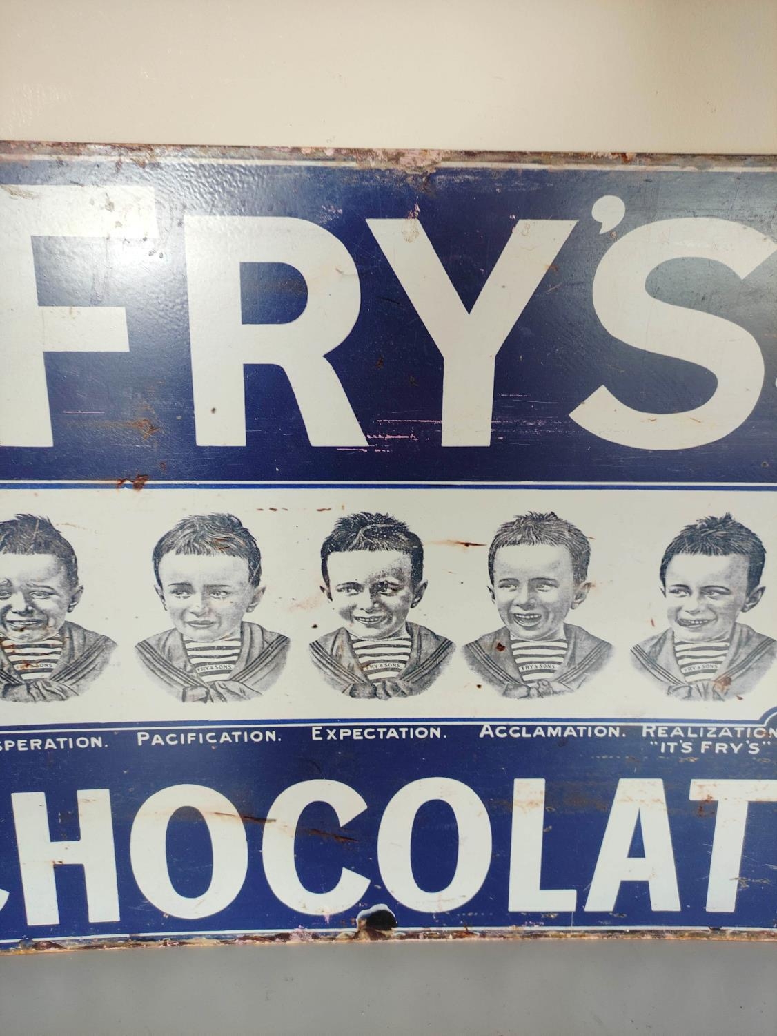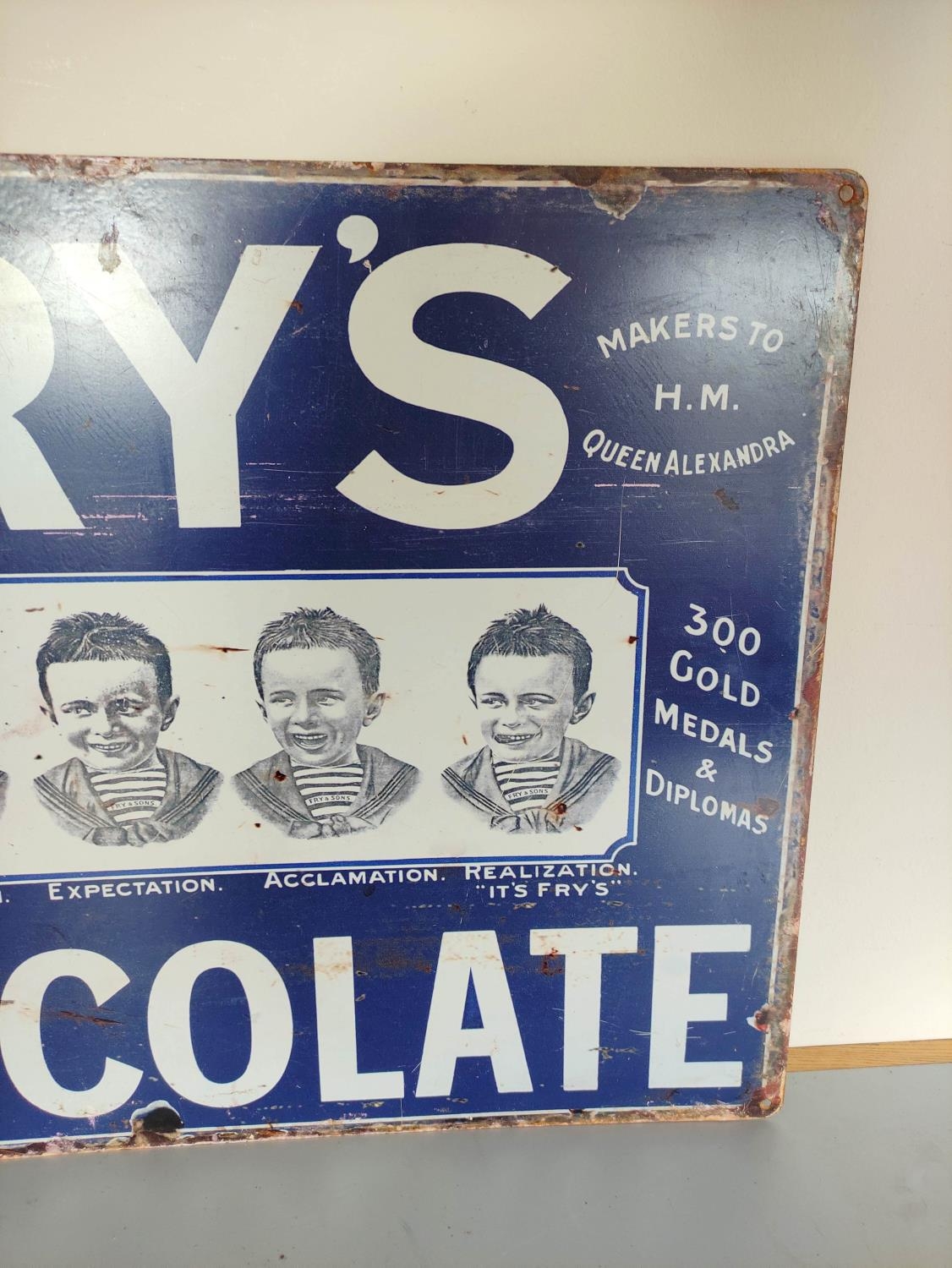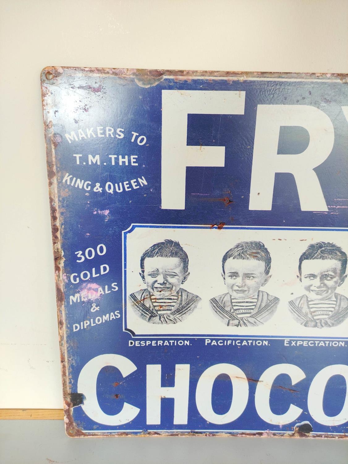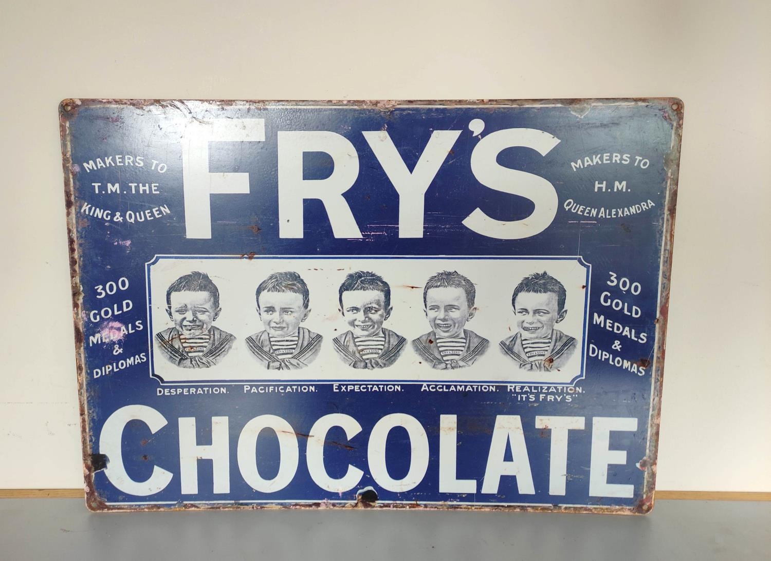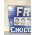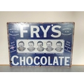 Large reproduction printed enamel advertising sign for Fry's Five Boys Chocolates. Featuring the five boys of desperation, pacification, expectation, acclamation and realisation it's Fry's! surrounded by company text. 50cm x 70cm
