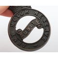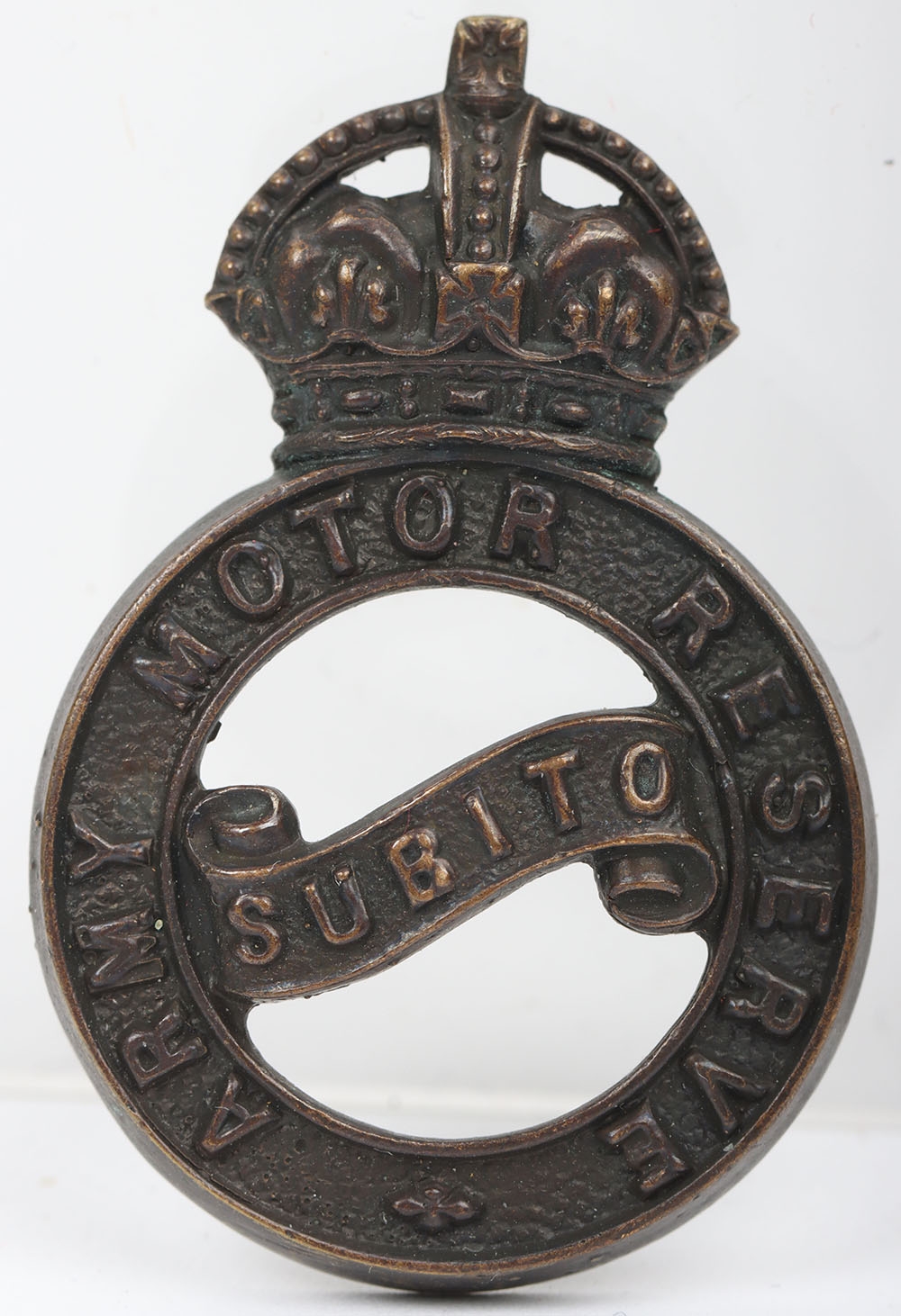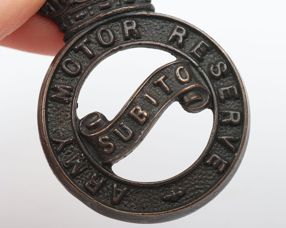 Army Motor Reserve Officers Cap Badge, fine bronze example of the crowned circlet with ‘ARMY MOTOR RESERVE’ within and central scroll having motto ‘SUBITO’. Two lug fittings to the reverse.