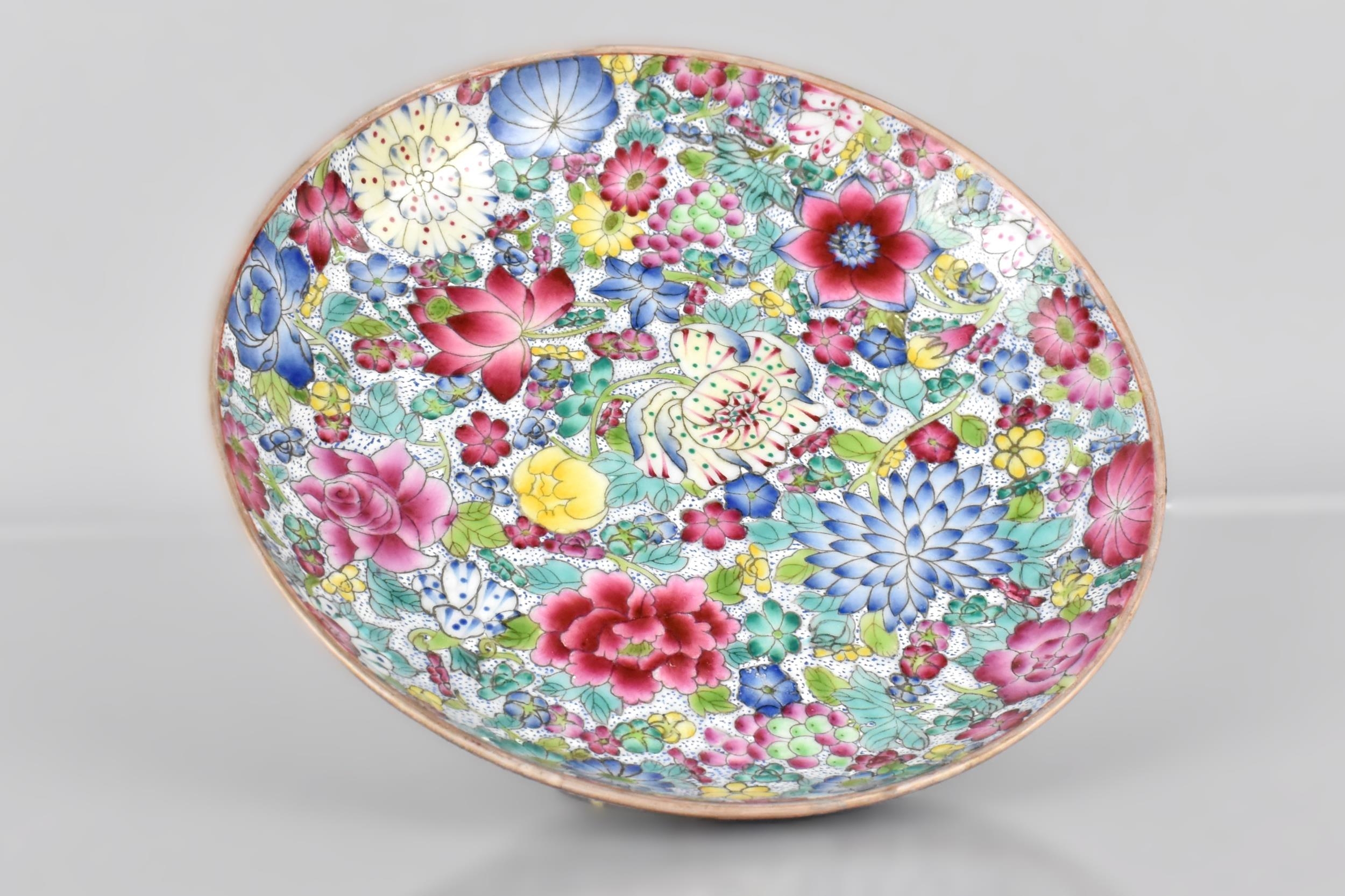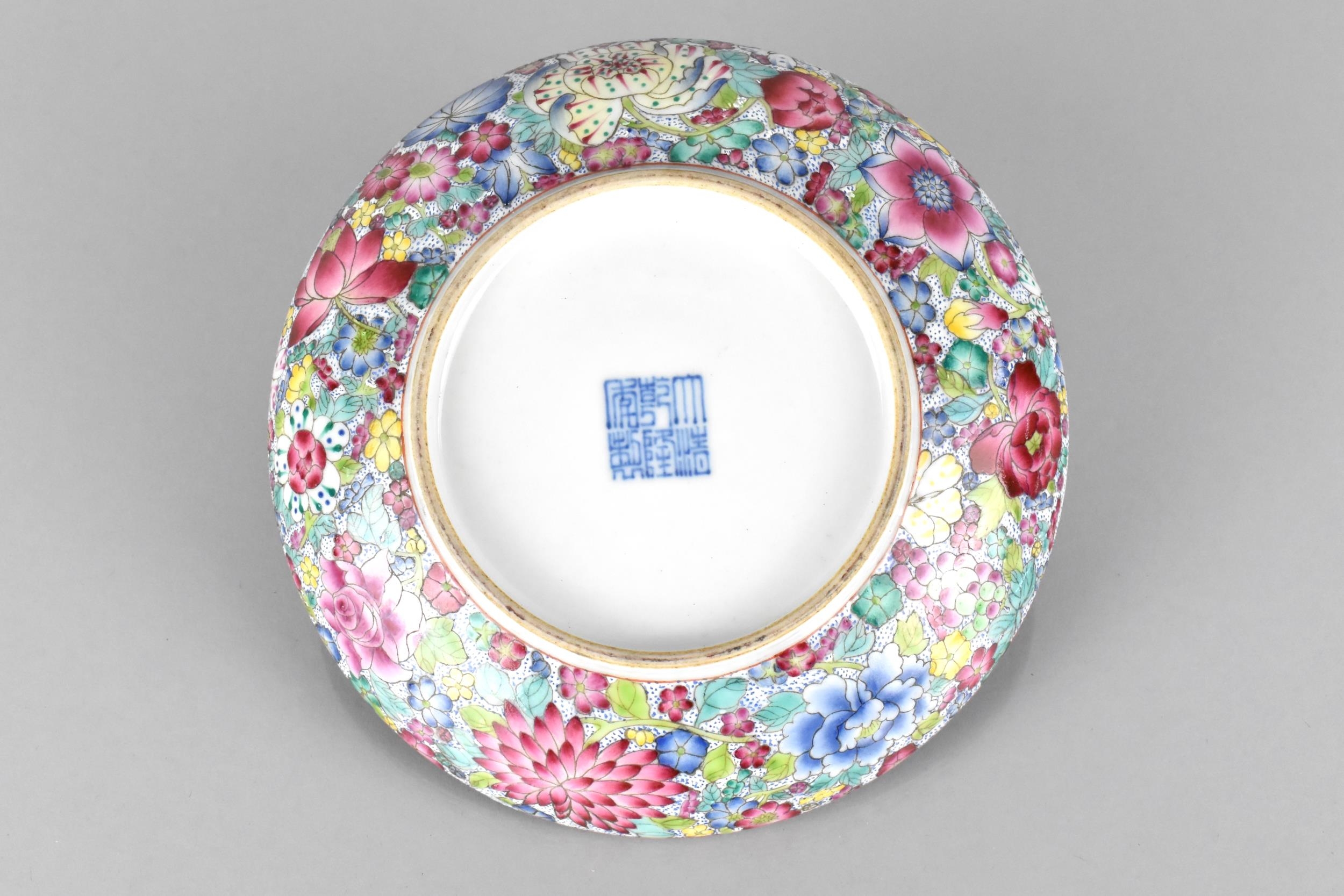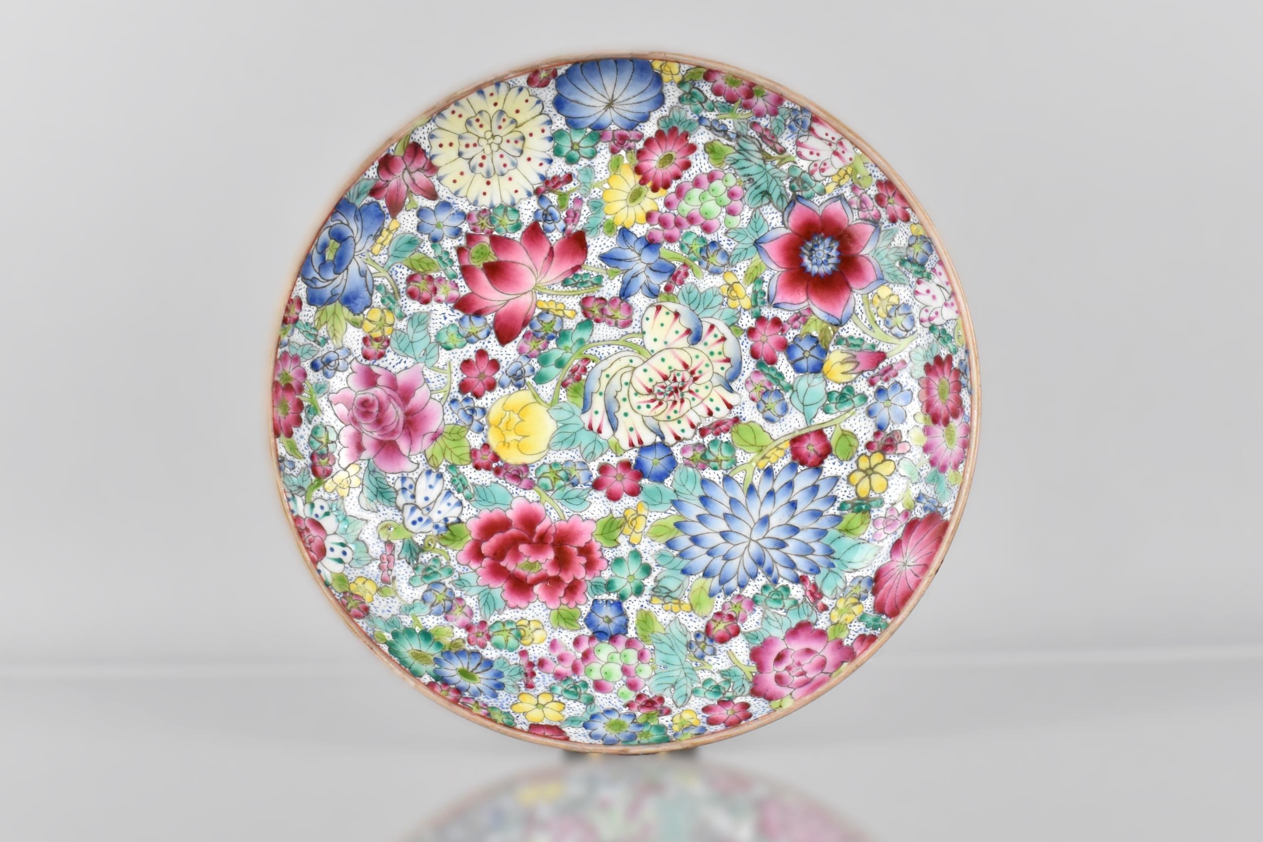 A Late Chinese Qing Period Porcelain Famille Rose 'Hundred Flowers' Dish, Blue Qianlong Seal Mark to Base, 16.5cm Diameter