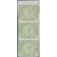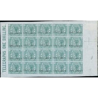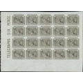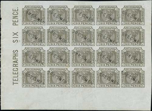 1877 6d Grey plate 1 colour trial, in a deeper colour than the issued stamp, imperforate pane of twenty with "TELEGRAPHS SIX PENCE." in the left margin, each handstamped diagonal "SPECIMEN" type 11, mint, lightly mounted on three stamps only, minor gum wrinkles and tiny thin between two stamps, a rare and attractive pane. S.G. £2,600+. Photo on Page 20.