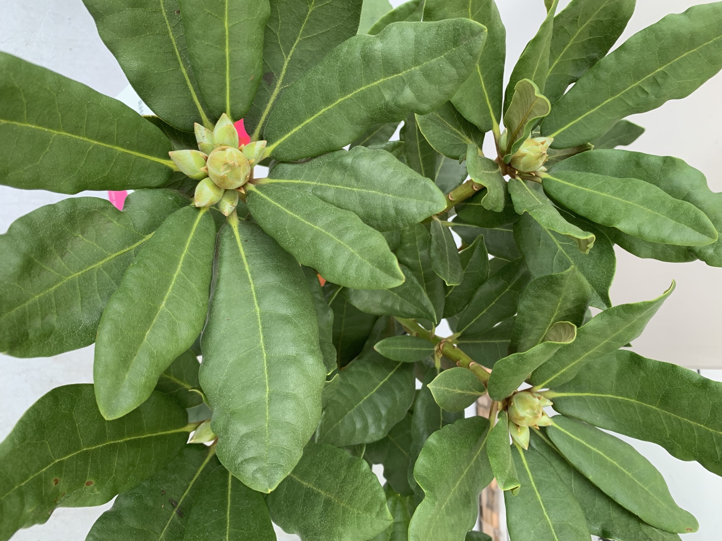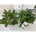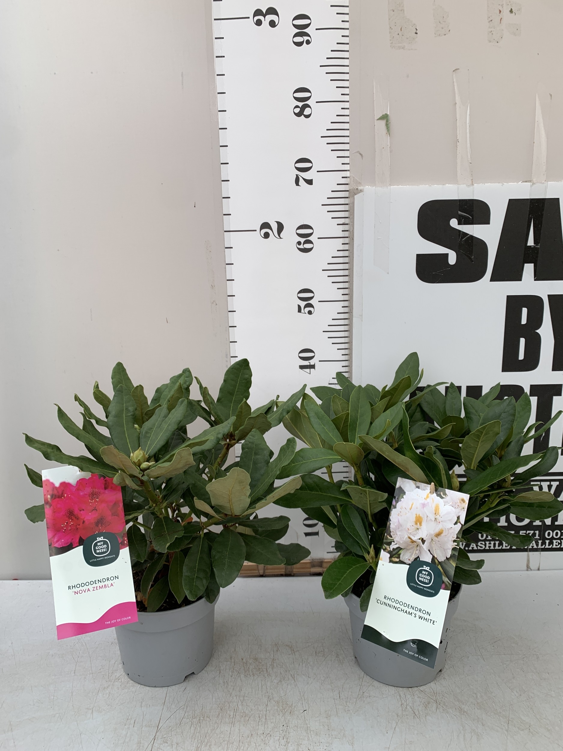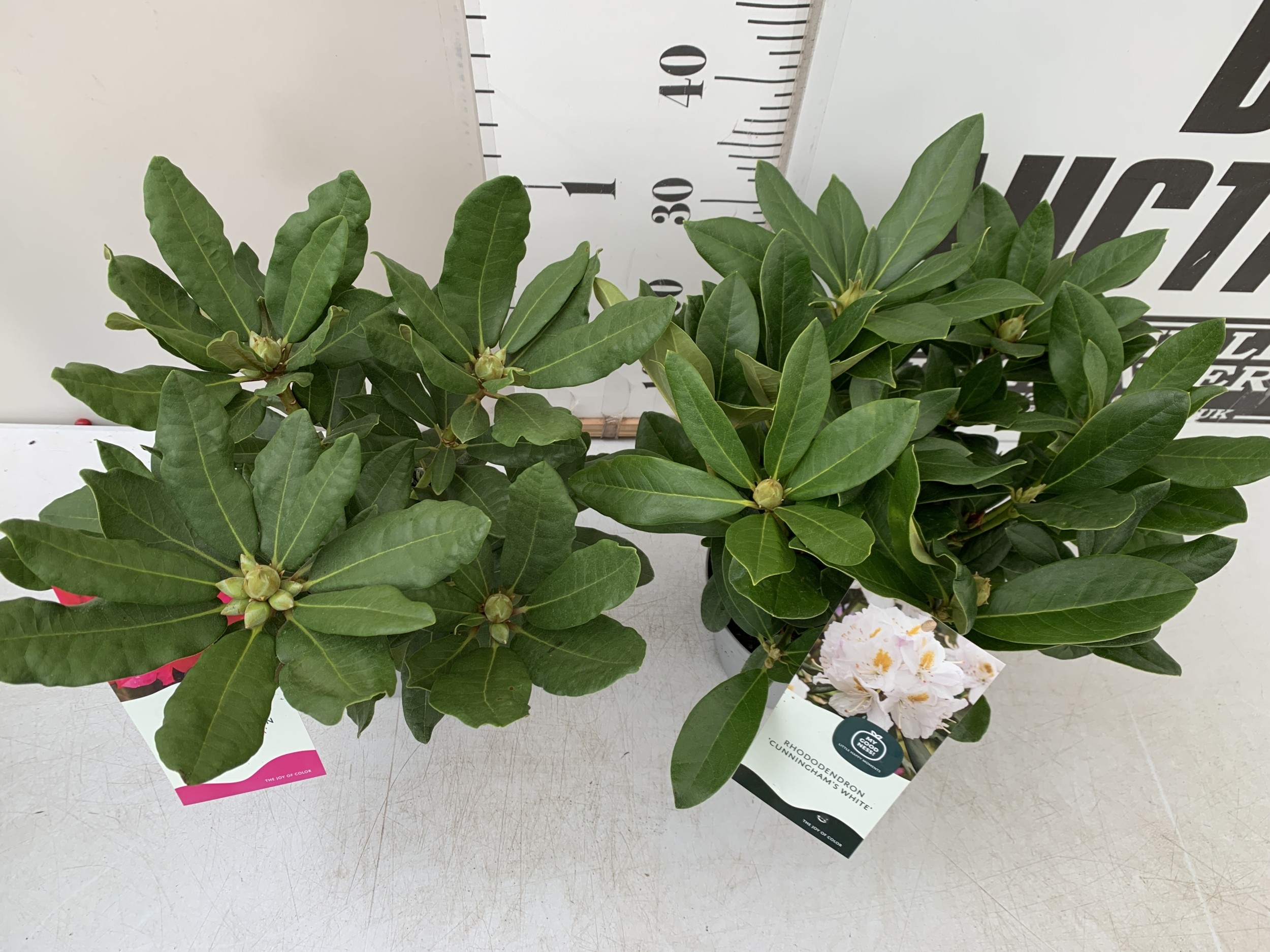 TWO RHODODENDRONS HYBRID ONE DARK PINK 'NOVA ZEMBLA' AND ONE WHITE 'CUNNINGHAM'S WHITE' IN 2 LTR POTS. APPROX 40CM TALL, TO BE SOLD FOR THE PAIR. FULL OF BUDS