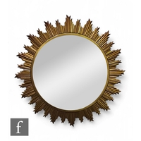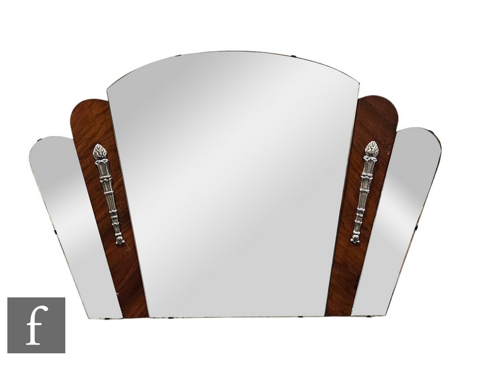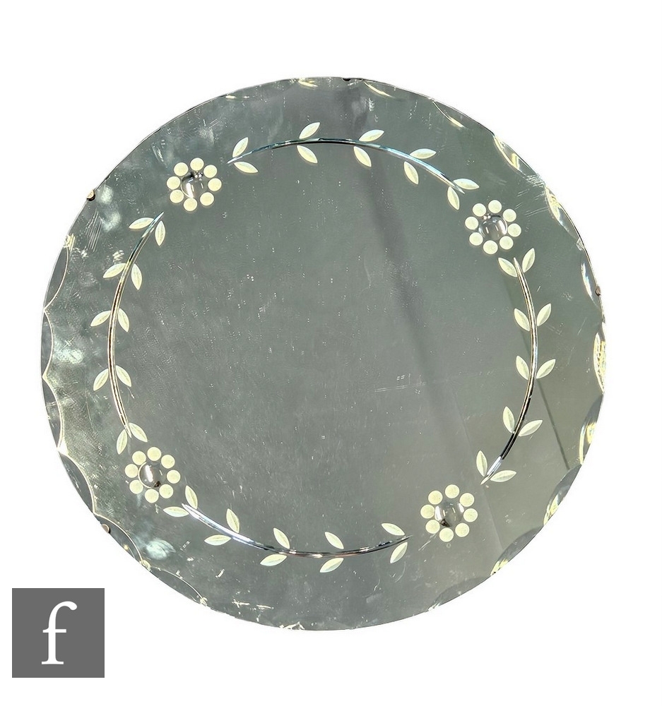Unattributed maker - Two 1950s wall mirrors, to include an arched form segmented mirror with wooden inserts and applied classical style metal embellishments, 48cm x 73cm, together with a small circular floral etched wall mirror, diameter 50cm. (2)