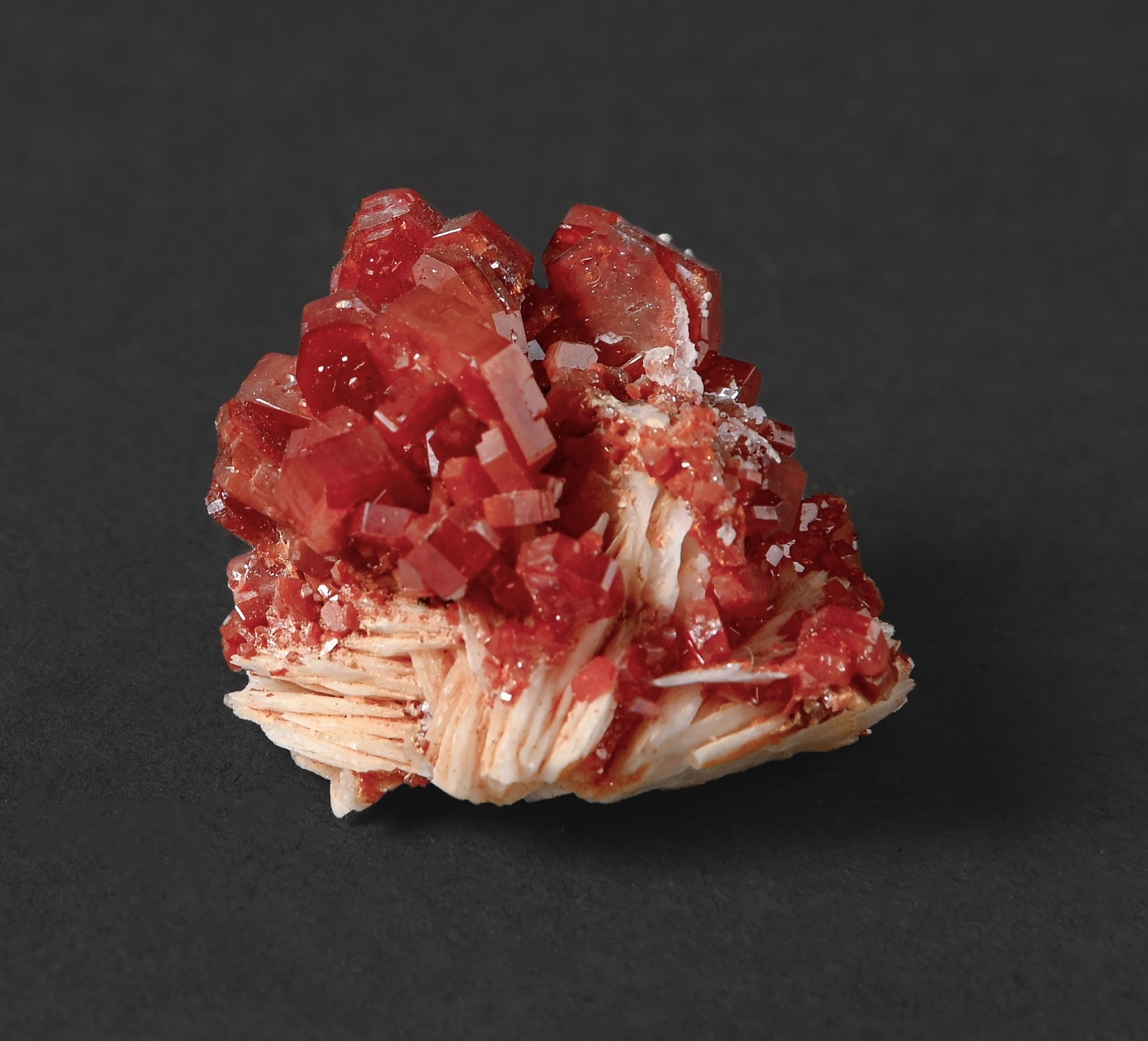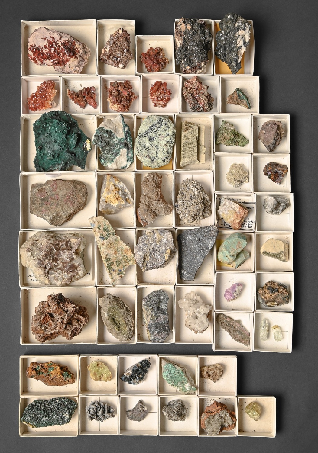 Vanadinite on Baryte, Mines d'Aouli, Morocco, 52mm, seven other mostly larger specimens of Vanadinite, from the same or other locations, Pseudomalachite, Virneberg Mine, Rheinbreitbach, Germany, 75mm, Rhodonite, Långban, Sweden, 30mm (ex Russell Collection) and others, all with Harker Collection label, location, provenance and early 1970s acquisition date (50*)