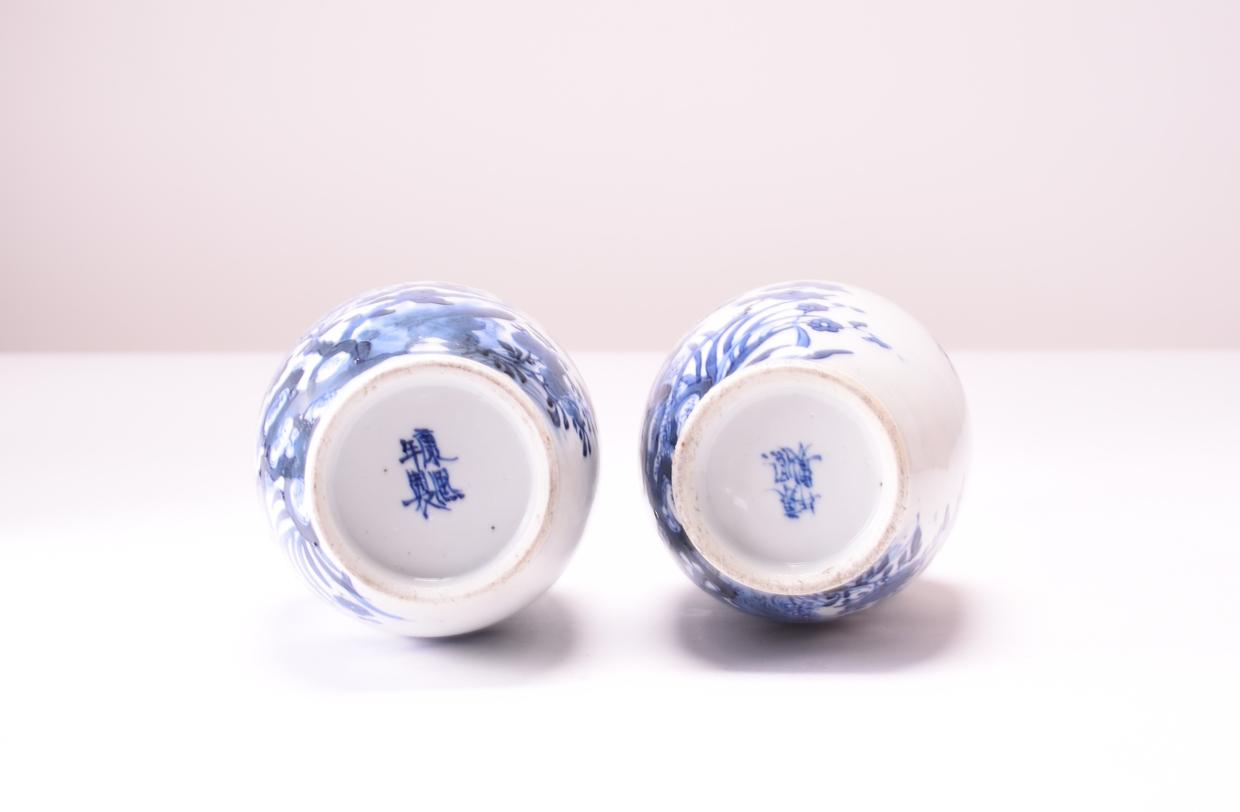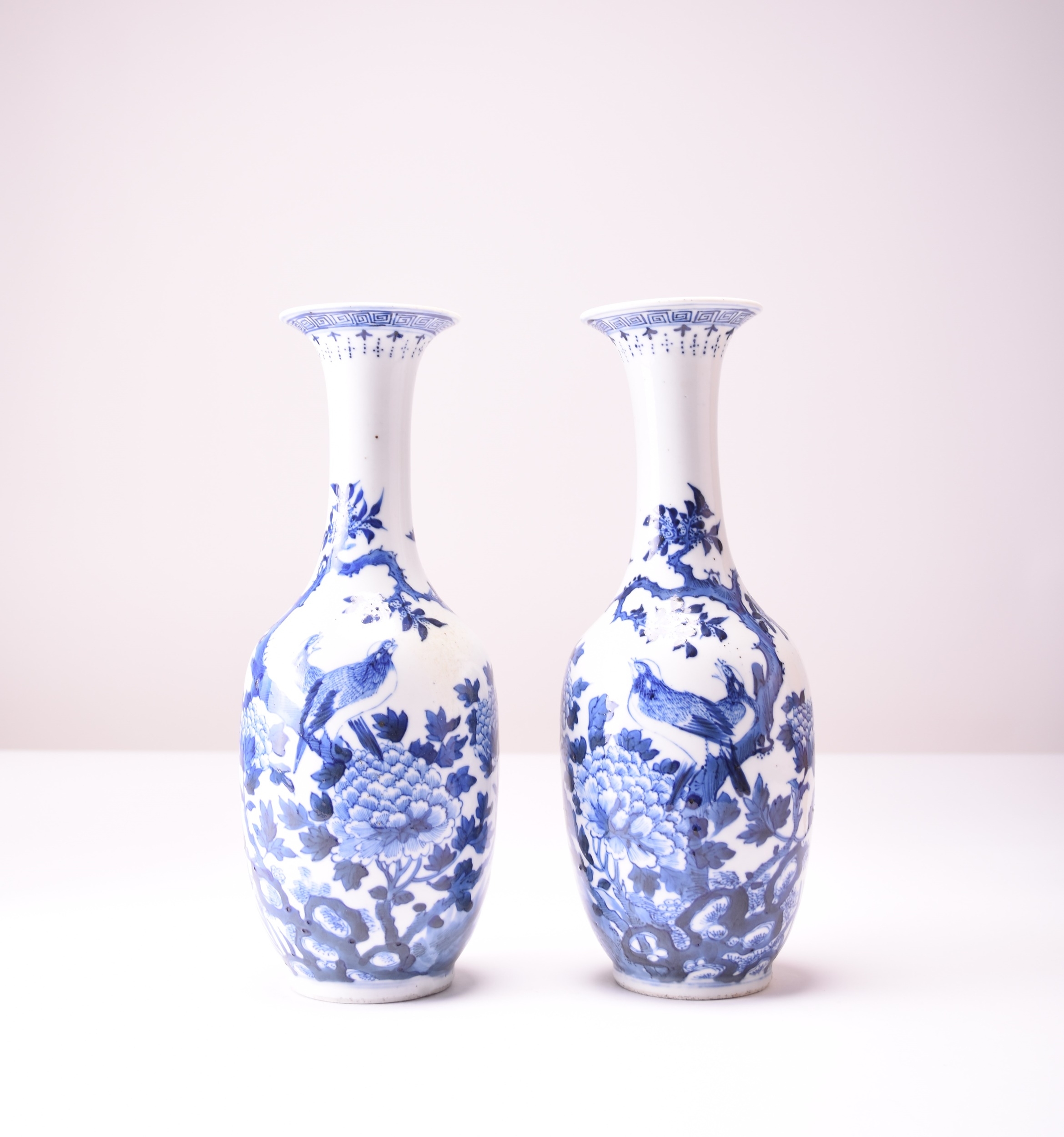 A pair of Chinese blue and white bottle vases, Kangxi four-character marks but 19th century Decorated with peonies, rocks, birds and butterflies. 30cm high (2) Property of a deceased estate in Shrewsbury.