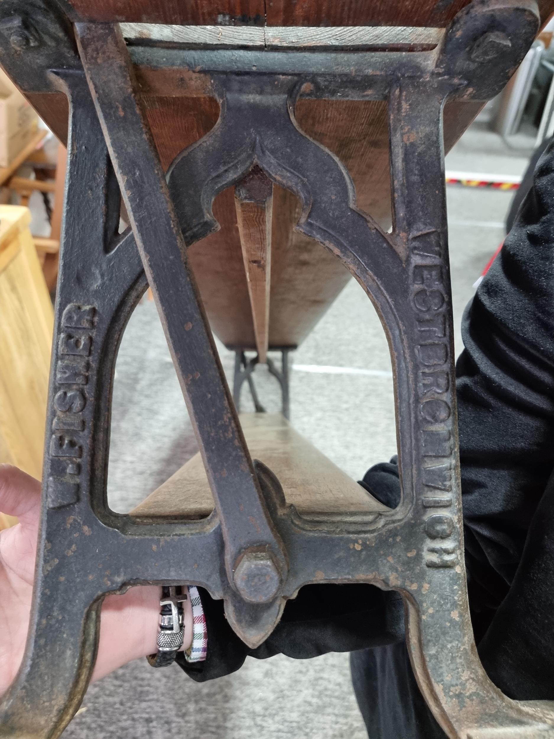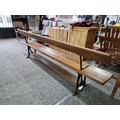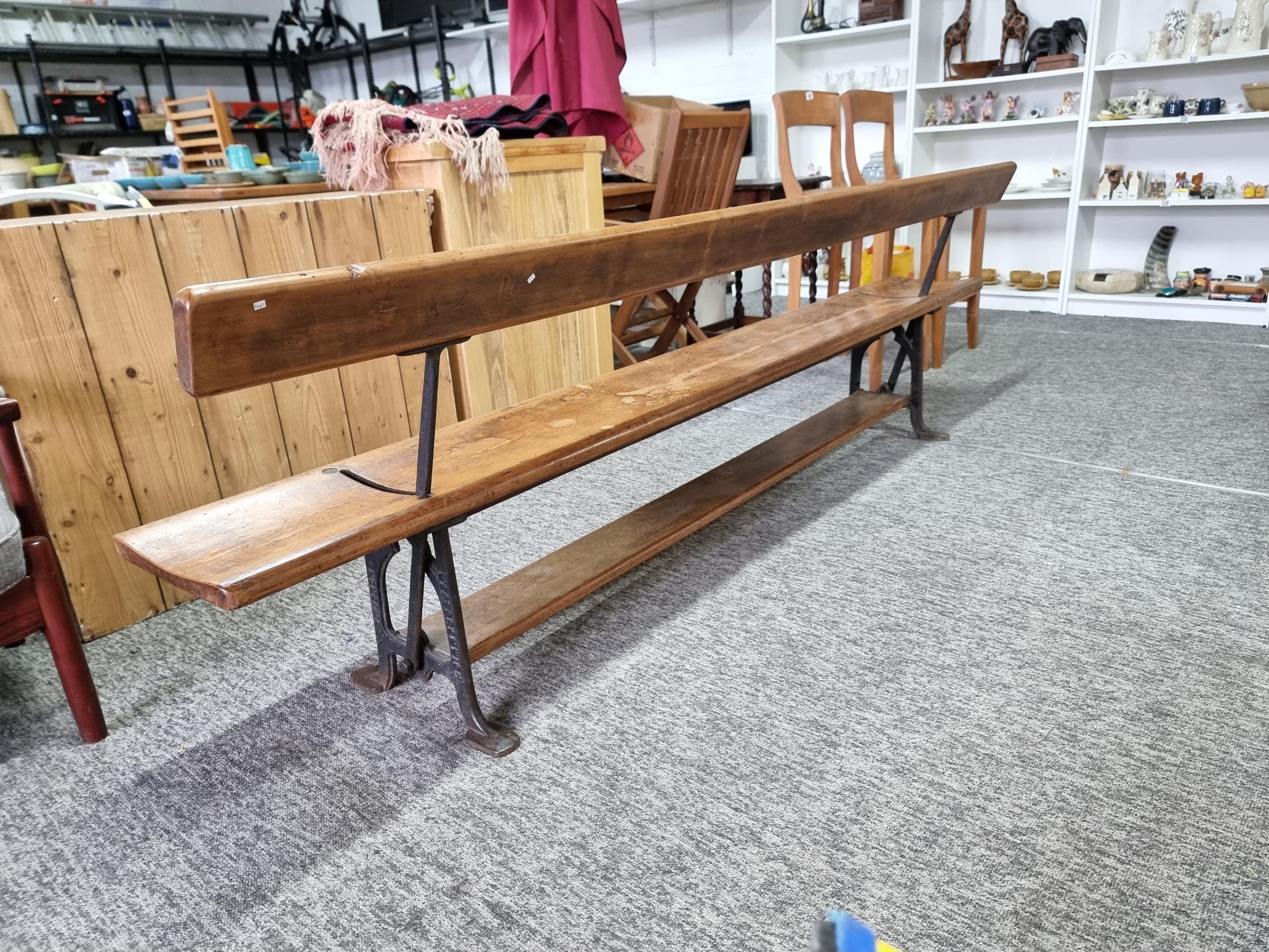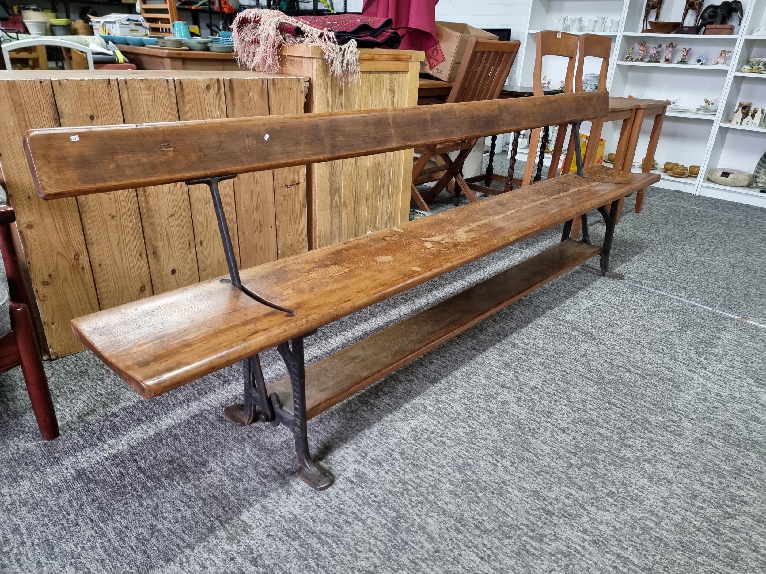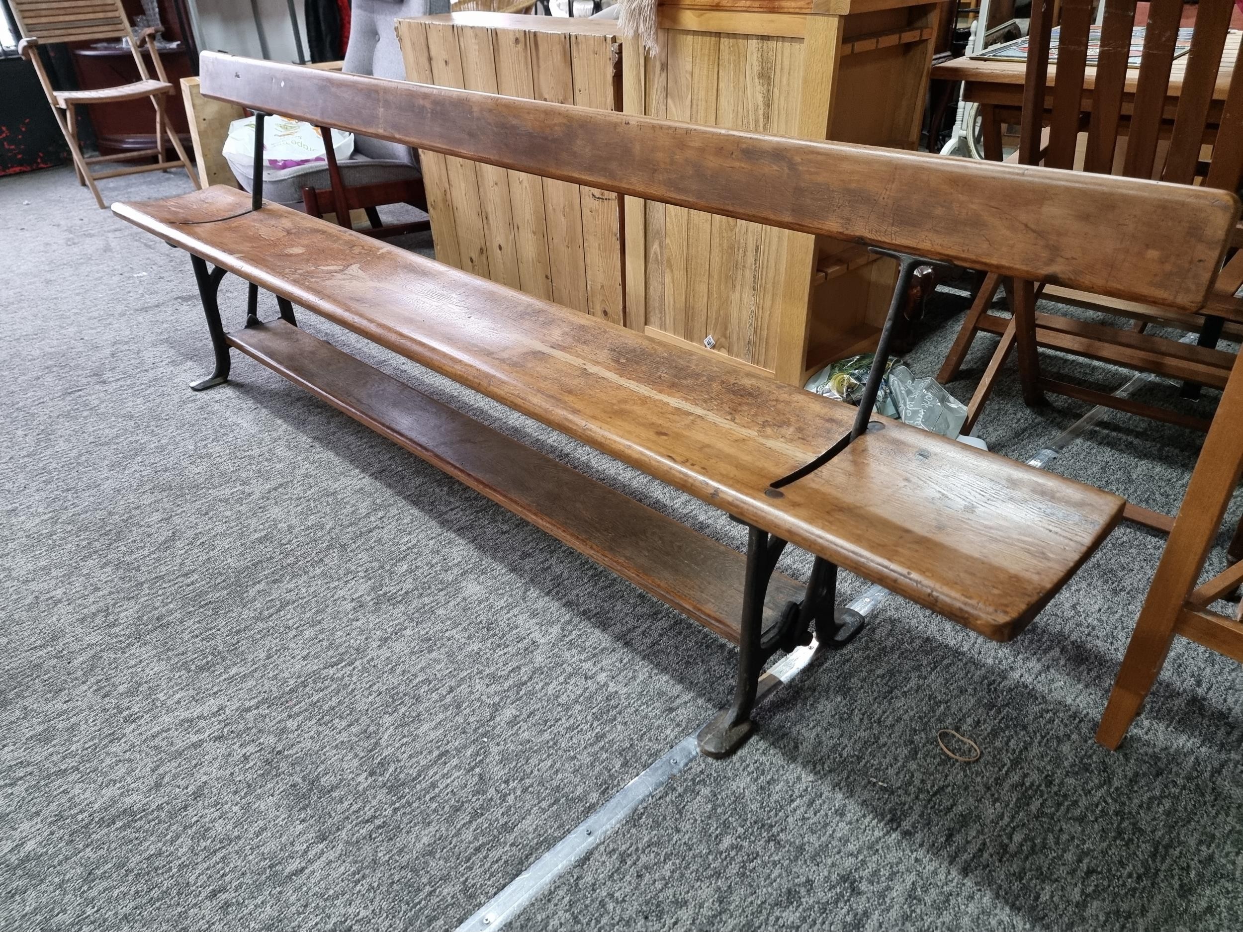 Good quality antique long solid wood and cast iron framed bench removed from a tram station many years ago the bench features a swing function for the back to allows people to sit on both sides of the bench the cast iron frame is marked for W. Fisher West Bromwich the wood has a lovely patina the bench has lots of charm and is highly collectable, has a height of 77cm length 245cm or 8ft width of 32cm