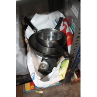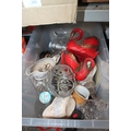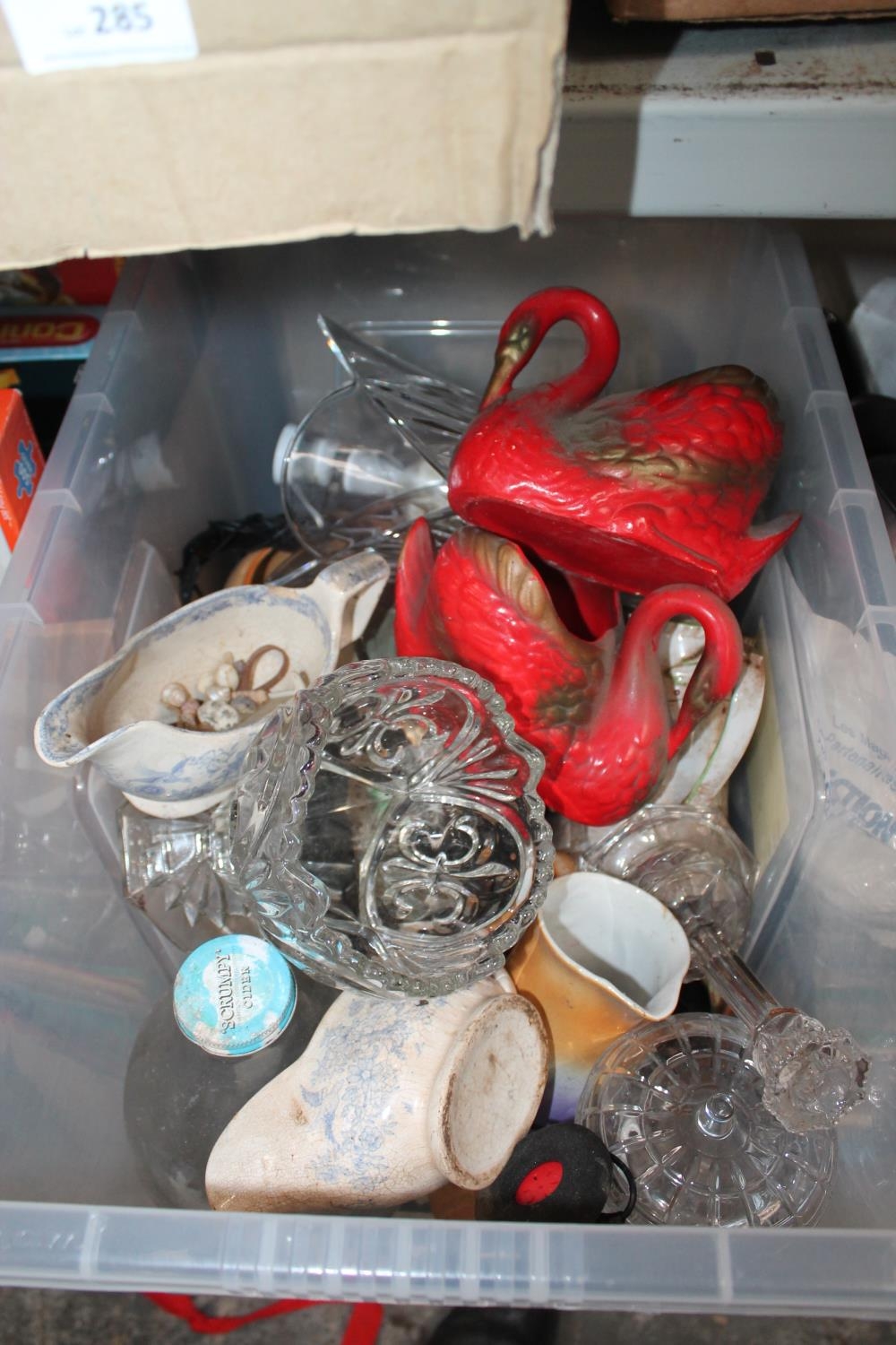 PLASTIC CONTAINER WITH GLASS VASES, PAIR OF SMALL SWAN PLANTERS, A CIDER BOTTLE ETC