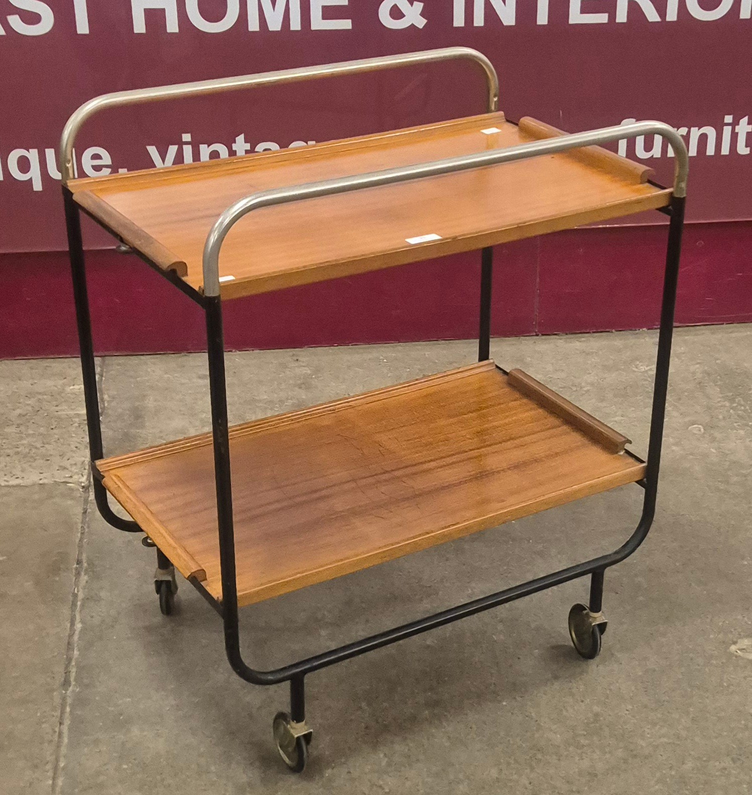 A teak and black metal trolley