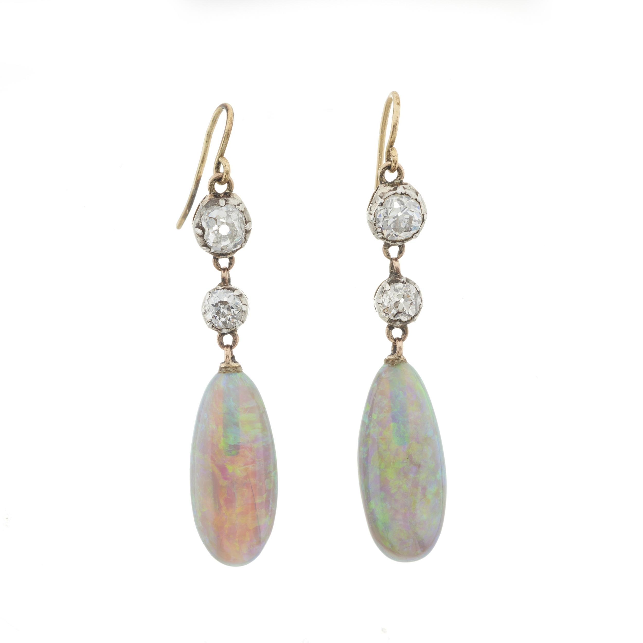 Overall good to fair condition Moderate general wear in keeping with age of piece Hook fittings for pierced ears Some claws need attention Diamonds fairly bright, lively and fairly well matched considering cut. Diamonds with inclusions, two with surface reaching fractures Opals fairly well matched, both with good play of colour. Both with fine hairline crack to lower area Clients are advised to view and inspect items before bidding and they must satisfy themselves as to the condition of every lot For enquiries about this lot please contact David Pregun at david@kinghamsauctioneers.com