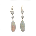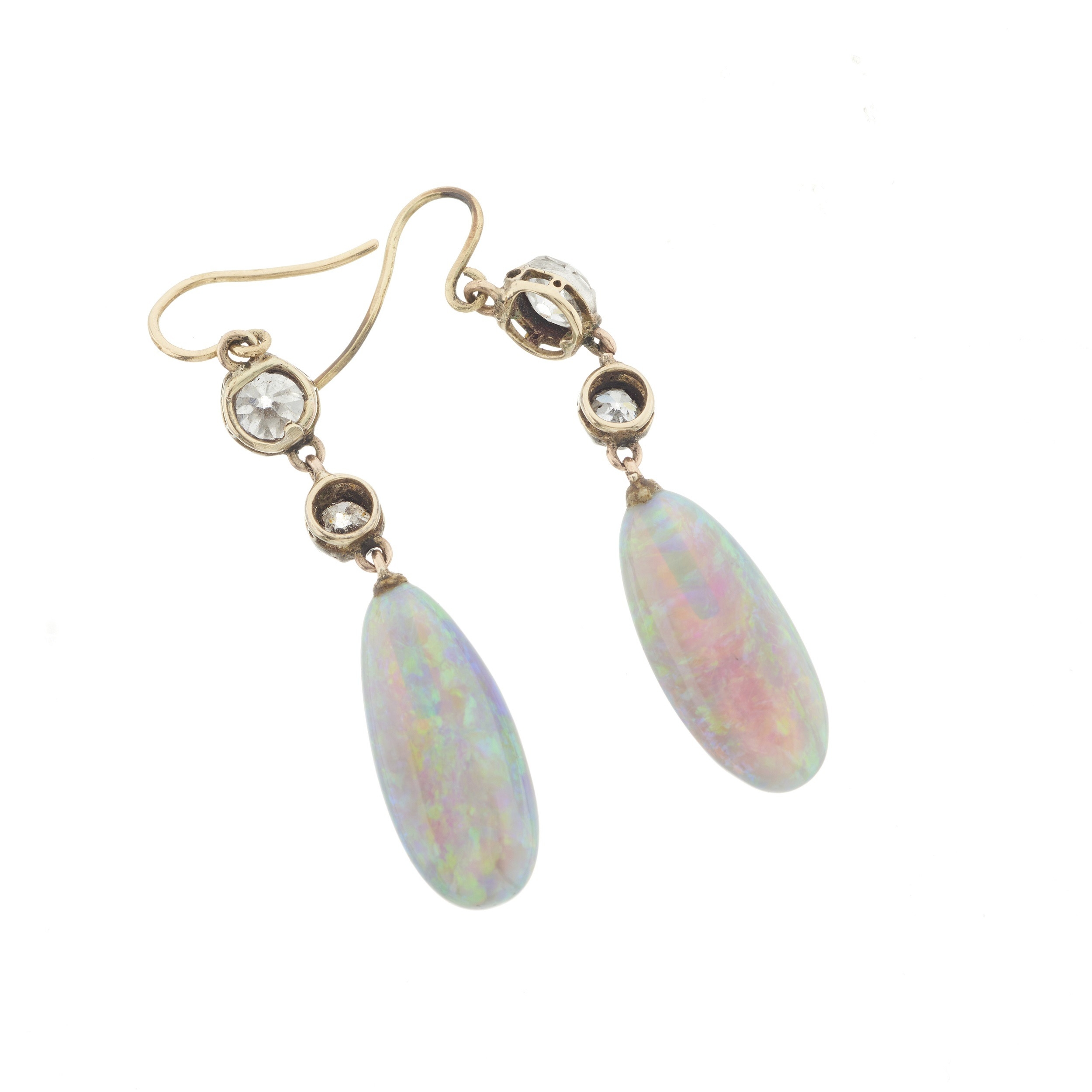 A pair of late Victorian opal cabochon and old-cut diamond drop earrings, estimated total diamond weight 1.10ct, H-J colour, P1-P2 clarity, length 4.2cm, 3.7g