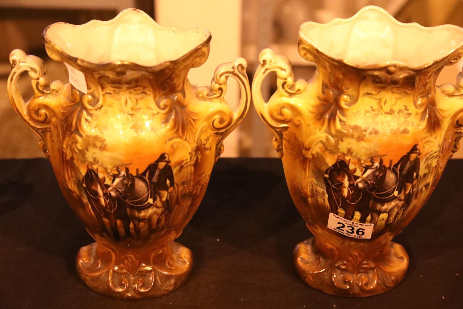Pair of decorative twin handled vases. Not available for in-house P&P