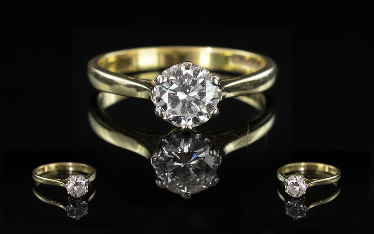 18ct Yellow Gold - Attractive Single Stone Diamond Set Ring. Full Hallmark to Interior of Shank. The Round Brilliant Cut Diamond of Excellent Colour and Clarity. Est G - H Colour, VSI Clarity, Cal Weight 0,75 pts, Ring Size M - N. Shank / Setting In Excellent Condition, Low Estimate.