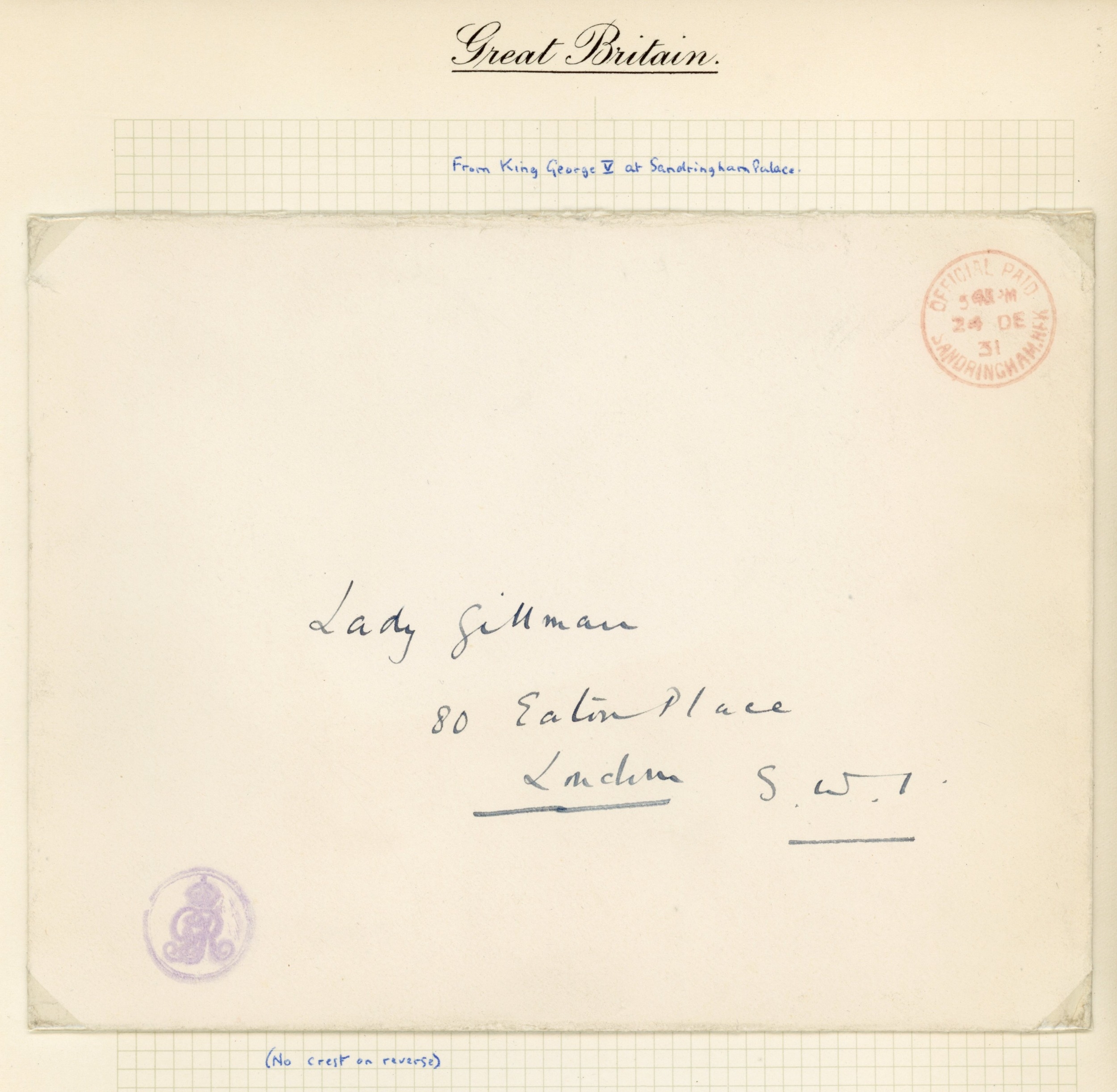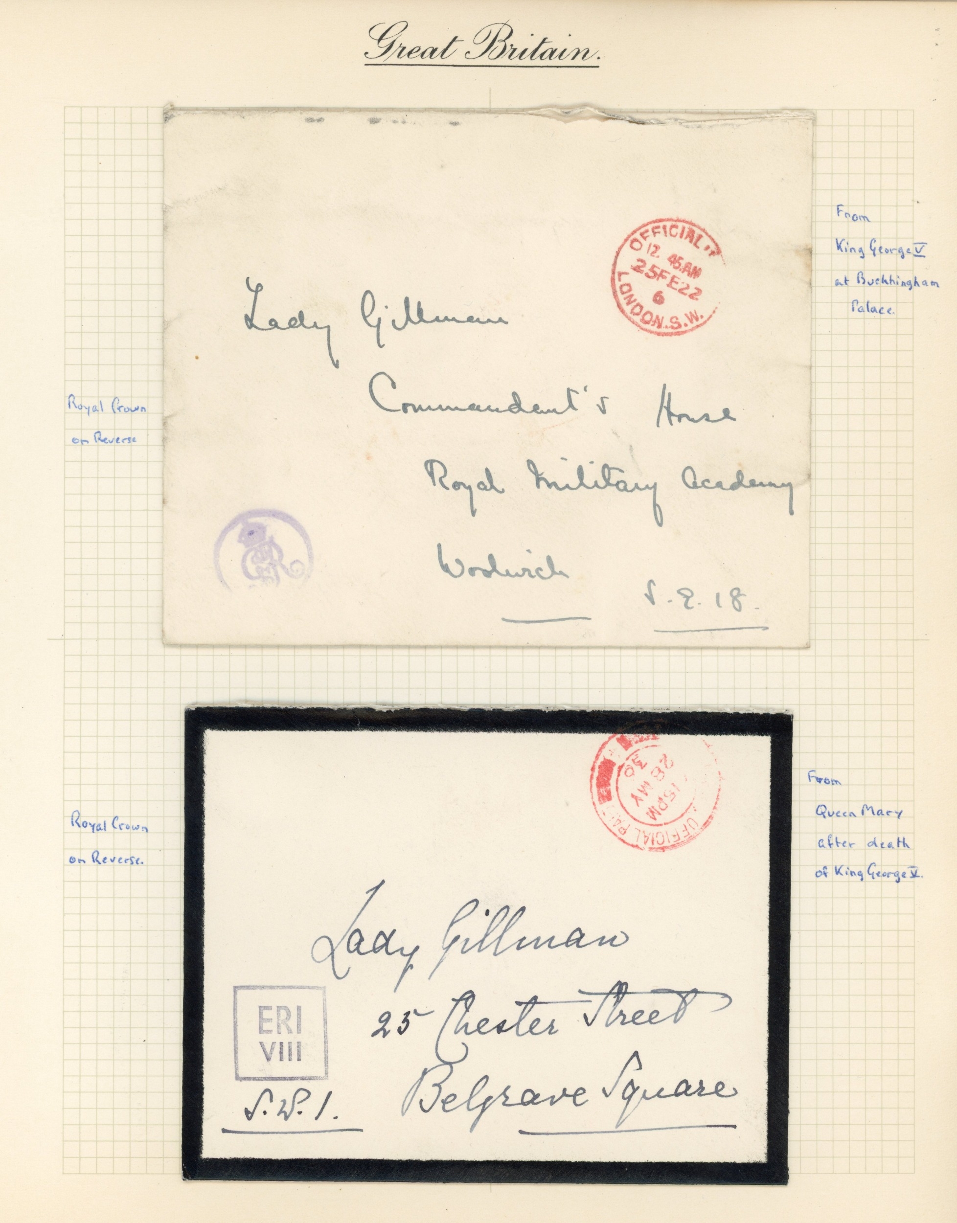 ROYALTY: 1930s to 1980s collection of Royal Household mail, with some addressed to a Lady Gillman, including the cypher handstamps of KGV, a mourning cover bearing the cypher of KEVIII, KGVI and QEII cover with the â??Prince of Wales feathers' crest on the reverse, all bearing either London Official paid cds or machine cancel variants in red, with one cover showing Sandringham cds, the cypher handstamps in either mauve or black, generally fine condition. (5