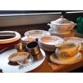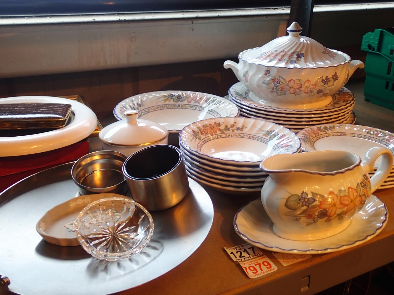 Shelf of mixed items to include 22 piece Staffordshire Cherry Orchard table ware. Not available for in-house P&P, contact Paul O'Hea at Mailboxes on 01925 659133