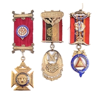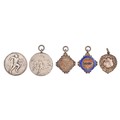 Three silver watch fob shields, early 20th c, various sizes, makers and dates, 18dwts and two larger silvered bronze medals (5)