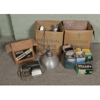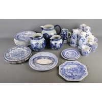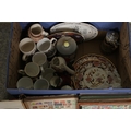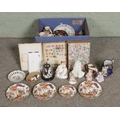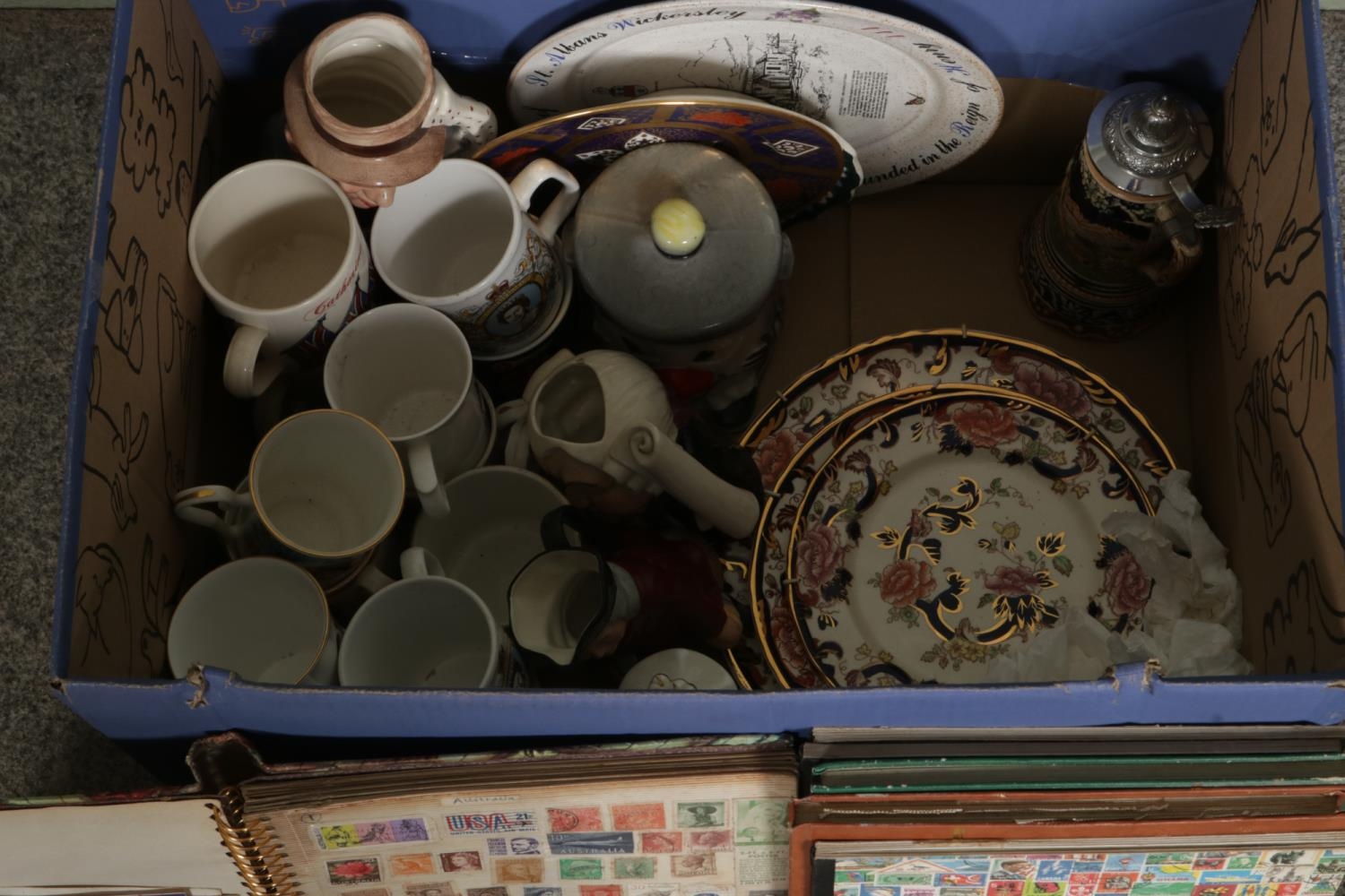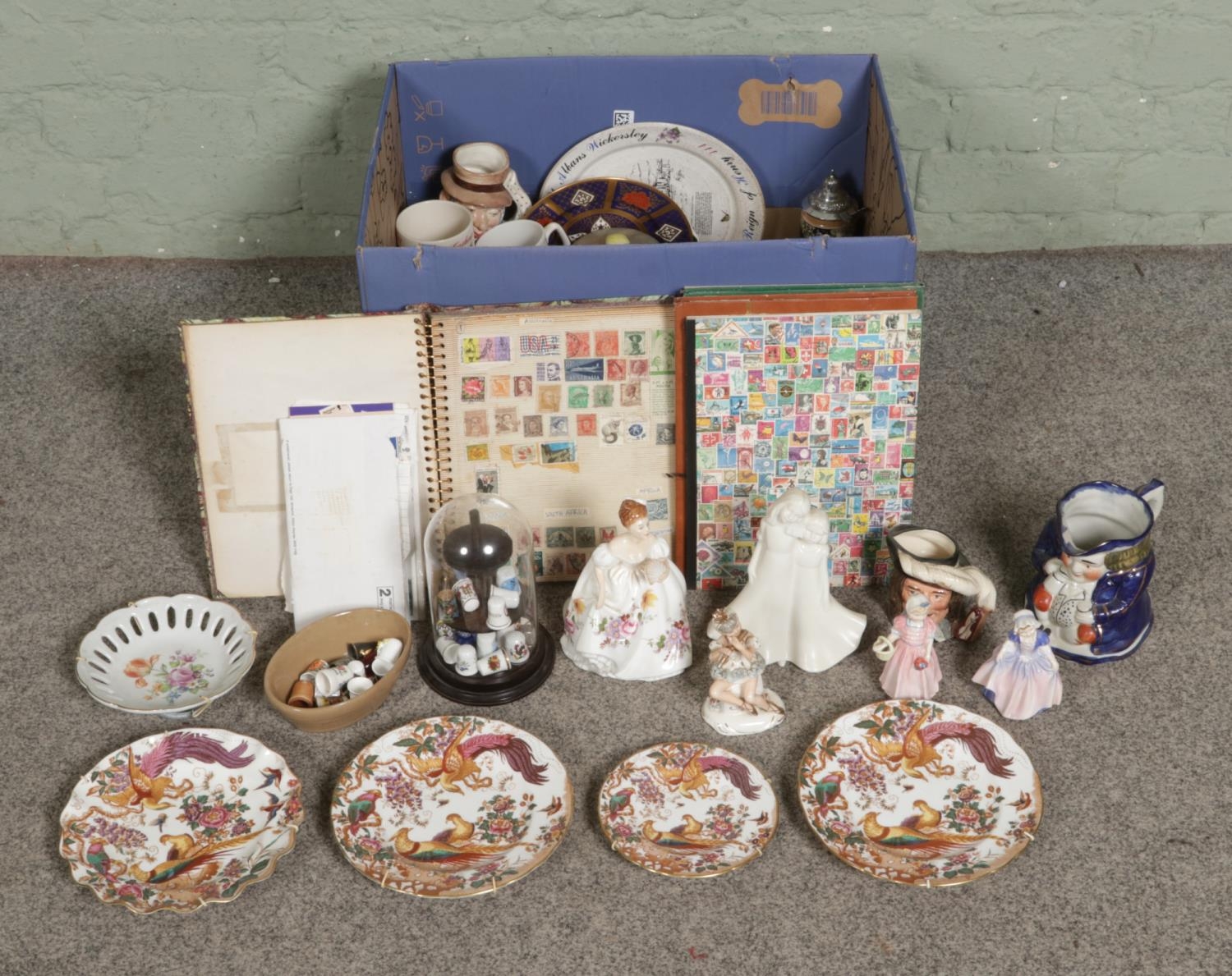 A box of assorted ceramics and miscellaneous; Including Royal Crown Derby 'Old Avesbury' cabinet plates, commemorative mugs, character jugs, Masons cabinet plates, Royal Doulton figures - 'Dinky Do', 'Tinkle Bell' and 'Marilyn HN3002' alongside Thimbles - Aynsley, Spode, Wedgwood etc, Royal Worcester figure 'Freindship' and a collection of stamps etc.