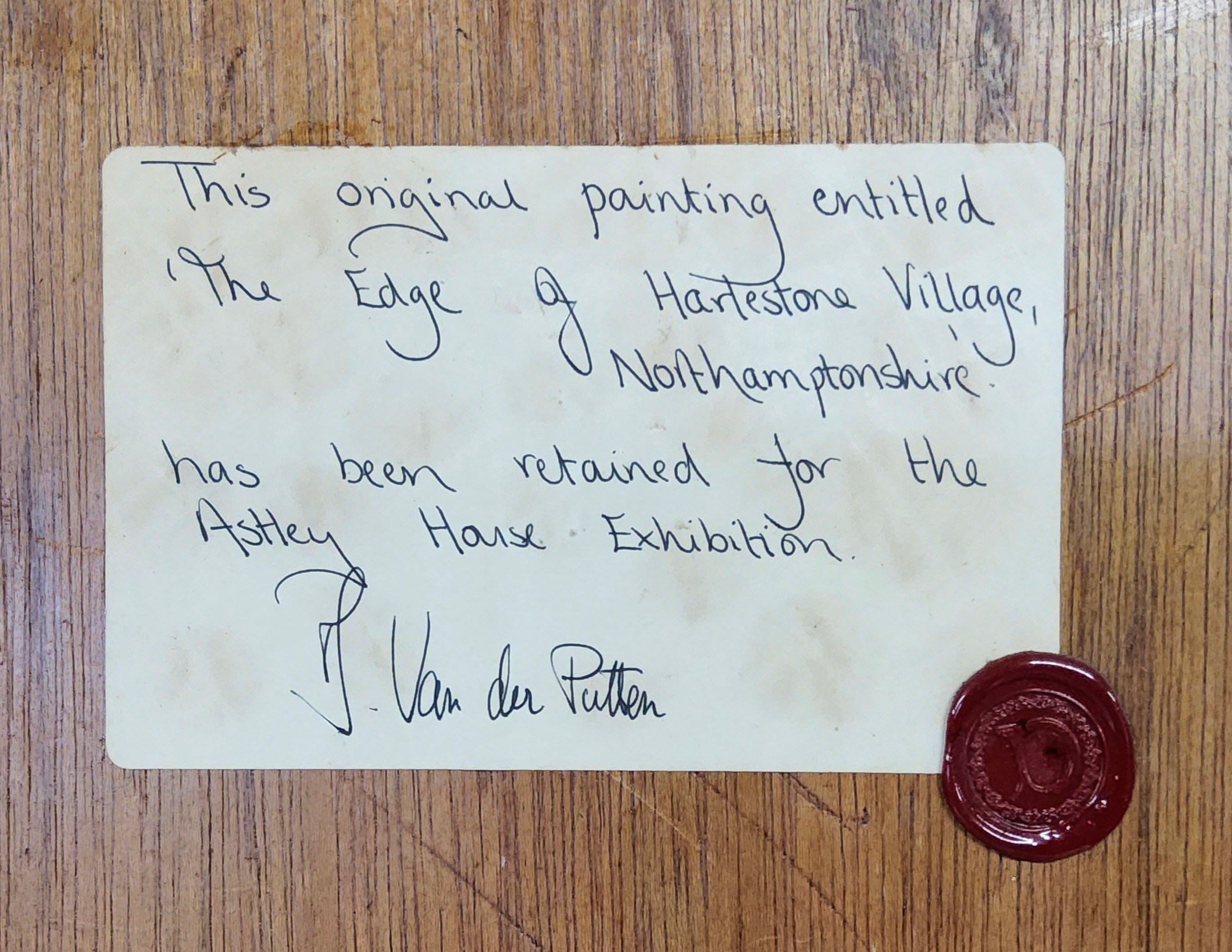 Note attached to rear from the artist 'This original painting entitled 'The Edge of Harlestone Village Northamptonshire has been retained for the Astley House Exhibition' signed by the artist, with wax seal monogrammed D