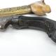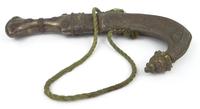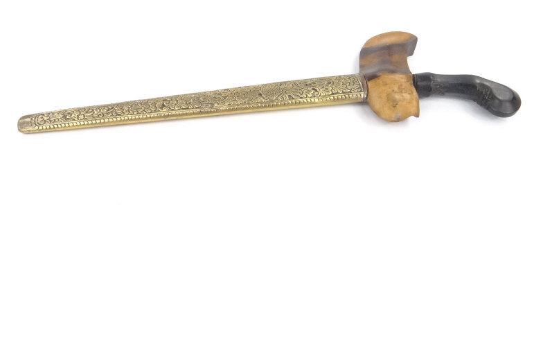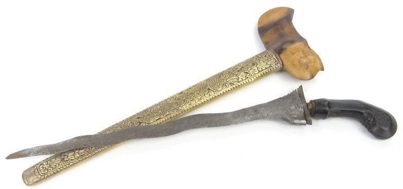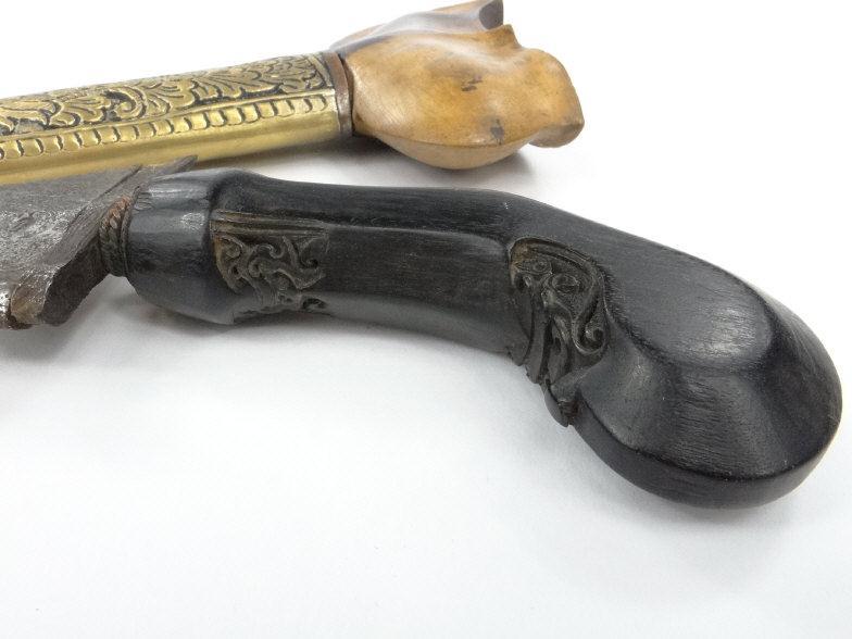 Middle Eastern steel bladed kris with wooden hilt and carved ebonised handle together with brass sheath, 49cm in length