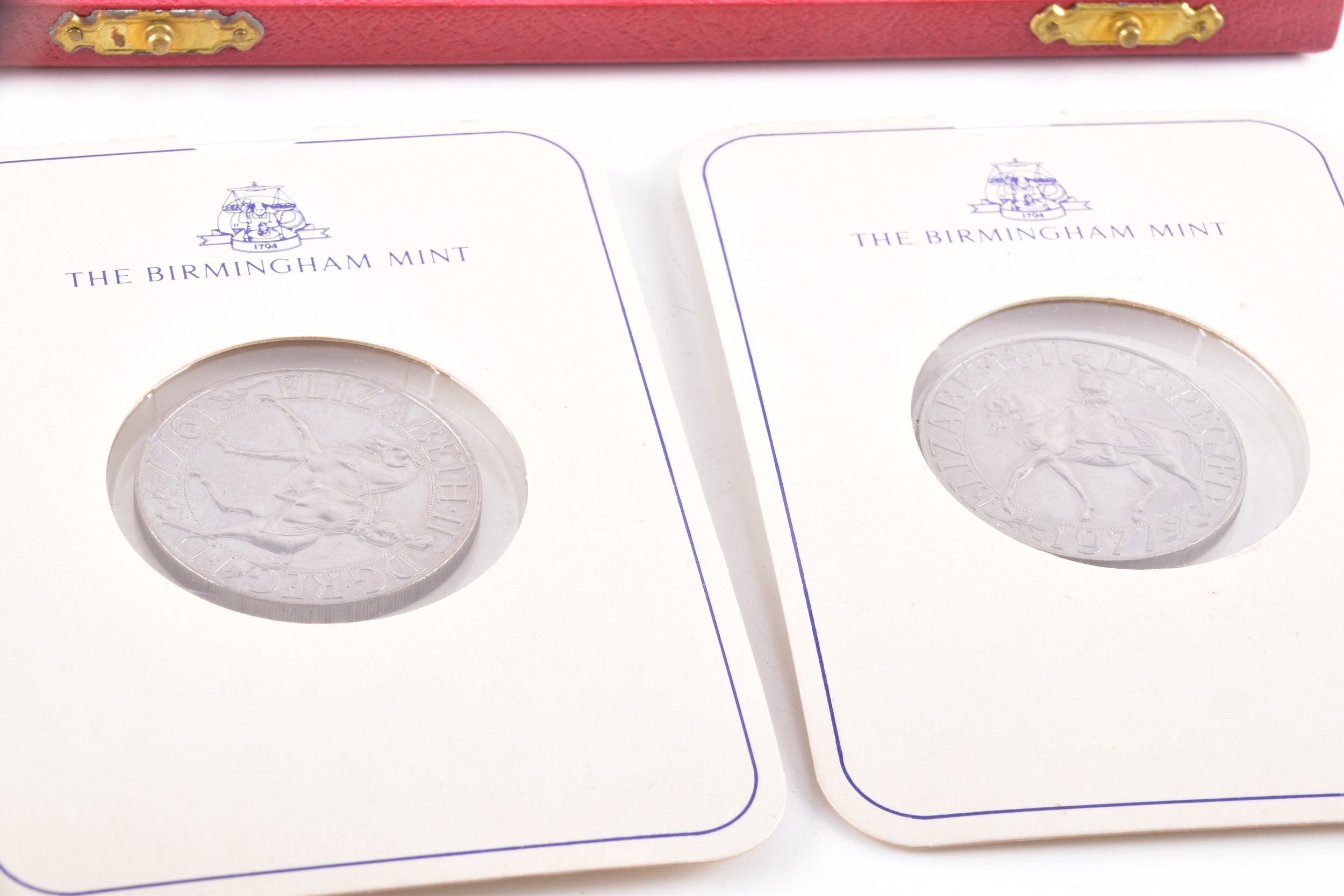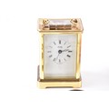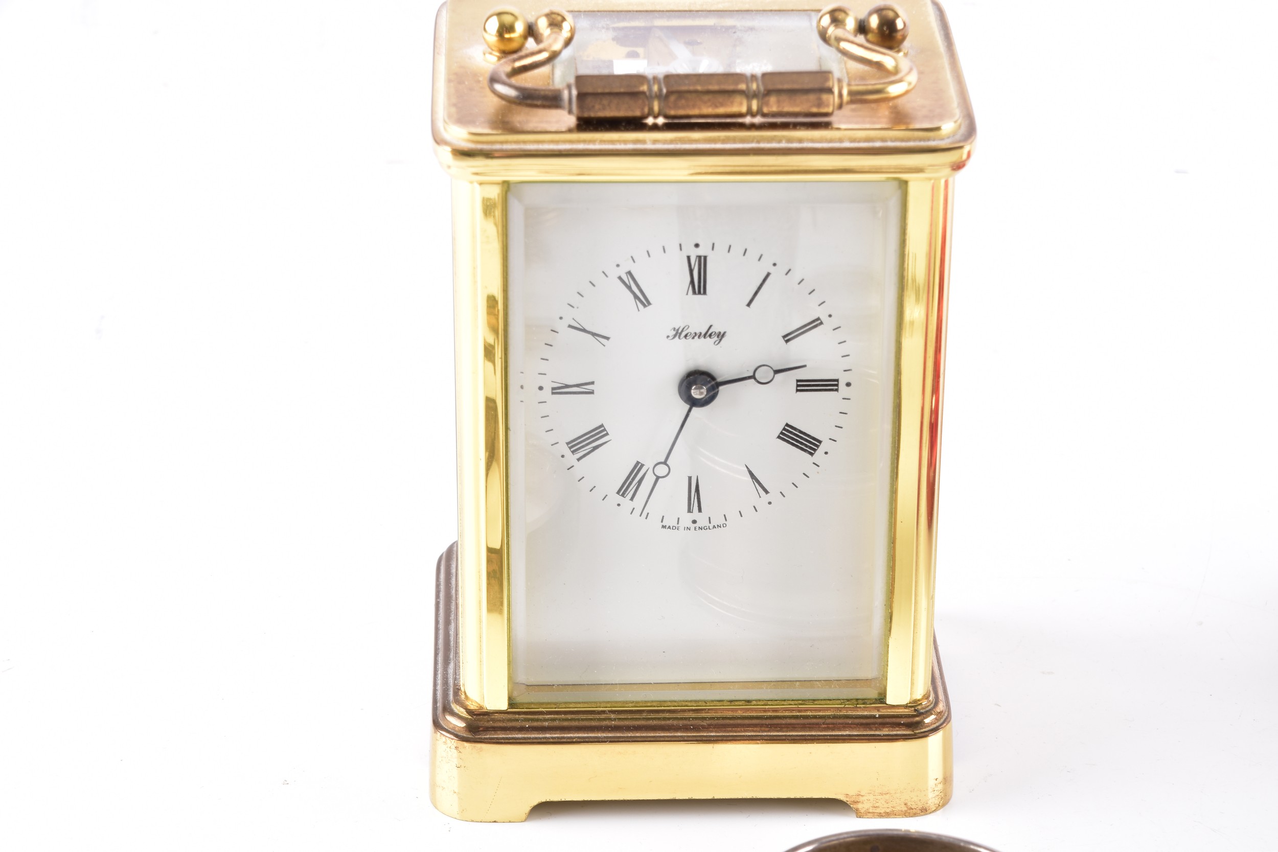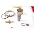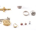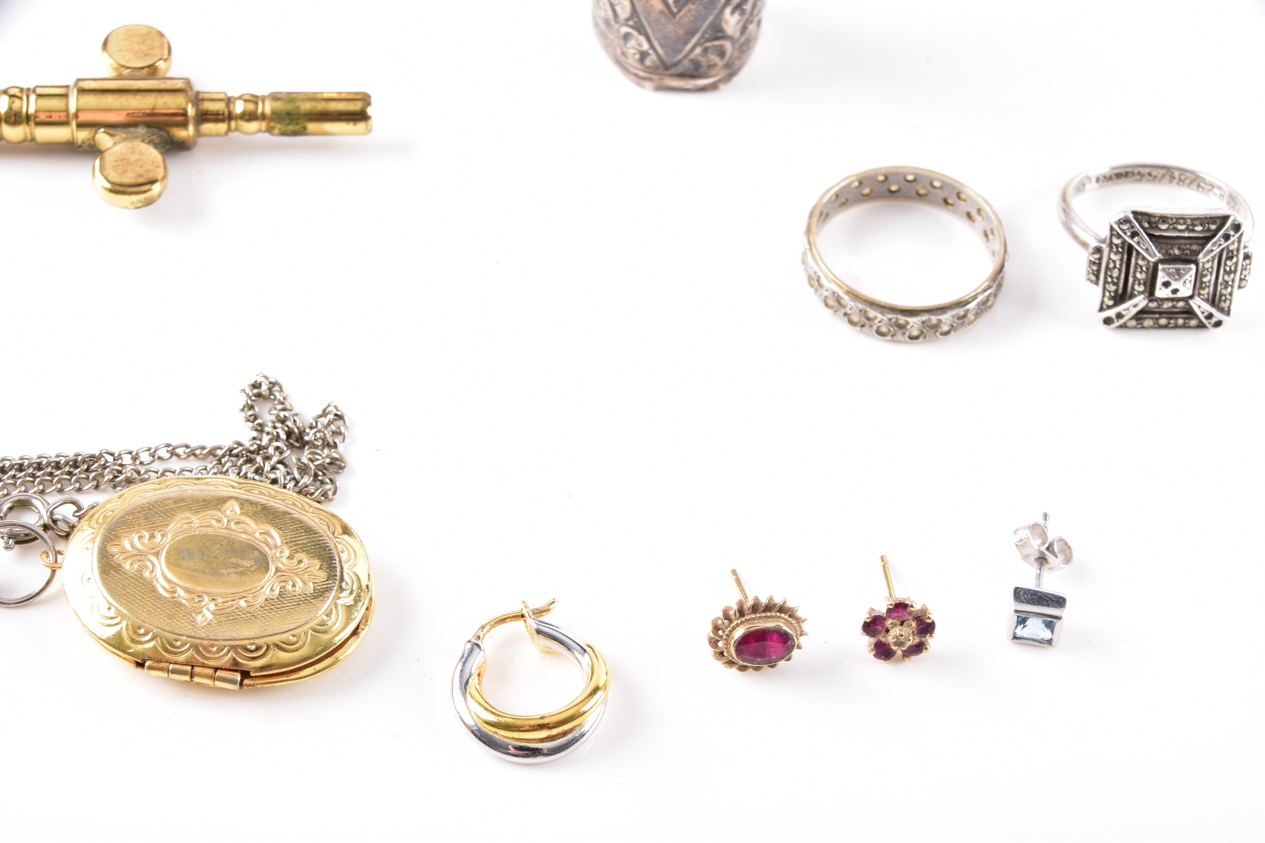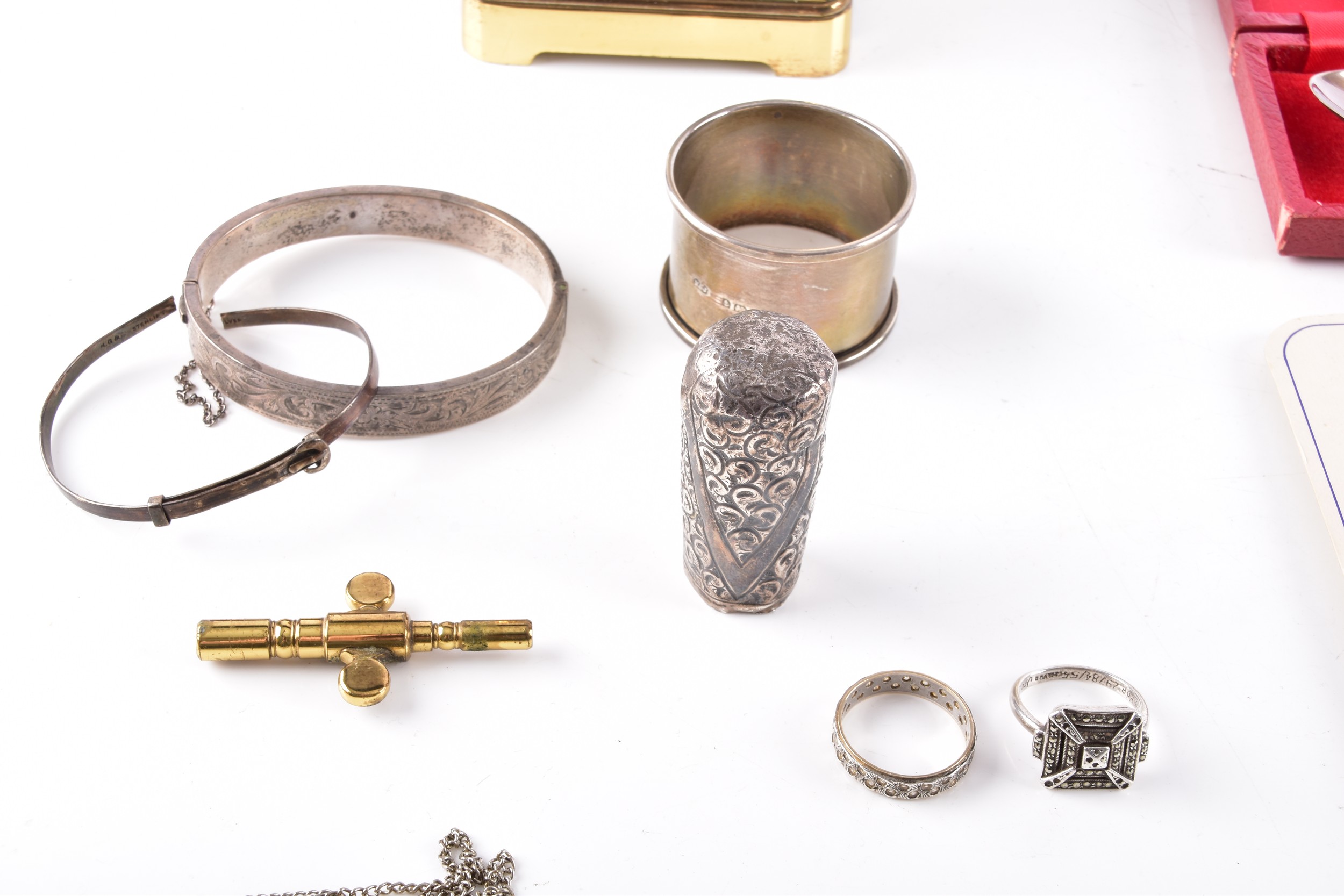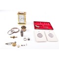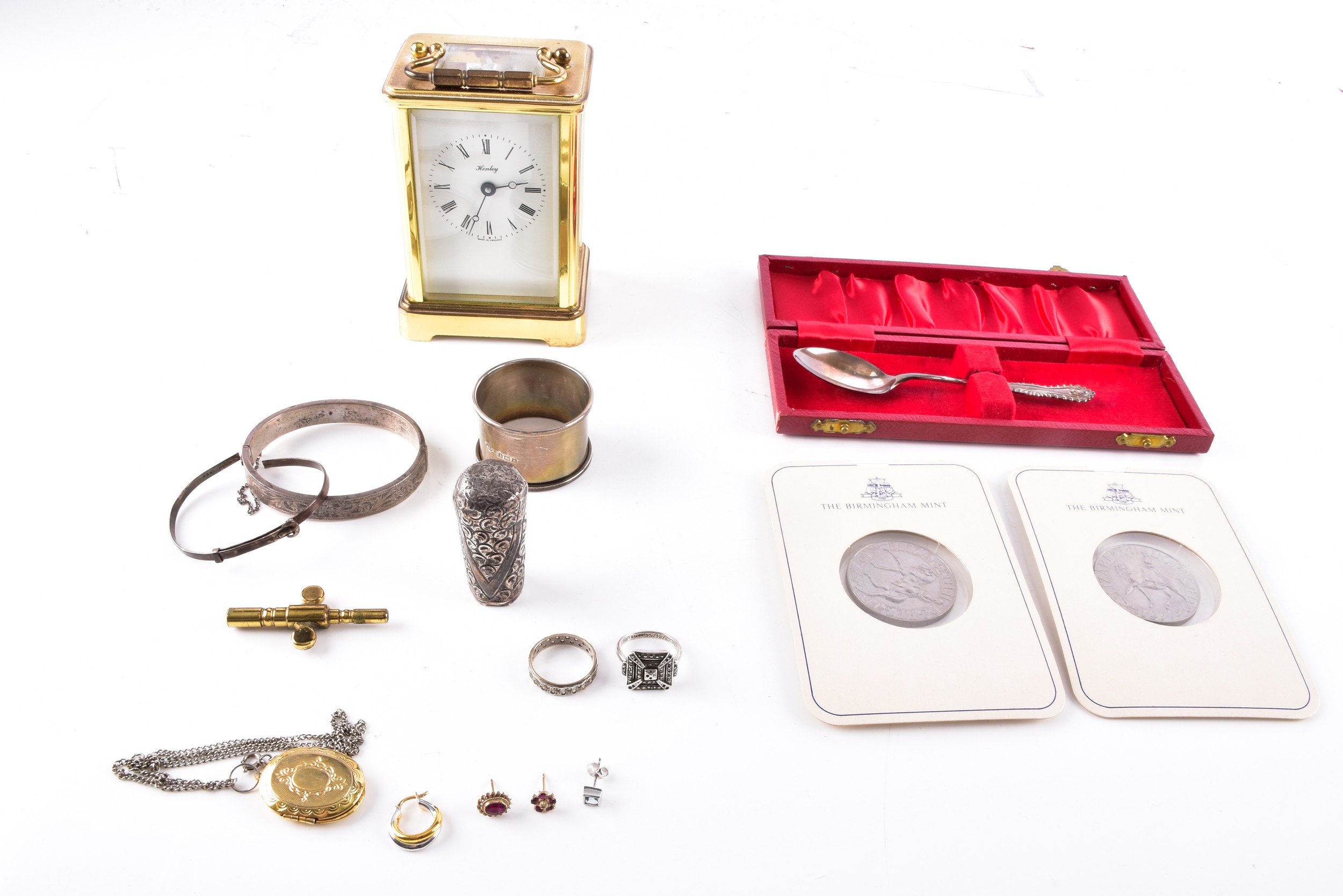 A Henley gilt carriage clock with key, 11 cm high, two commemorative crowns, a silver engraved bangle, a silver buckle design bangle, a silver christening spoon in presentation box, a single silver napkin ring, a weighted silver walking stick finial, two silver ring, a yellow metal locket on silver chain, two single 9ct gold stud earrings, together with a single 18ct white gold blue stone stud earring.