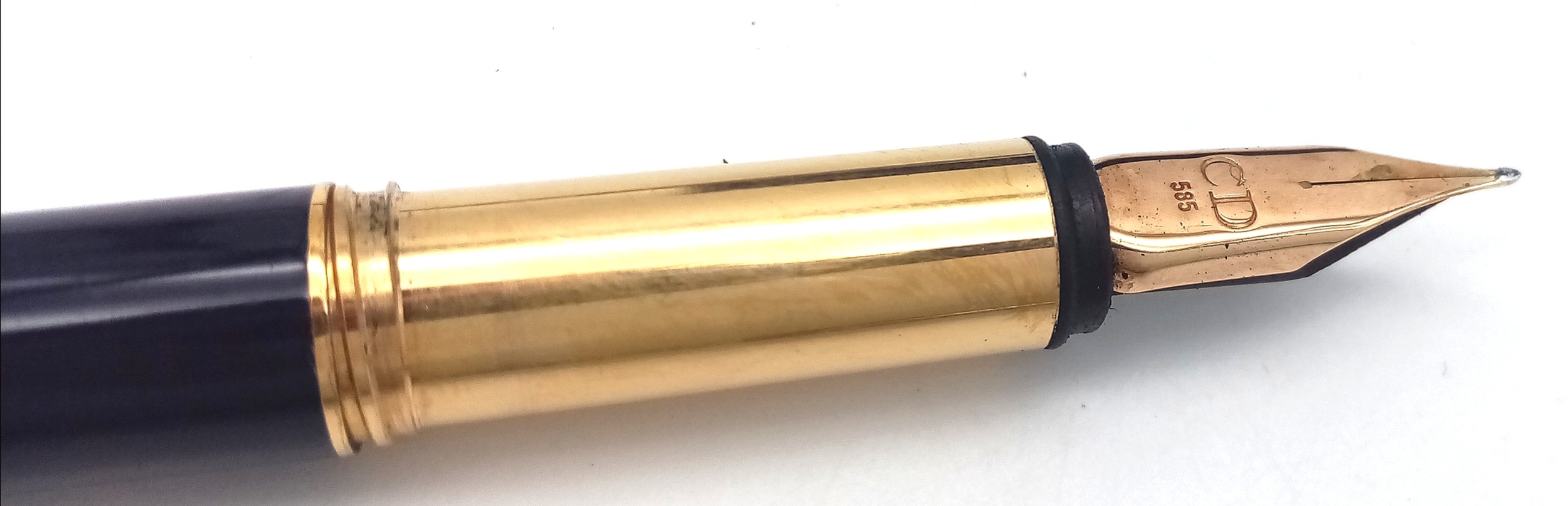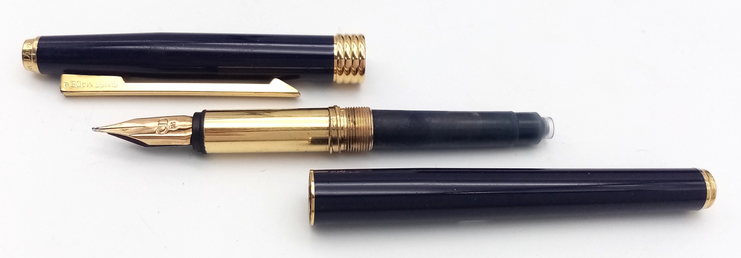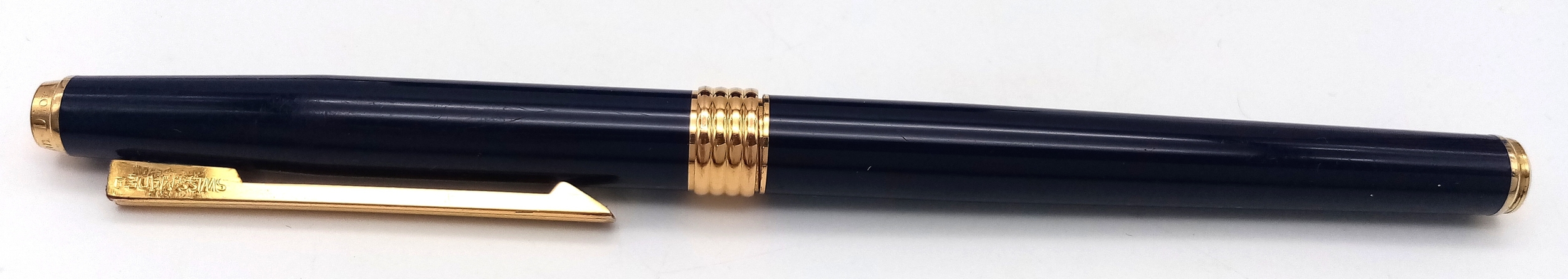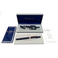 A Very Stylish Christian Dior Blue Lacquer and Gold Tone Fountain Pen 15cm Length. Complete with Box, Paperwork, Spare Cartridges and Ink System. Model CDA 920.