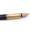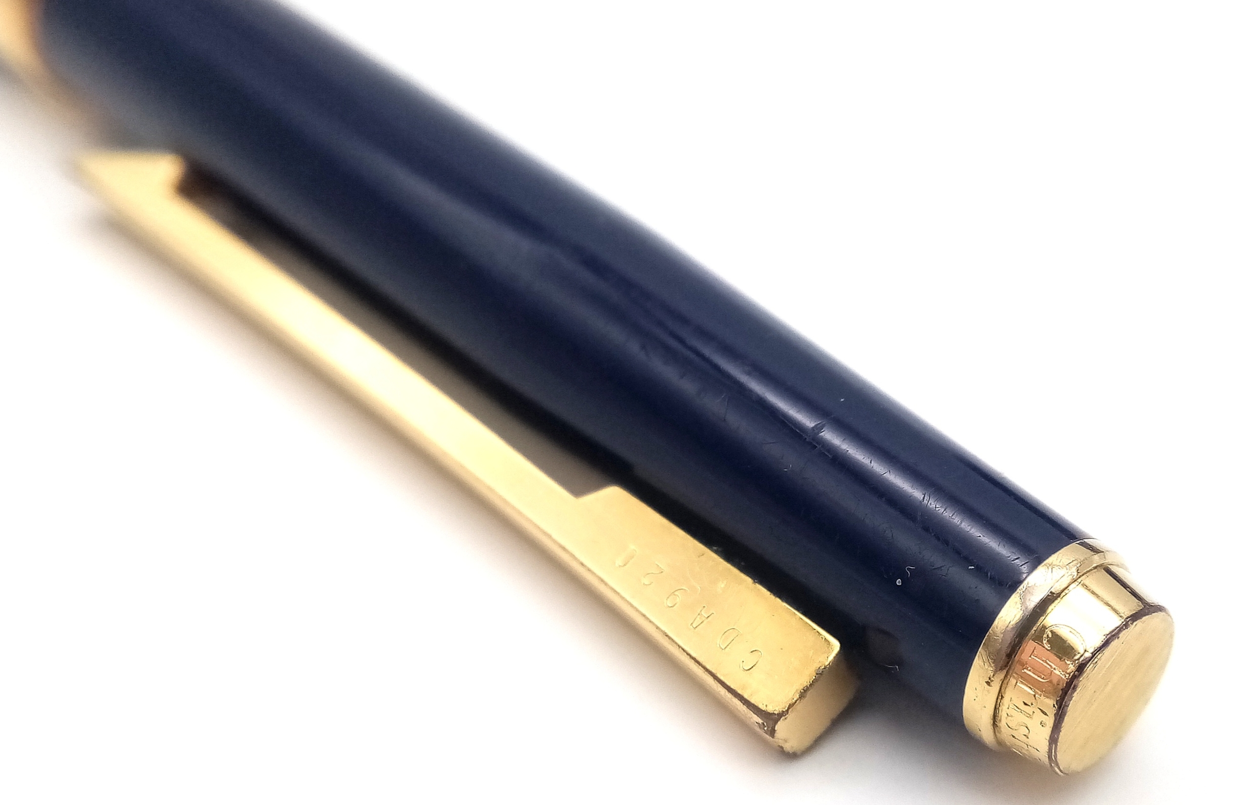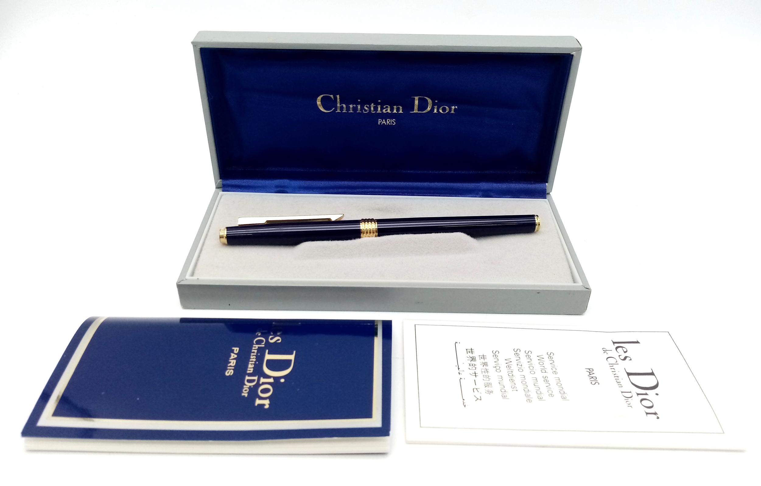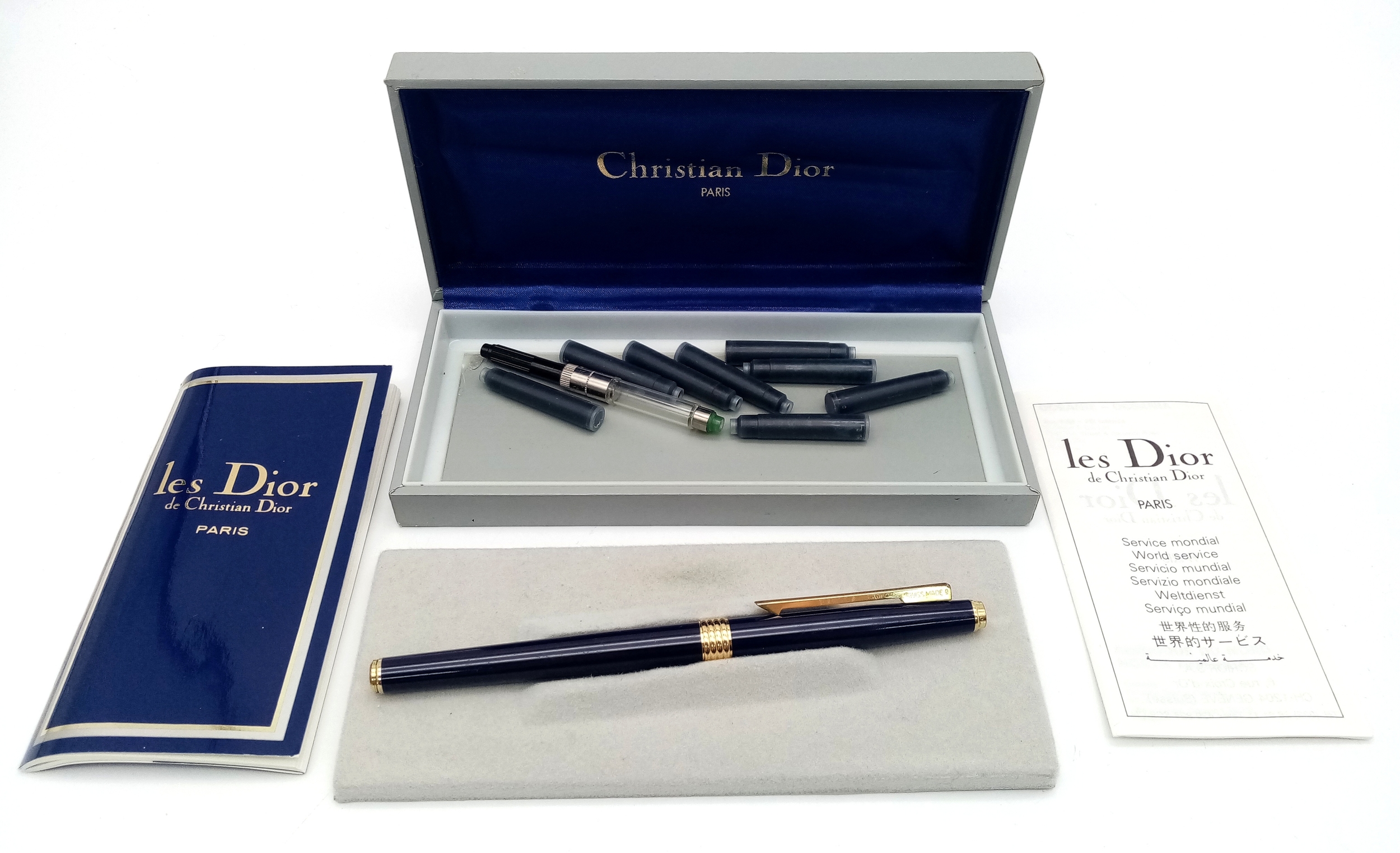 A Very Stylish Christian Dior Blue Lacquer and Gold Tone Fountain Pen 15cm Length. Complete with Box, Paperwork, Spare Cartridges and Ink System. Model CDA 920.
