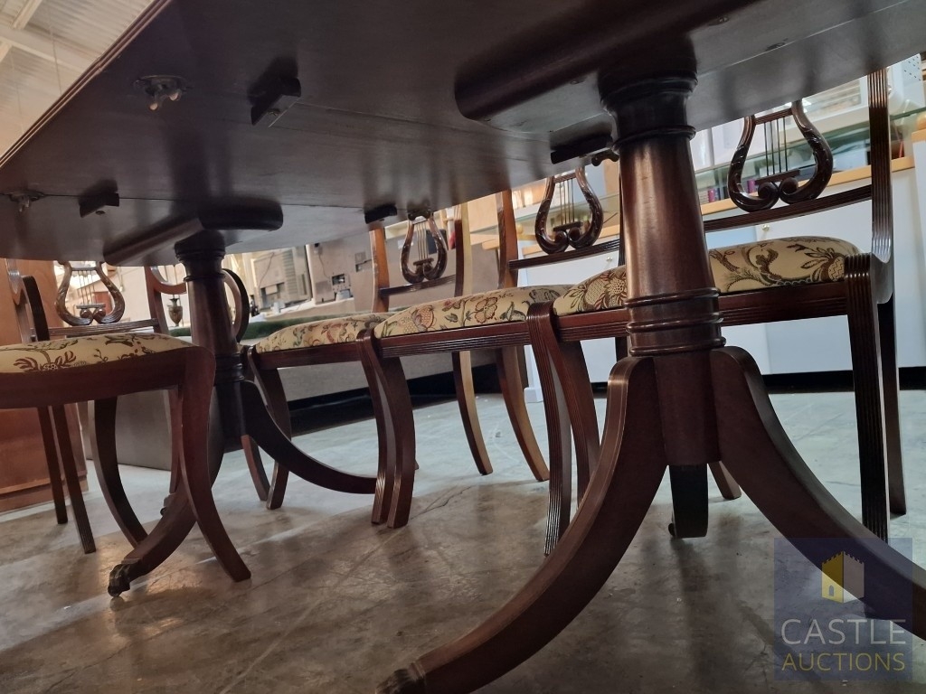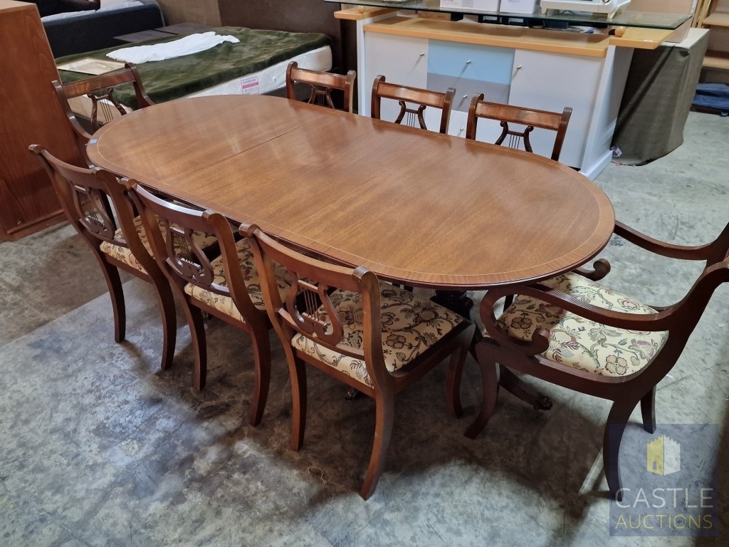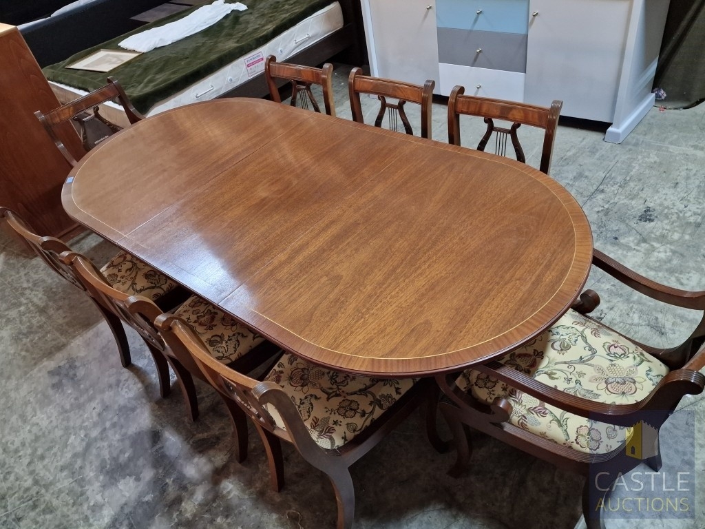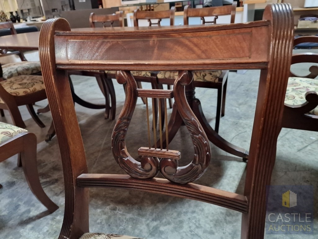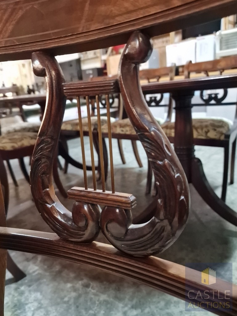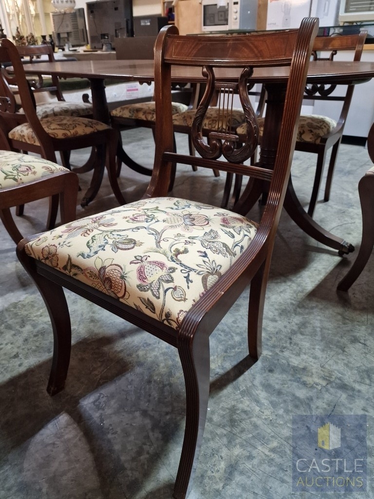 Antique Style Mahogany Oval Extending Dining Table with Twin Pedestal Base, Together with Set of 8 x Harp Back Dining Chairs with Patterned Fabric Seats, Incl. 2 x Carvers (with Arms), (Approx. 207 x 98cm), (9)