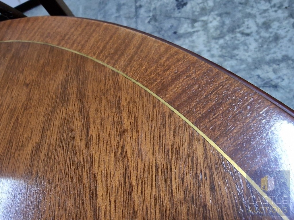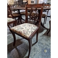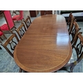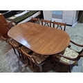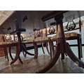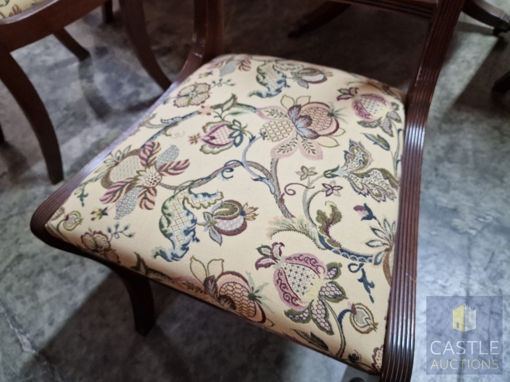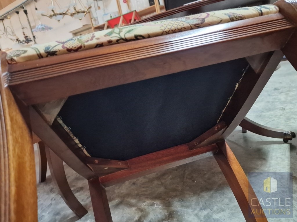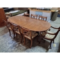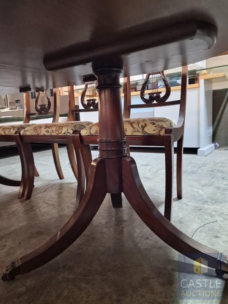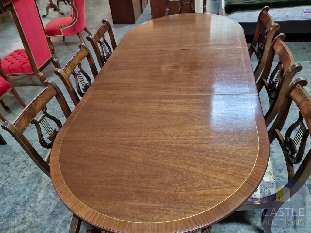 Antique Style Mahogany Oval Extending Dining Table with Twin Pedestal Base, Together with Set of 8 x Harp Back Dining Chairs with Patterned Fabric Seats, Incl. 2 x Carvers (with Arms), (Approx. 207 x 98cm), (9)
