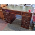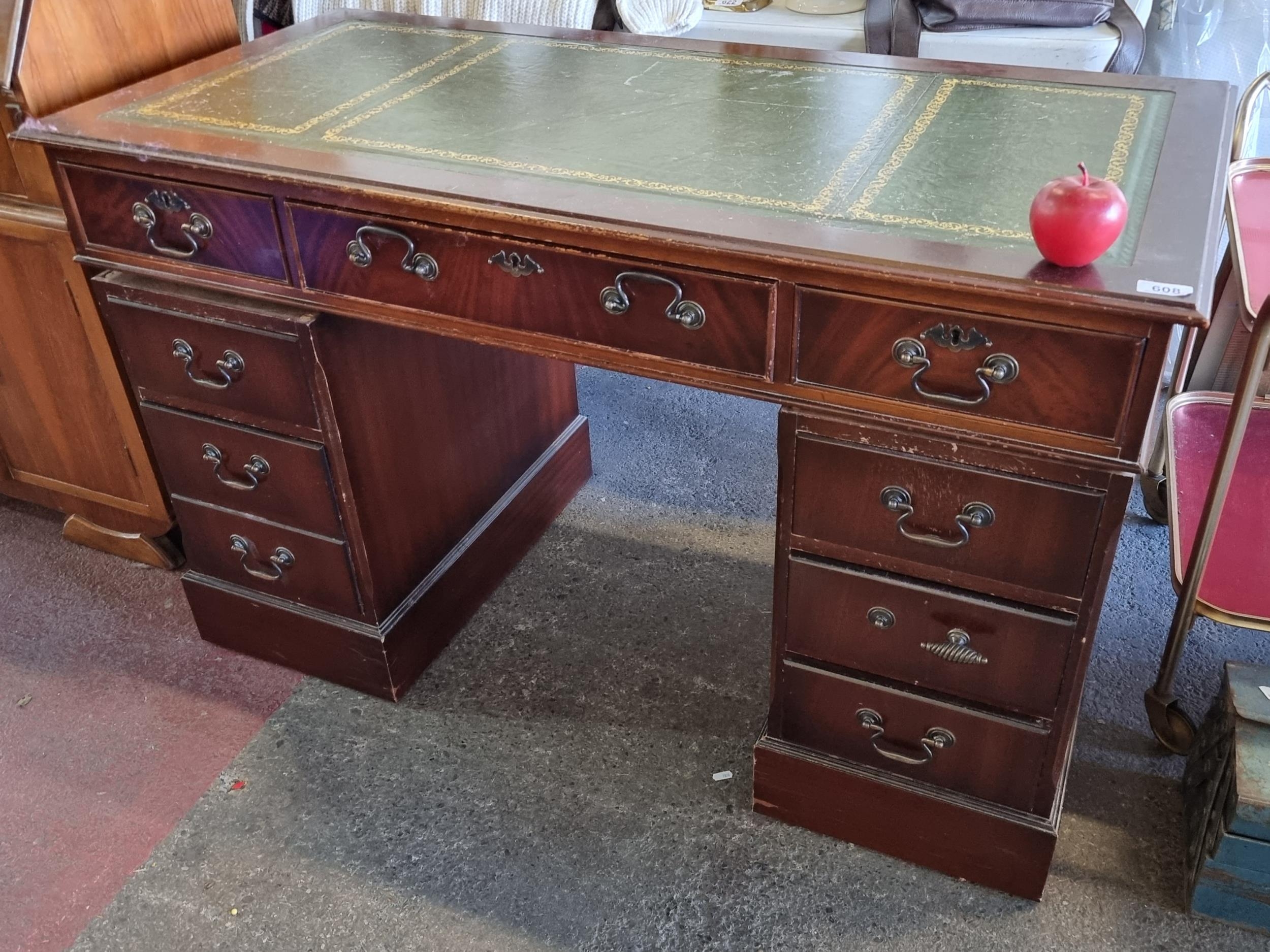 Star lot : A large antique mahogany desk with nine drawers with brass drop pull handles and a green leather writing top with gilt detail. Comes in 3 pieces for easy transport. DM H 74Cm X W 122Cm X D 60cm