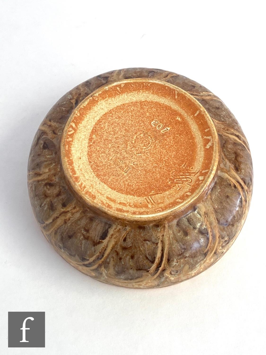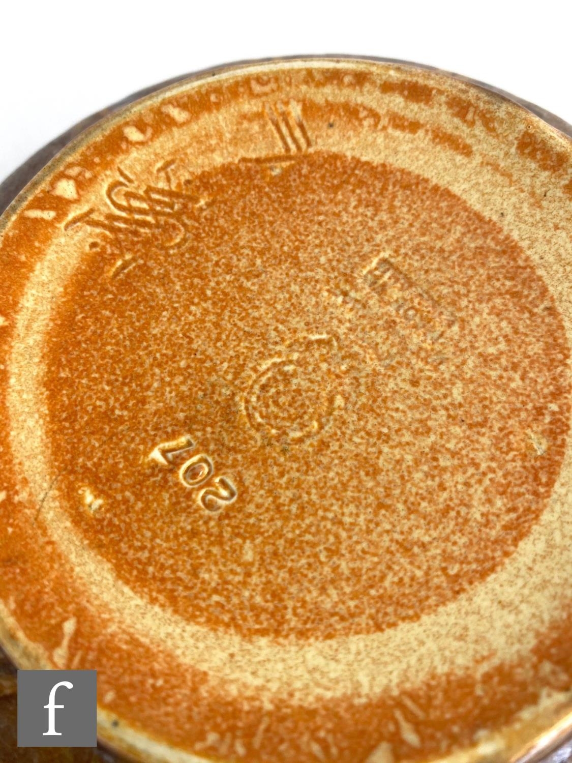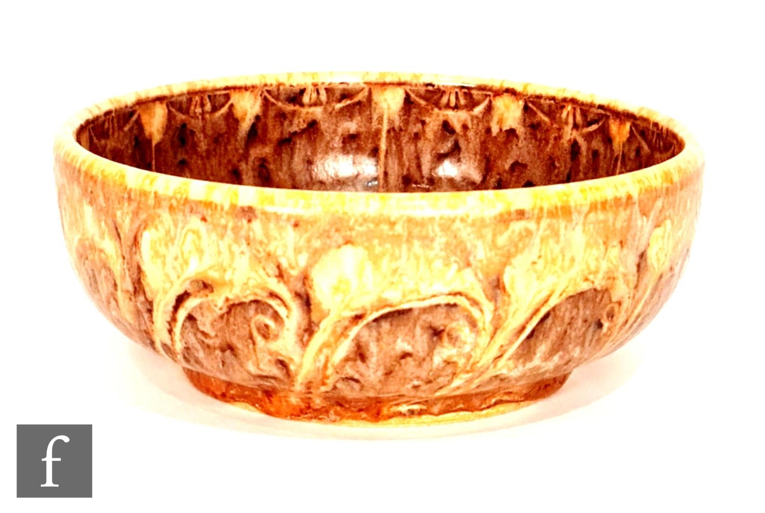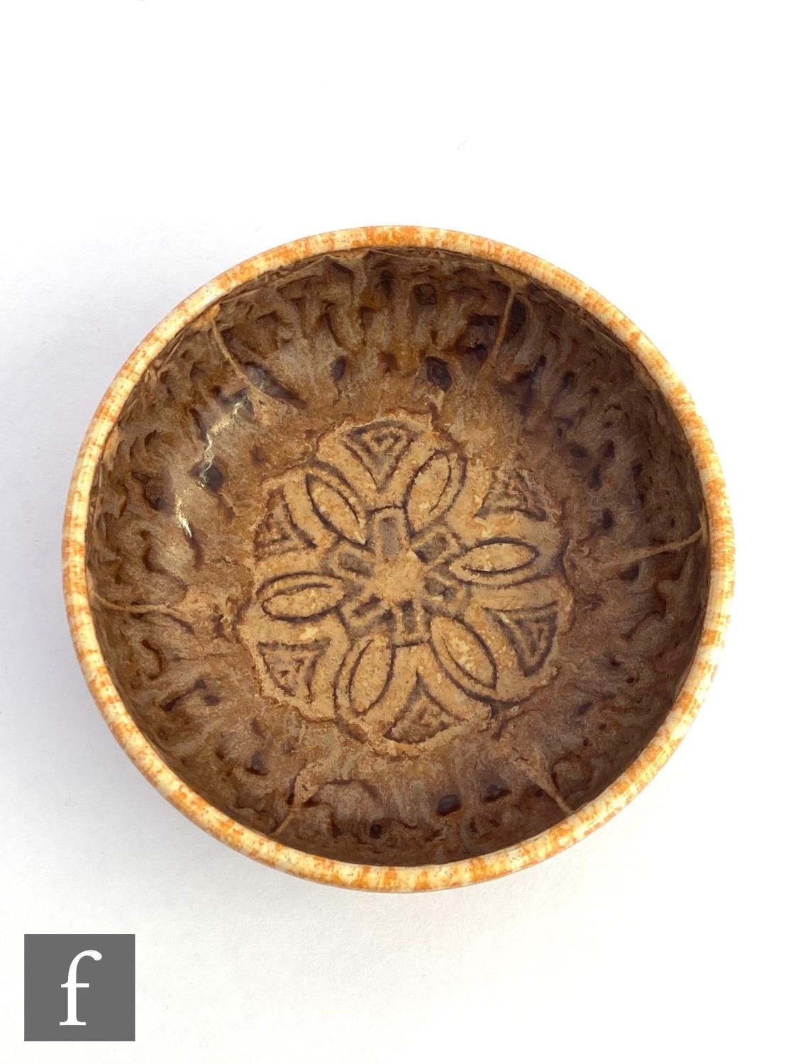 William Salter Mycock - Pilkingtons Royal Lancastrian - A shape 207 bowl decorated to the interior with a stylised flower head motif in tones of brown and orange with a dribble glaze to the side, impressed mark, diameter 15cm.