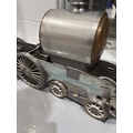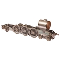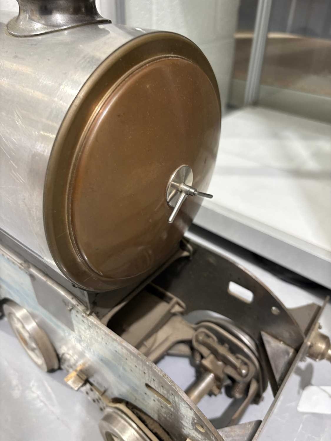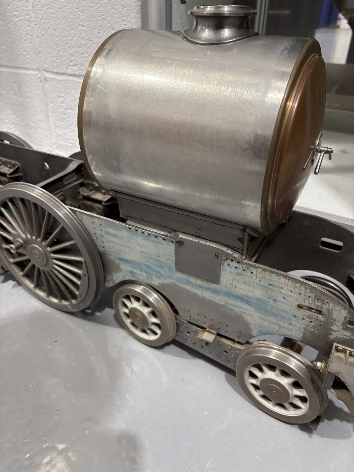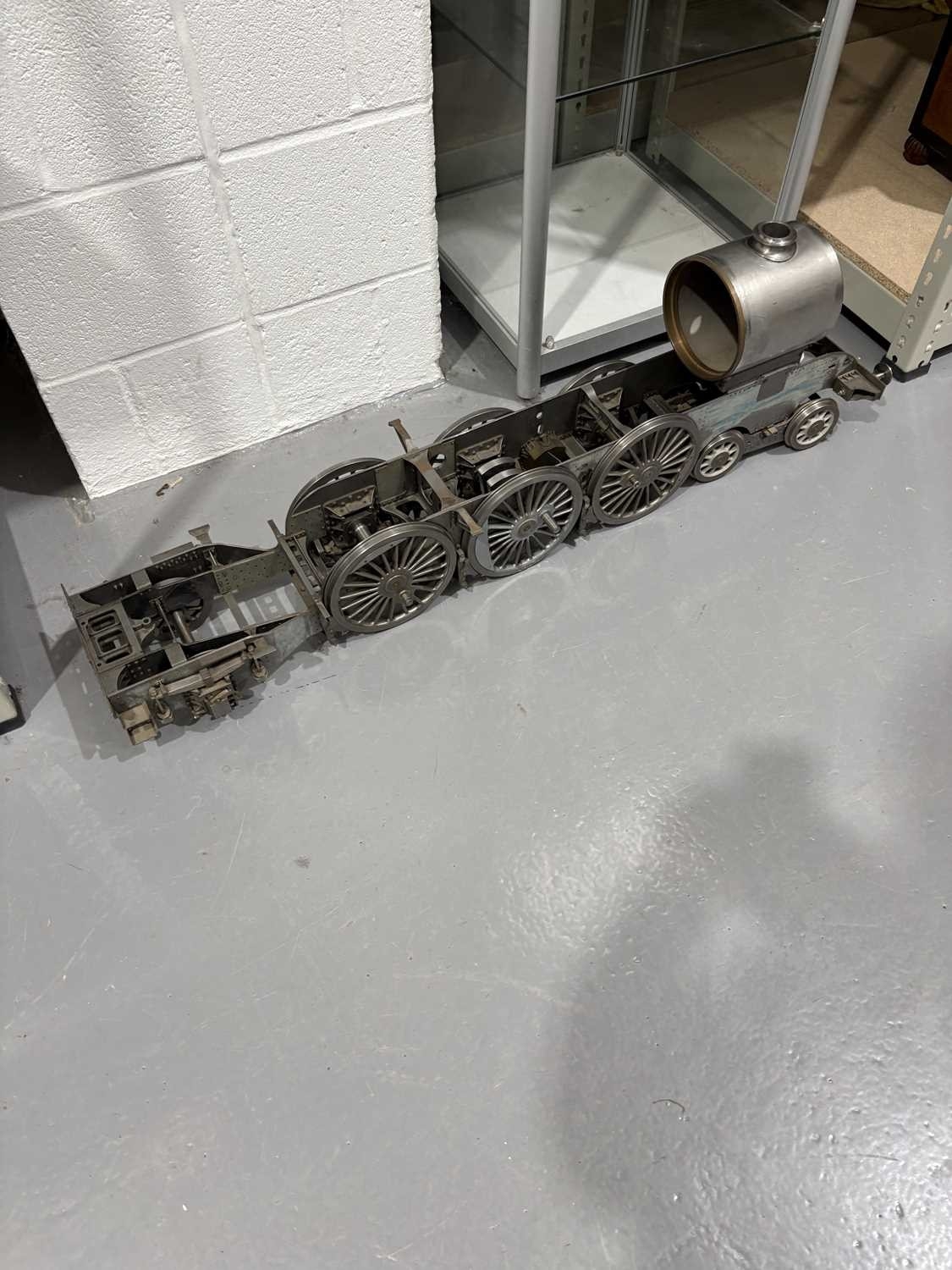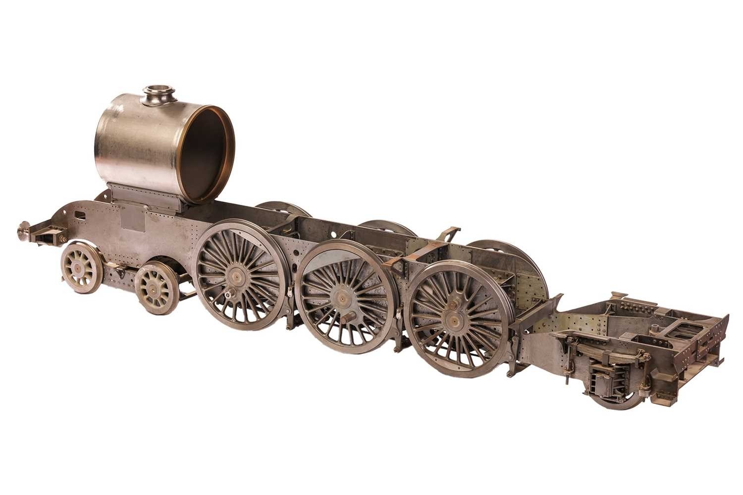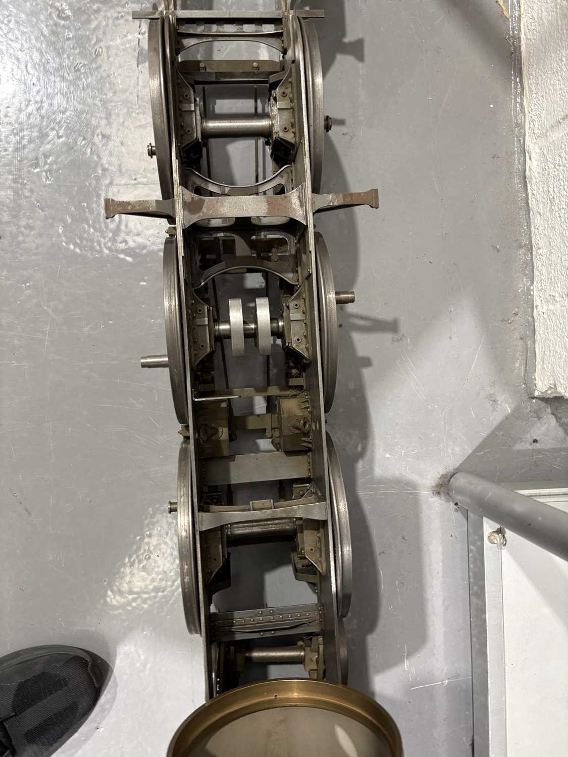 A large incomplete scratch-built 5" gauge locomotive rolling chassis with vacant boiler casing, mid-late 20th century, 36 cm high x 120 cm. From the estate of the late William John Thornton (1937-2025), of Groby, Leicestershire. Known as 'John' to his friends and family, he became interested in steam engines from an early age, and then traction engines and aircraft, before building an extensive knowledge and collection of clocks, notably early Lantern clocks and longcases. He was a very keen member of the Antiquarian Horological Society, and gave several lectures to their members at Keble College, Oxford. John was also a member of the Furniture Society in Groby village, and the Groby allotment Society, being chairman of the latter for over 30 years.