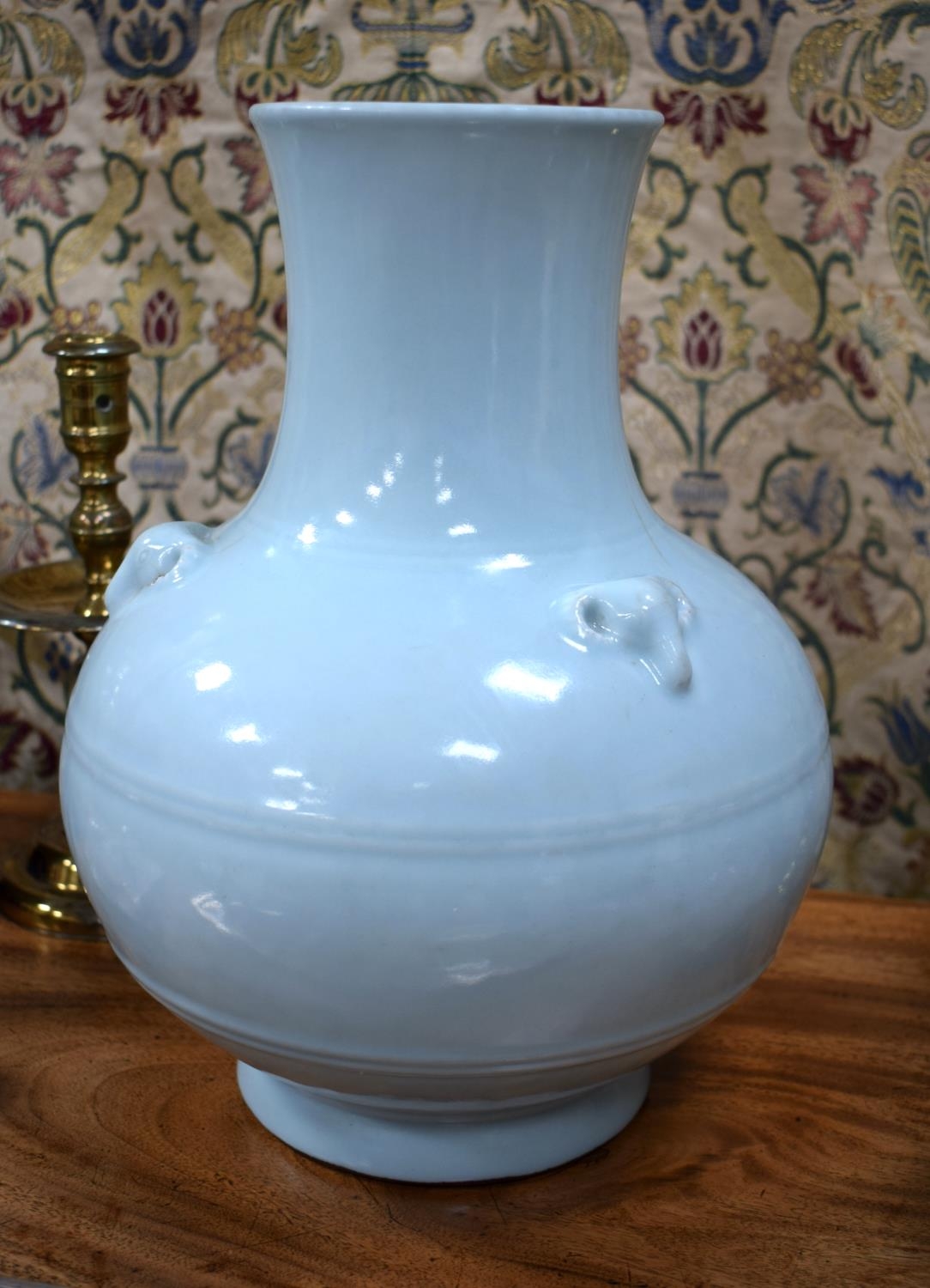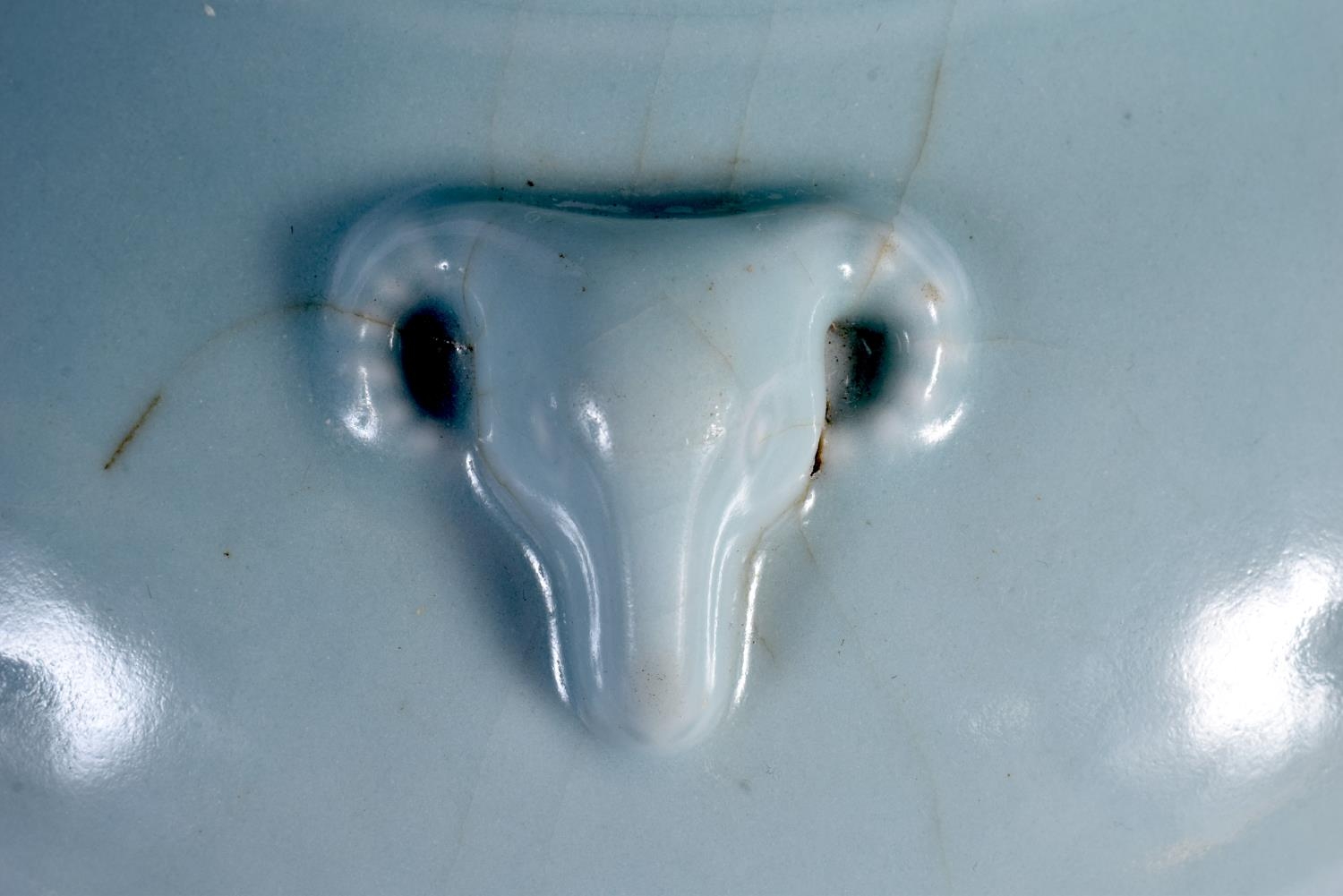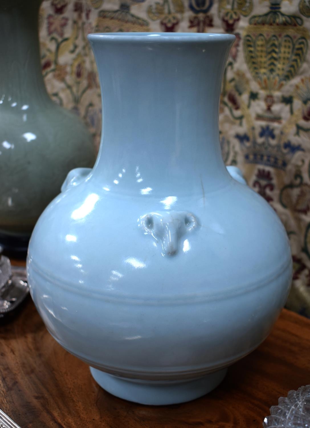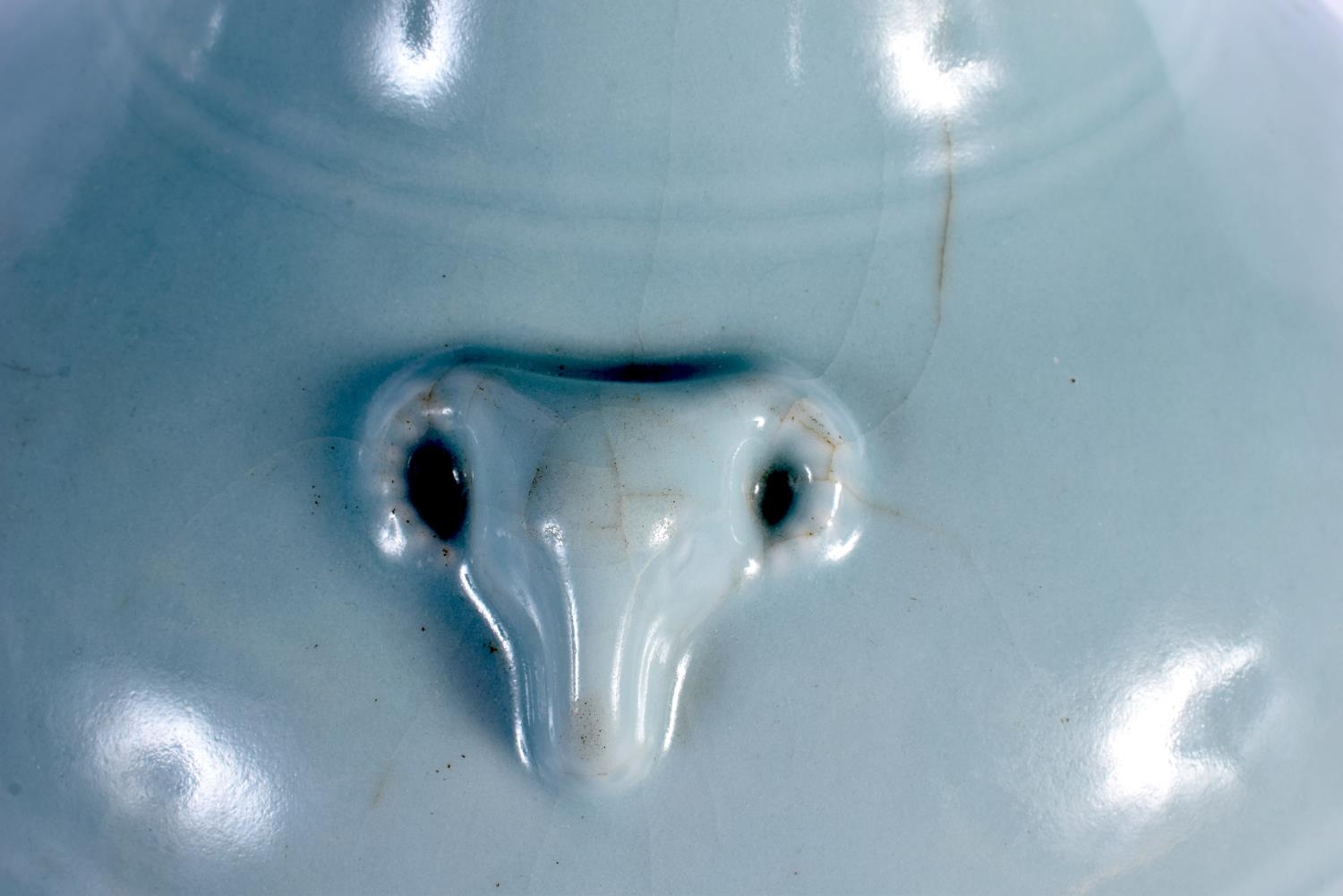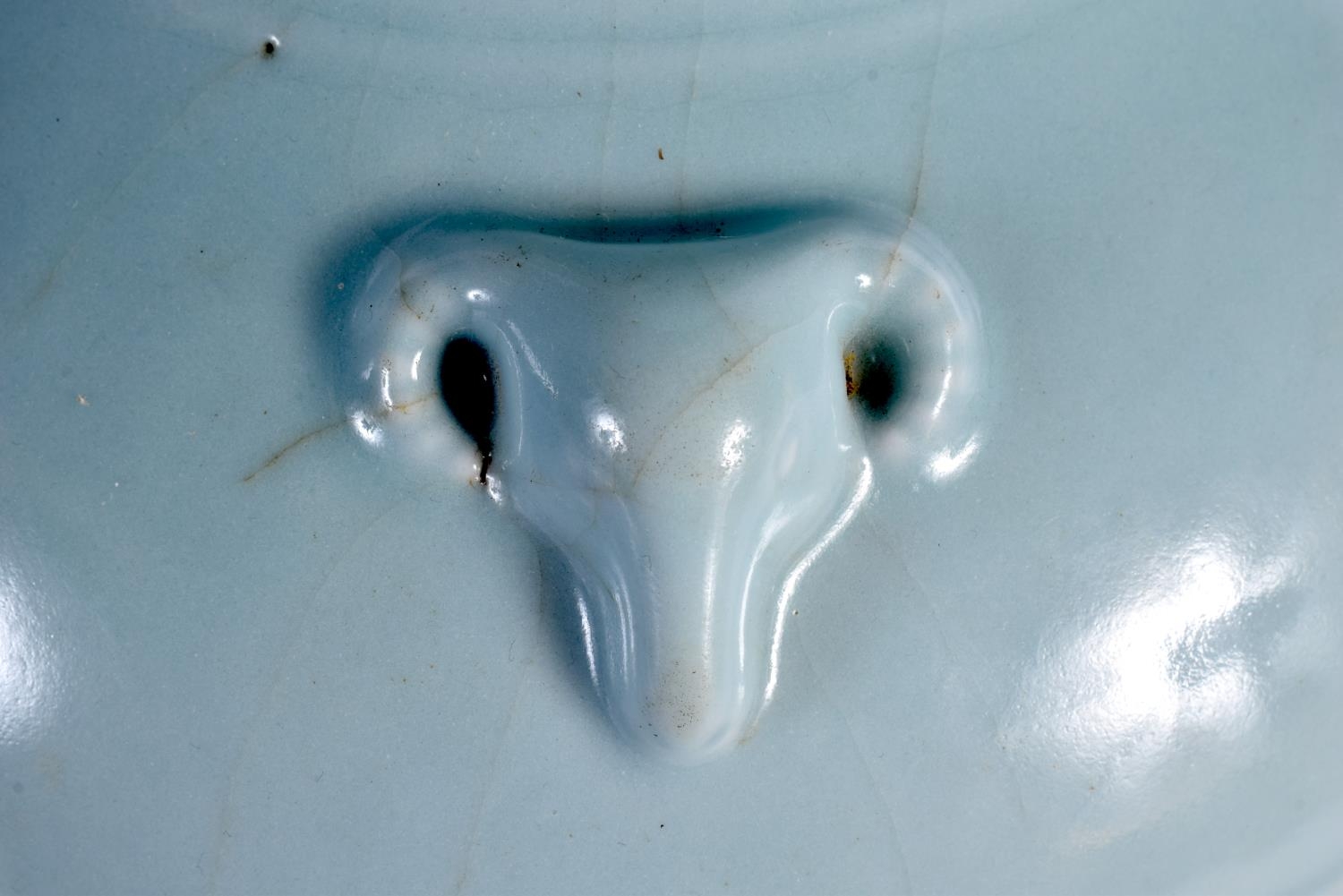 A FINE AND EXTREMELY RARE CHINESE RU-TYPE 'THREE RAMS' BULBOUS VASE Yongzheng Mark and Probably of the Period finely potted the globular body supported upon a flared foot and rising to a thick waisted neck with flared mouth encircled by two double raised fillets around the body and another at the base of the neck applied with three rams head at the shoulders covered overall with a pale blue glaze. 33 cm x 20 cm. Provenance: Private UK Residence consigned with several 17th/18th century Chinese Export pieces amongst other items European items collected principally in the 1970s and 1980s by the current vendors parents. Note: See two further vases a Yongzheng and a Qianlong example with a similar Ru-type glaze in the National Palace Museum Taipei the former published in the Illustrated Catalogue of Ch'ing Dynasty Porcelain in the National Palace Museum: K'ang-hsi Ware and Yung-cheng Ware Tokyo 1980 pl. 129 the latter included in the Museum's exhibition Qingdai danseyou ciqi /Special Exhibition of Ch'ing Dynasty Monochrome Porcelains in the National Palace Museum Taipei 1989 cat. no. 88. Another Qianlong vase with a Guan-type glaze in the Walters Art Gallery Baltimore is published in S.W. Bushell Oriental Ceramic Art London 1981 (1896) col. pl. LXXVII. For a teadust glazed 'three ram' vase of Qianlong mark and period see one from the collections of T.Y. Chao and Ira and Nancy Koger sold three times in Sotheby's 1979 1986 and 1992 and once in their New York rooms 1990 illustrated in Sotheby's. Thirty Years in Hong Kong Hong Kong 2003 pl. 157.