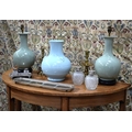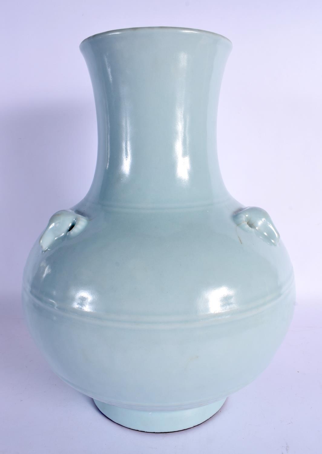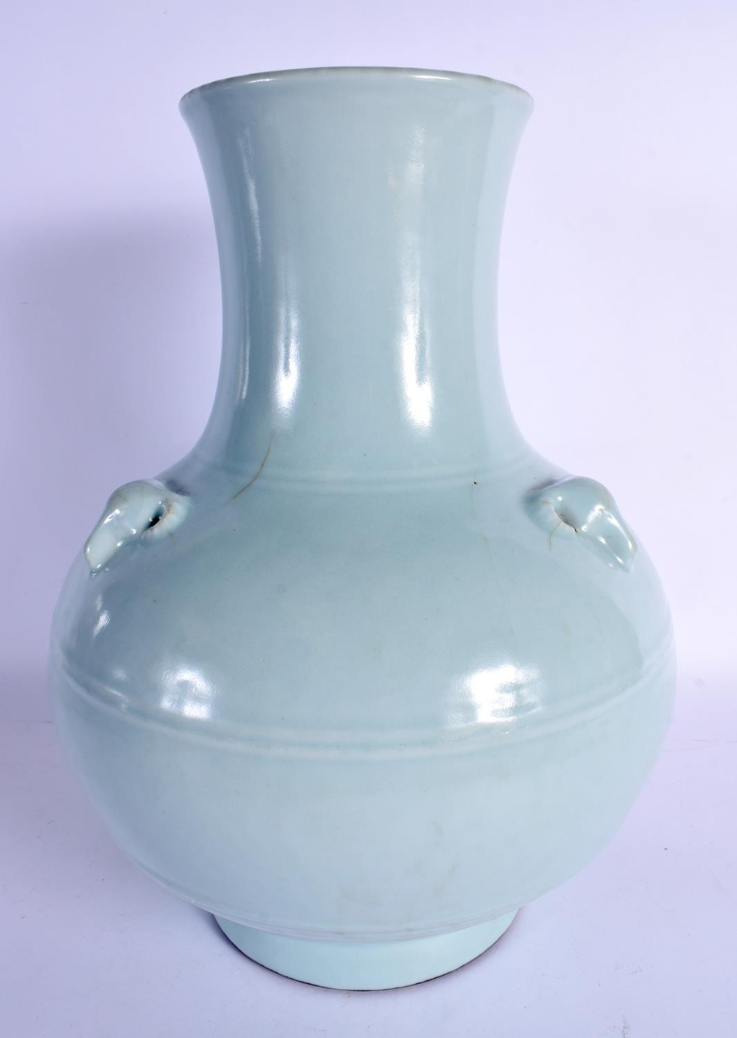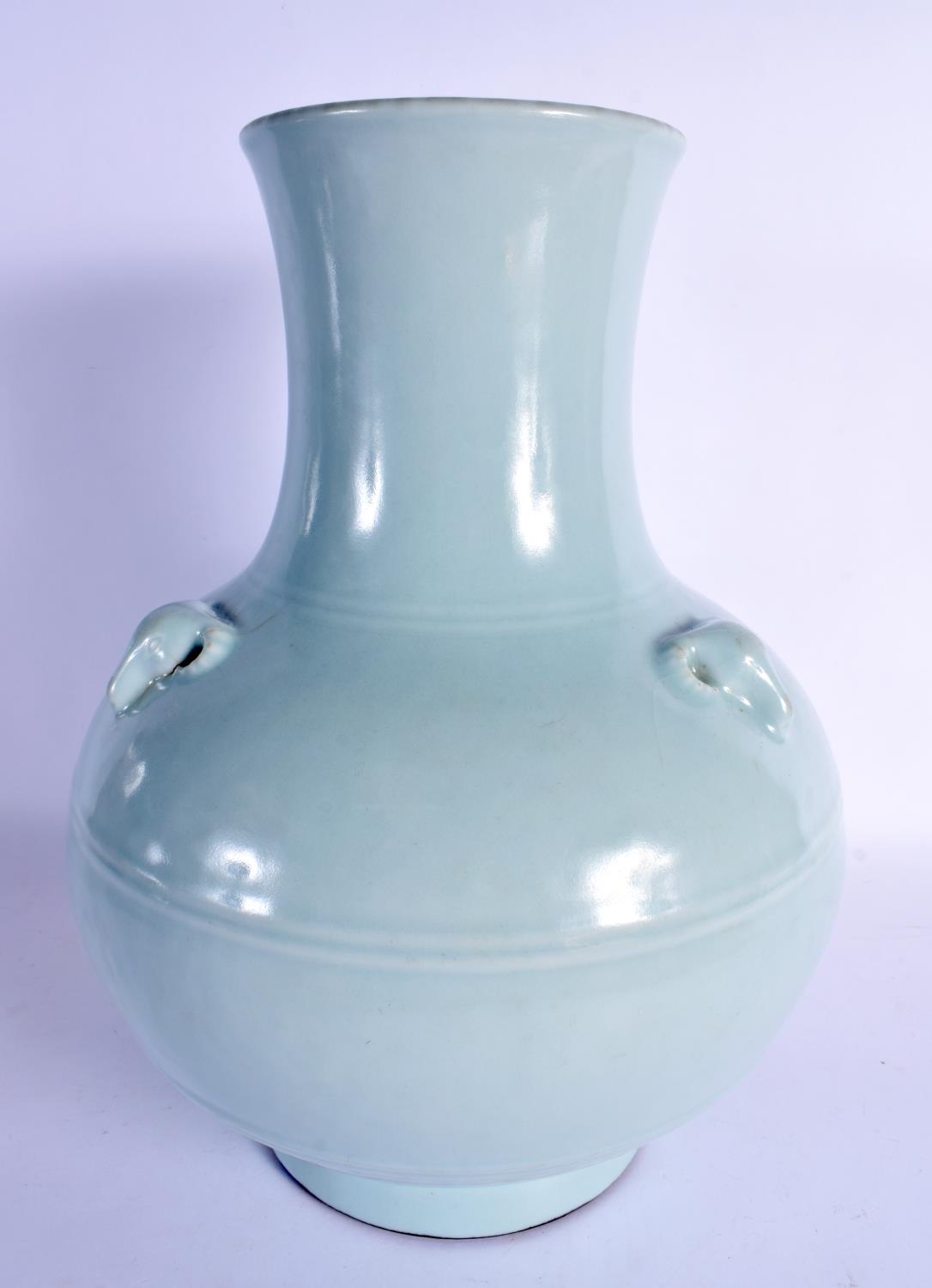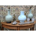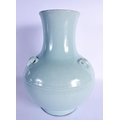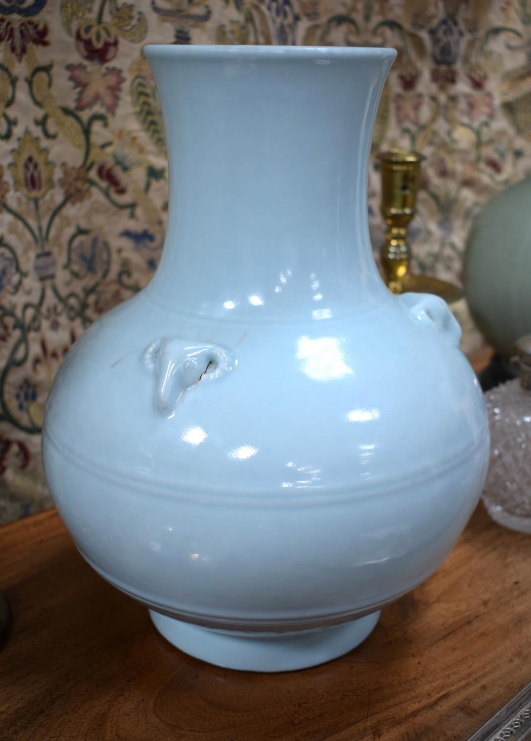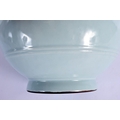 A FINE AND EXTREMELY RARE CHINESE RU-TYPE 'THREE RAMS' BULBOUS VASE Yongzheng Mark and Probably of the Period finely potted the globular body supported upon a flared foot and rising to a thick waisted neck with flared mouth encircled by two double raised fillets around the body and another at the base of the neck applied with three rams head at the shoulders covered overall with a pale blue glaze. 33 cm x 20 cm. Provenance: Private UK Residence consigned with several 17th/18th century Chinese Export pieces amongst other items European items collected principally in the 1970s and 1980s by the current vendors parents. Note: See two further vases a Yongzheng and a Qianlong example with a similar Ru-type glaze in the National Palace Museum Taipei the former published in the Illustrated Catalogue of Ch'ing Dynasty Porcelain in the National Palace Museum: K'ang-hsi Ware and Yung-cheng Ware Tokyo 1980 pl. 129 the latter included in the Museum's exhibition Qingdai danseyou ciqi /Special Exhibition of Ch'ing Dynasty Monochrome Porcelains in the National Palace Museum Taipei 1989 cat. no. 88. Another Qianlong vase with a Guan-type glaze in the Walters Art Gallery Baltimore is published in S.W. Bushell Oriental Ceramic Art London 1981 (1896) col. pl. LXXVII. For a teadust glazed 'three ram' vase of Qianlong mark and period see one from the collections of T.Y. Chao and Ira and Nancy Koger sold three times in Sotheby's 1979 1986 and 1992 and once in their New York rooms 1990 illustrated in Sotheby's. Thirty Years in Hong Kong Hong Kong 2003 pl. 157.