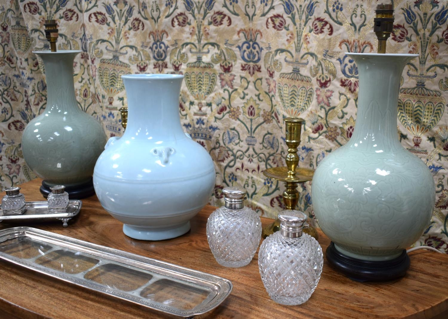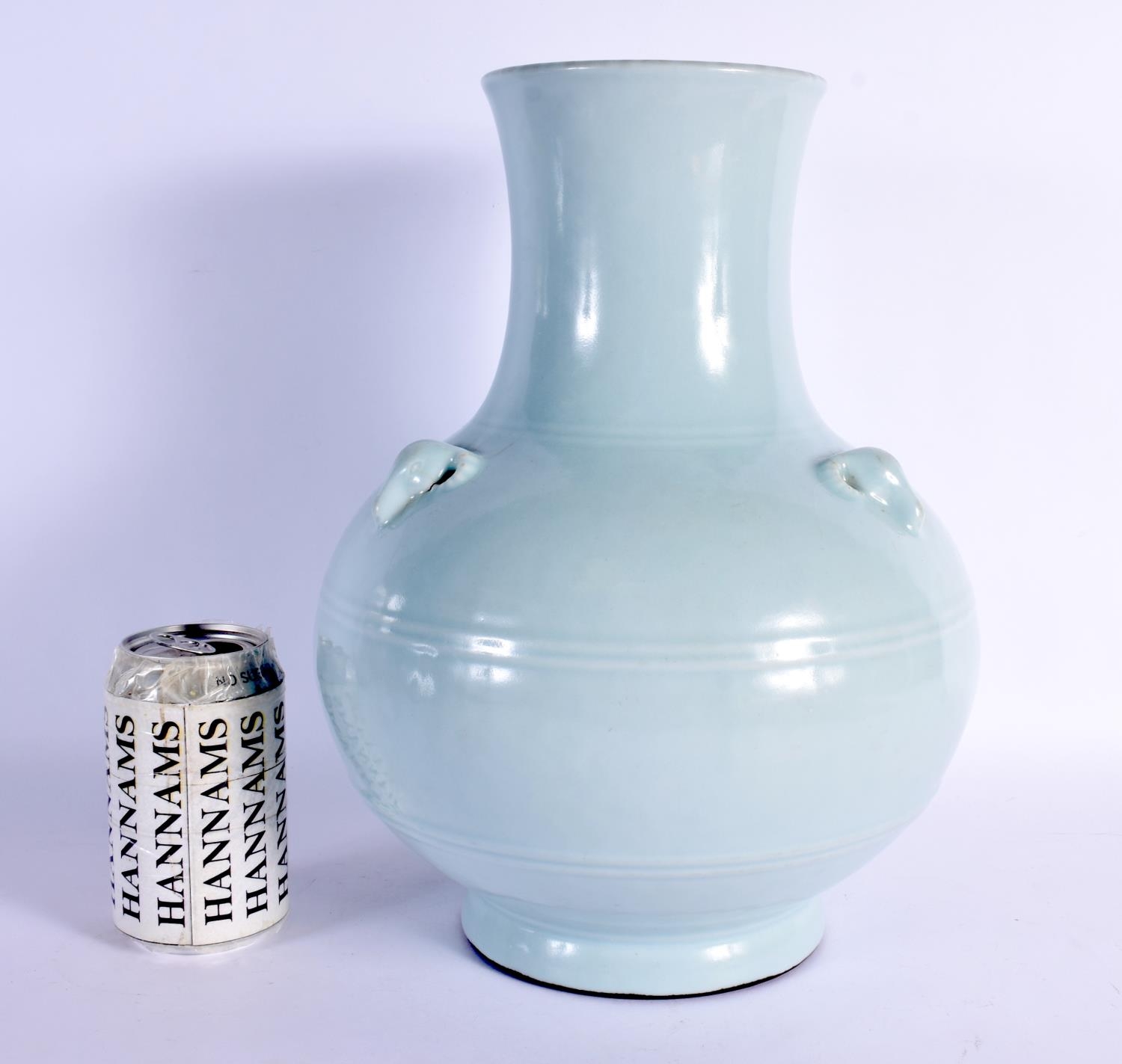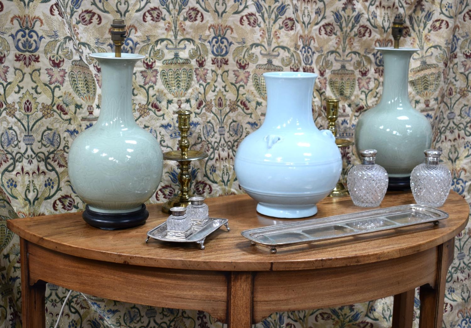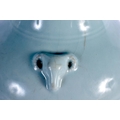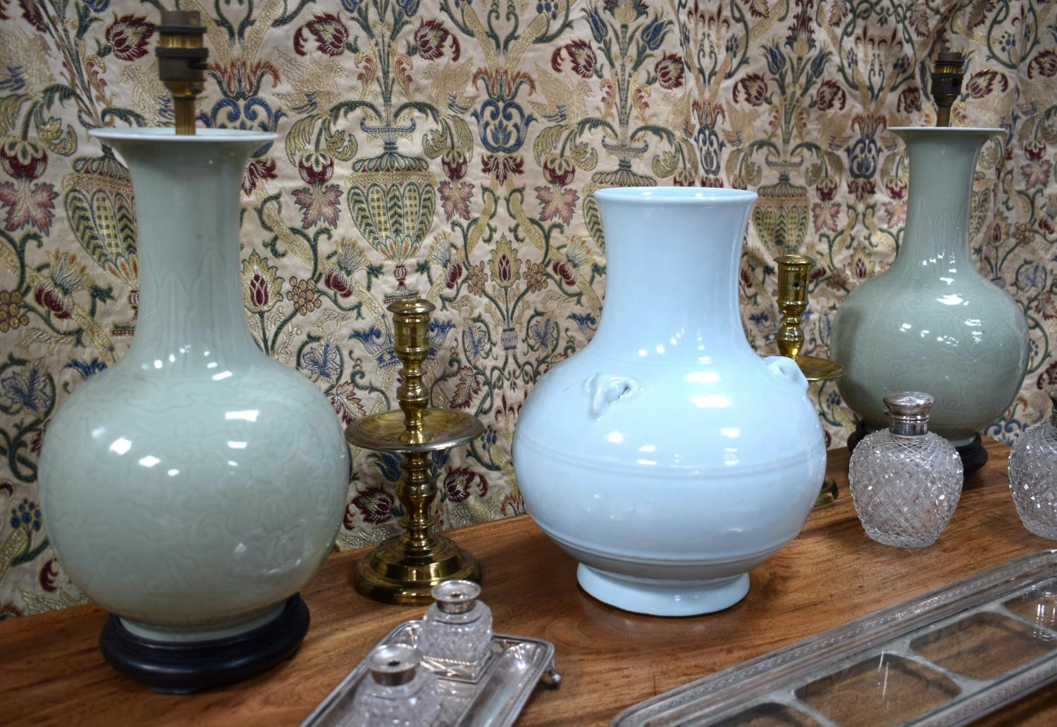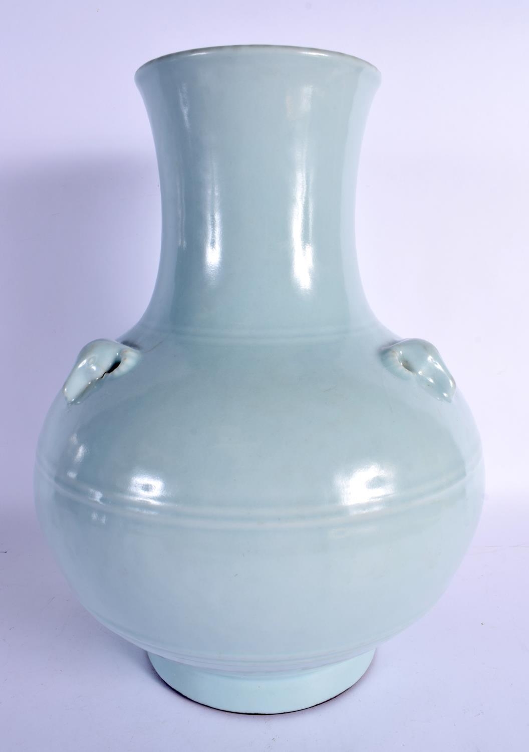 A FINE AND EXTREMELY RARE CHINESE RU-TYPE 'THREE RAMS' BULBOUS VASE Yongzheng Mark and Probably of the Period finely potted the globular body supported upon a flared foot and rising to a thick waisted neck with flared mouth encircled by two double raised fillets around the body and another at the base of the neck applied with three rams head at the shoulders covered overall with a pale blue glaze. 33 cm x 20 cm. Provenance: Private UK Residence consigned with several 17th/18th century Chinese Export pieces amongst other items European items collected principally in the 1970s and 1980s by the current vendors parents. Note: See two further vases a Yongzheng and a Qianlong example with a similar Ru-type glaze in the National Palace Museum Taipei the former published in the Illustrated Catalogue of Ch'ing Dynasty Porcelain in the National Palace Museum: K'ang-hsi Ware and Yung-cheng Ware Tokyo 1980 pl. 129 the latter included in the Museum's exhibition Qingdai danseyou ciqi /Special Exhibition of Ch'ing Dynasty Monochrome Porcelains in the National Palace Museum Taipei 1989 cat. no. 88. Another Qianlong vase with a Guan-type glaze in the Walters Art Gallery Baltimore is published in S.W. Bushell Oriental Ceramic Art London 1981 (1896) col. pl. LXXVII. For a teadust glazed 'three ram' vase of Qianlong mark and period see one from the collections of T.Y. Chao and Ira and Nancy Koger sold three times in Sotheby's 1979 1986 and 1992 and once in their New York rooms 1990 illustrated in Sotheby's. Thirty Years in Hong Kong Hong Kong 2003 pl. 157.