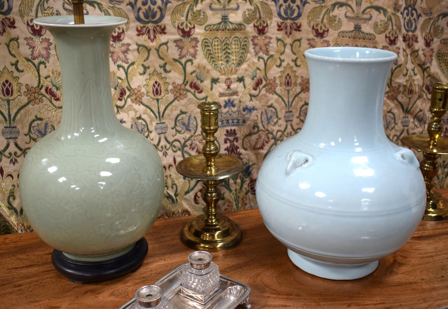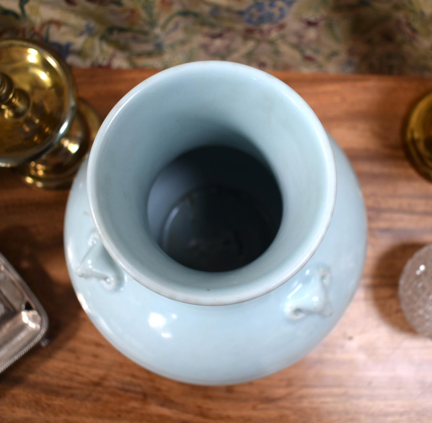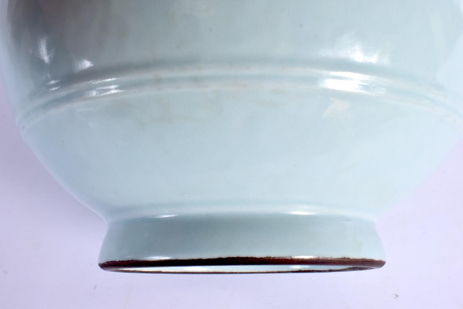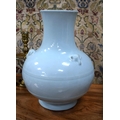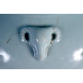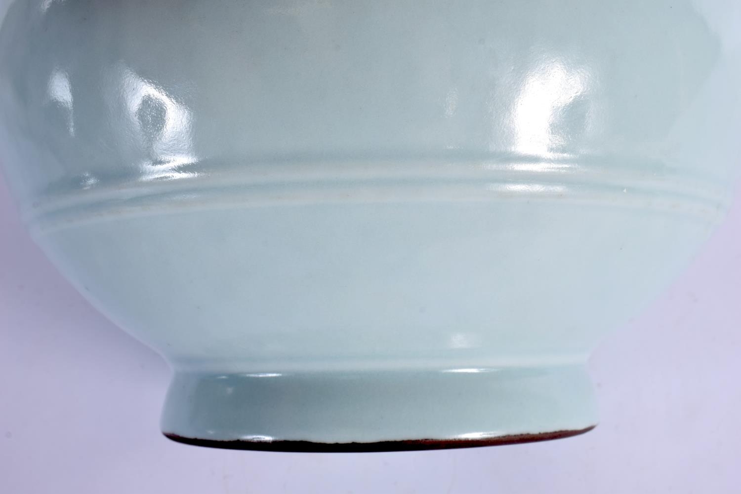 A FINE AND EXTREMELY RARE CHINESE RU-TYPE 'THREE RAMS' BULBOUS VASE Yongzheng Mark and Probably of the Period finely potted the globular body supported upon a flared foot and rising to a thick waisted neck with flared mouth encircled by two double raised fillets around the body and another at the base of the neck applied with three rams head at the shoulders covered overall with a pale blue glaze. 33 cm x 20 cm. Provenance: Private UK Residence consigned with several 17th/18th century Chinese Export pieces amongst other items European items collected principally in the 1970s and 1980s by the current vendors parents. Note: See two further vases a Yongzheng and a Qianlong example with a similar Ru-type glaze in the National Palace Museum Taipei the former published in the Illustrated Catalogue of Ch'ing Dynasty Porcelain in the National Palace Museum: K'ang-hsi Ware and Yung-cheng Ware Tokyo 1980 pl. 129 the latter included in the Museum's exhibition Qingdai danseyou ciqi /Special Exhibition of Ch'ing Dynasty Monochrome Porcelains in the National Palace Museum Taipei 1989 cat. no. 88. Another Qianlong vase with a Guan-type glaze in the Walters Art Gallery Baltimore is published in S.W. Bushell Oriental Ceramic Art London 1981 (1896) col. pl. LXXVII. For a teadust glazed 'three ram' vase of Qianlong mark and period see one from the collections of T.Y. Chao and Ira and Nancy Koger sold three times in Sotheby's 1979 1986 and 1992 and once in their New York rooms 1990 illustrated in Sotheby's. Thirty Years in Hong Kong Hong Kong 2003 pl. 157.