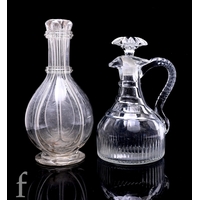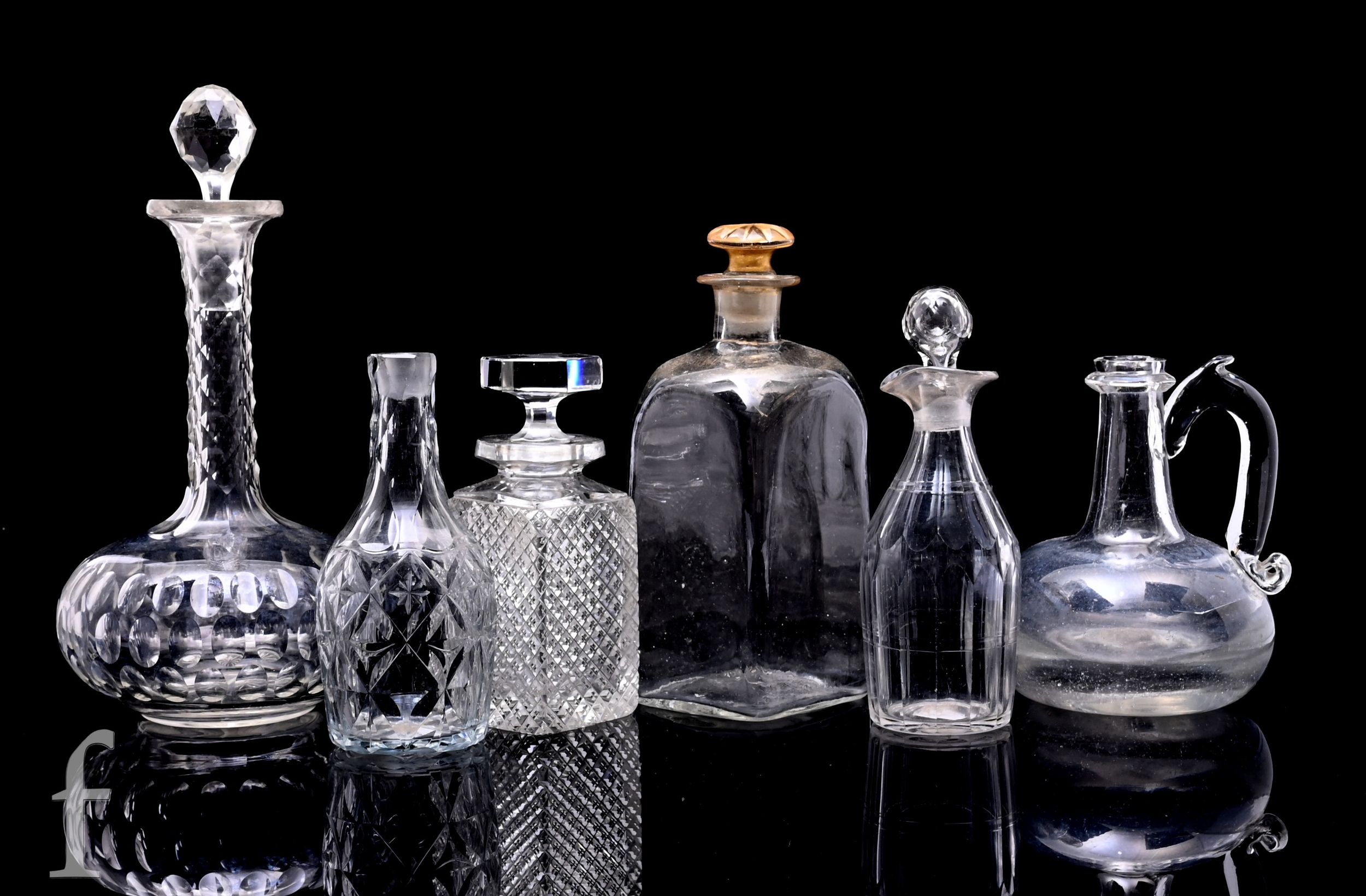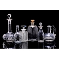 A 19th Century clear crystal globe and shaft decanter with printie cut triple band, below diaper cut neck, facet cut stopper, height 26cm, a small facet cut condiment bottle, height 15cm, a facet cut pouring condiment bottle with stopper, height 17cm, a spirit decanter and associated stopper of square form cut with strawberry diamond pattern and etched for the Haberdashers company 1885, height 14.5cm, an earlier clear handled flask and a continental decanter and stopper of square form with gilt decoration, height 20cm. (6)