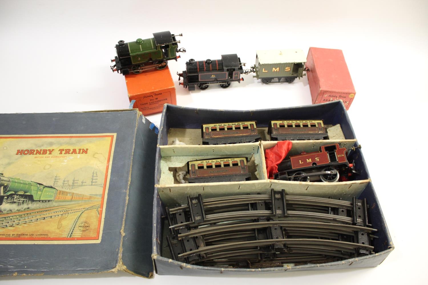 HORNBY 0 GAUGE including No 101 Tank Passenger Set comprising Type 101 0-4-0 LMS maroon No 2270 Tank loco, 0-4-0 LNER No 460 Tank Loco, 3 Pullman coaches and selection of track. Together with Type 40 0-4-0 BR black No 82011 tank locomotive (boxed) and an LMS brake van (boxed).