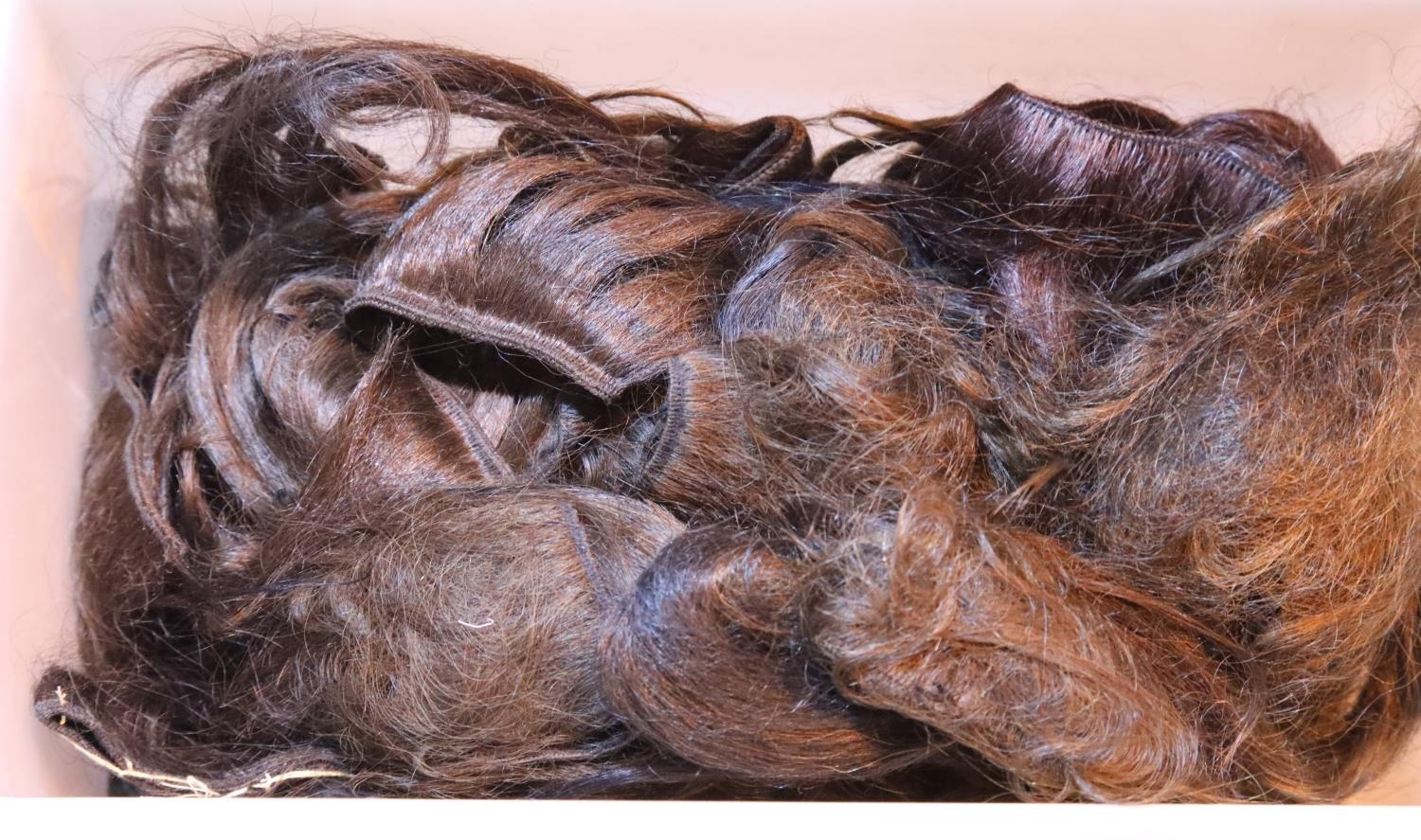 Box containing a selection of ladies hair pieces. Not available for in-house P&P
